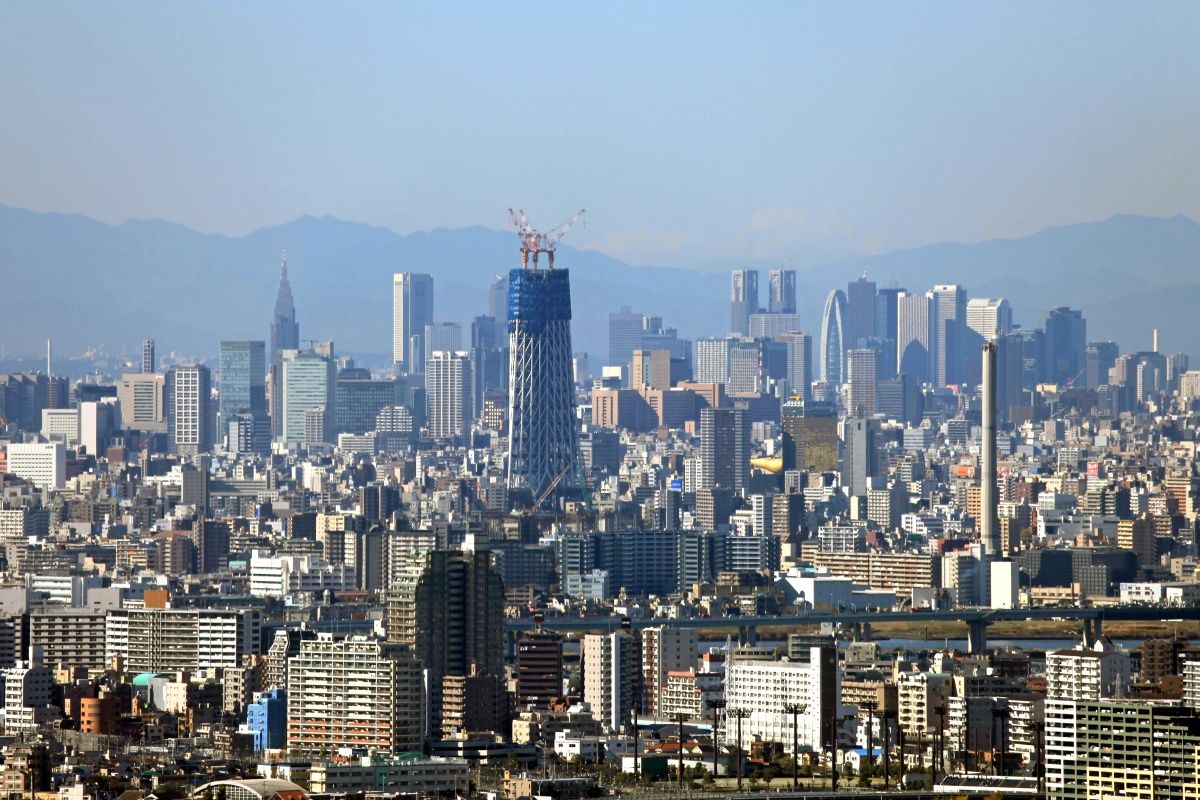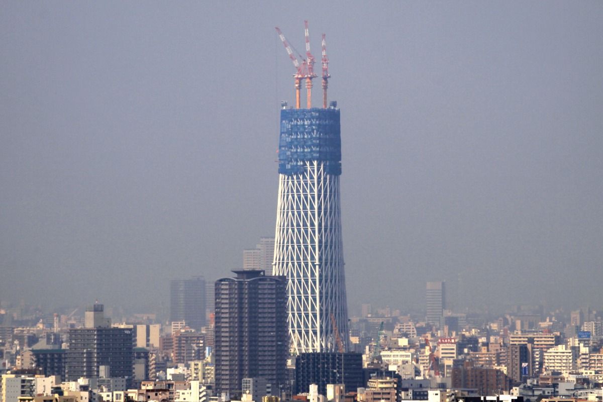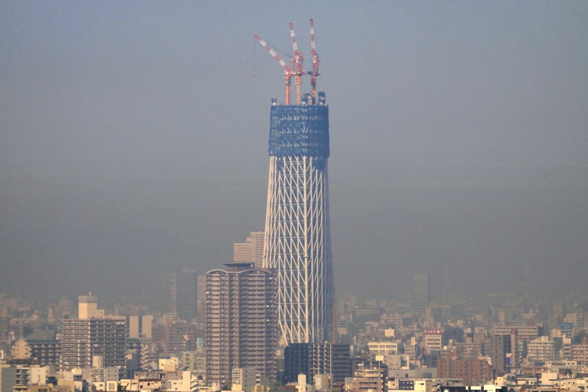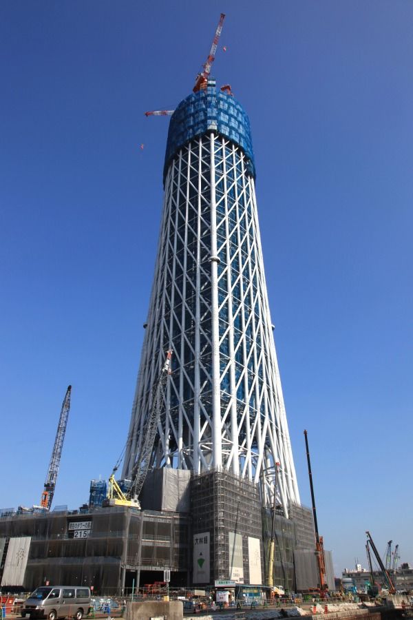 低層部は鉄骨の中のシートの外されて、背後の青空も見えてキレイです。上の方までこのようにシートが外されたスカイツリーは結構格好いいでしょうね。