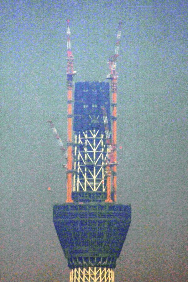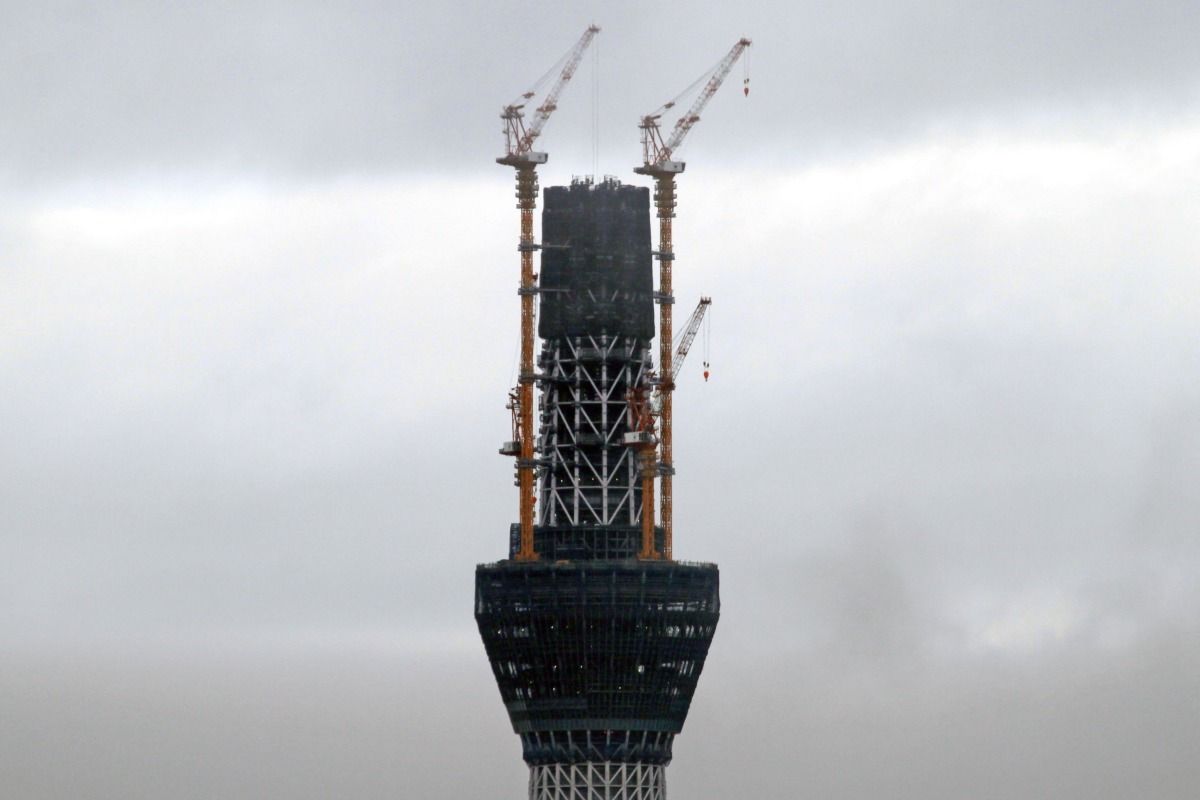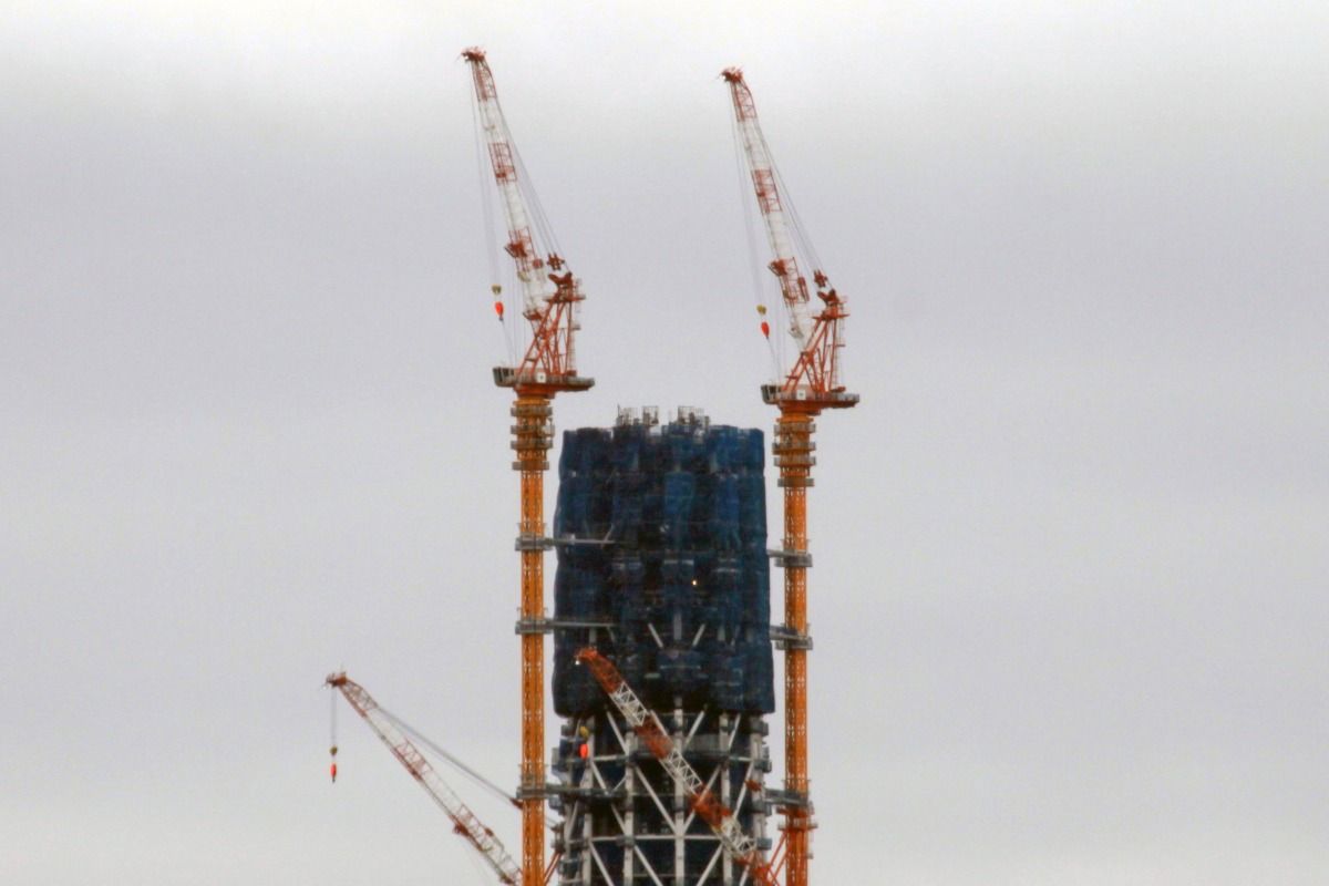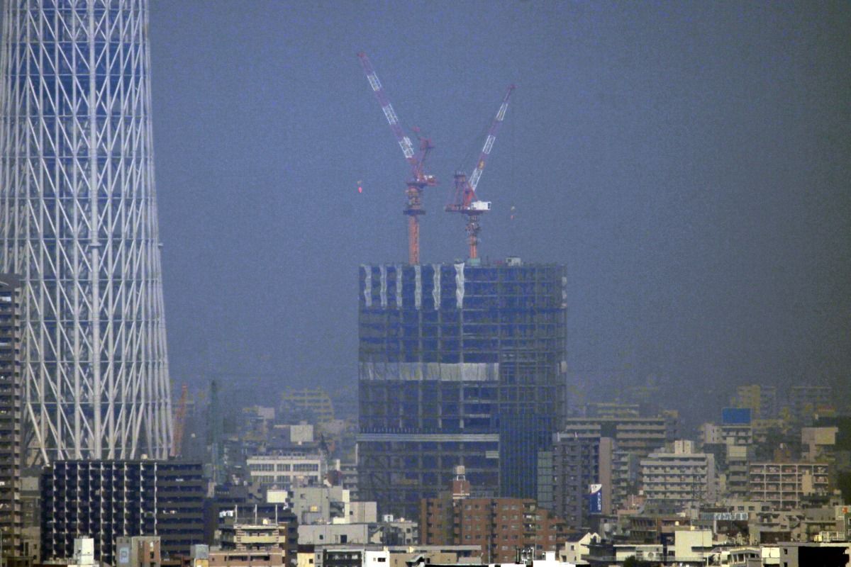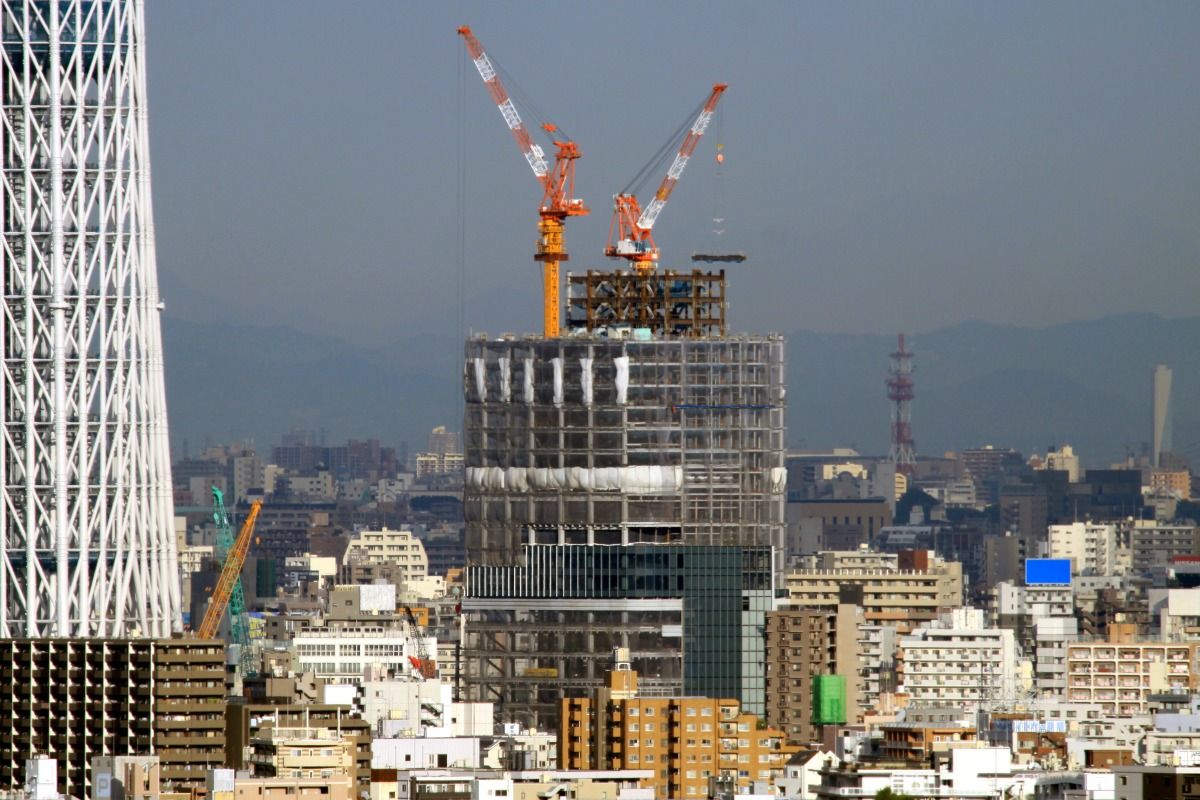 オフィス棟側の超望遠です。20~22階部分の鉄骨がどんどん組まれて行っています。左に写っているスカイツリーの航空障害灯の位置(柱に小さなデッキのような物が付いている場所)が高さ100mなので、オフィス棟の高さは100mを超えていますね。