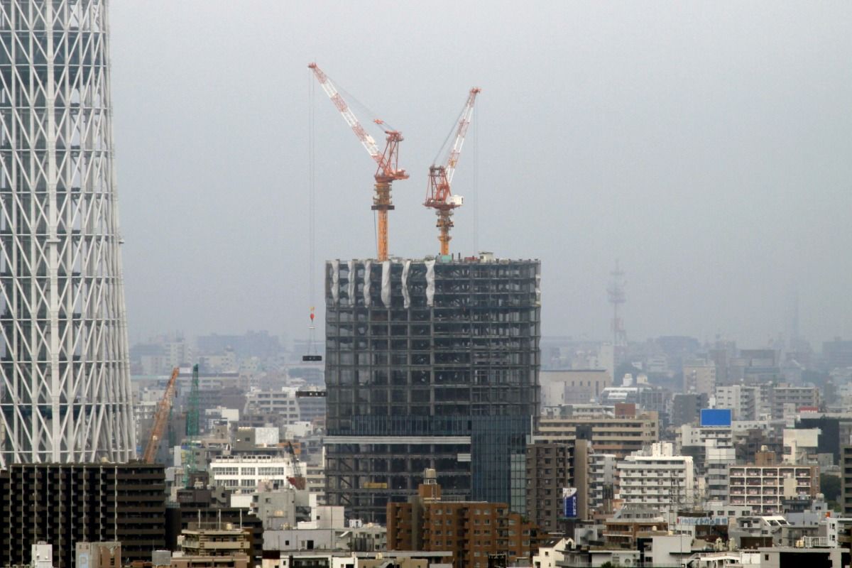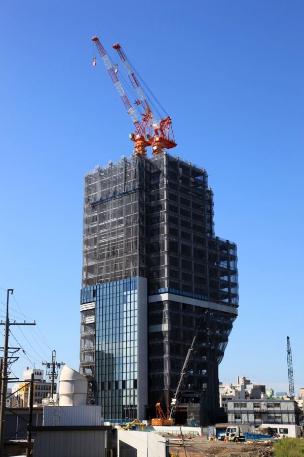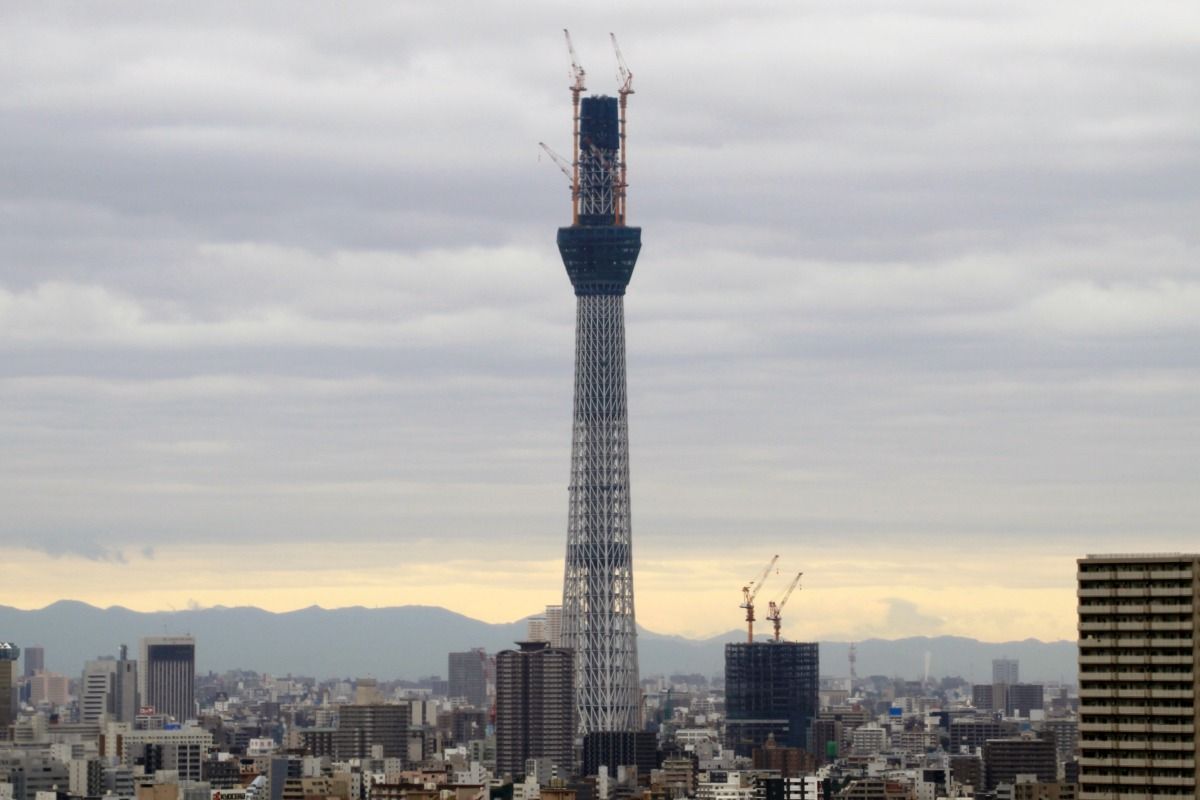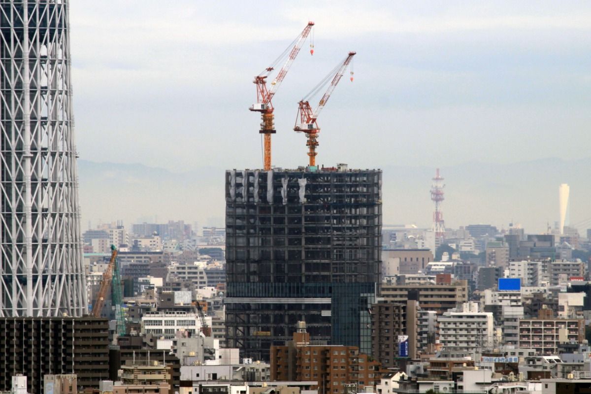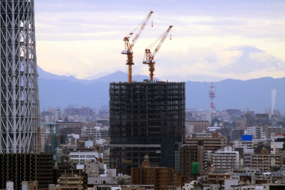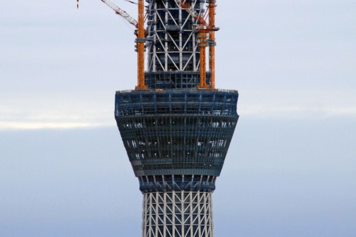 オフィス棟側の超望遠です。20~22階部分の鉄骨がどんどん組まれて行っています。左に写っているスカイツリーの航空障害灯の位置(柱に小さなデッキのような物が付いている場所)が高さ100mなので、オフィス棟の高さは100mを超えていますね。