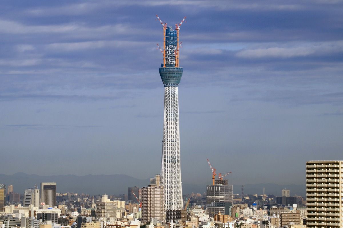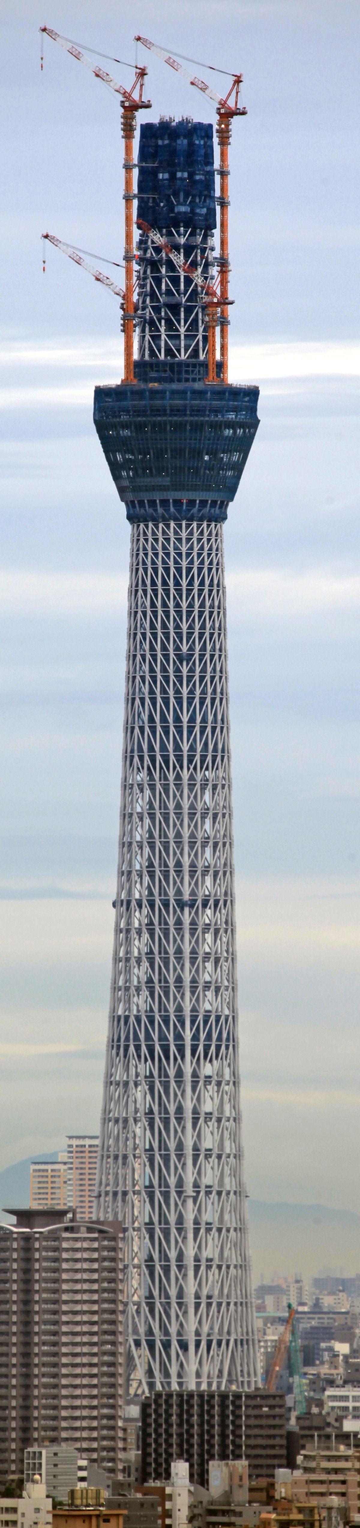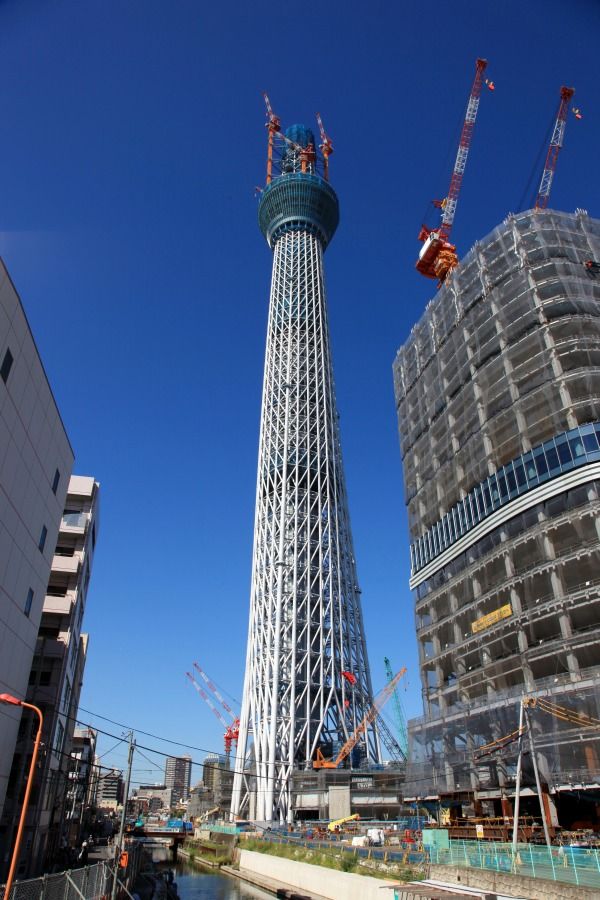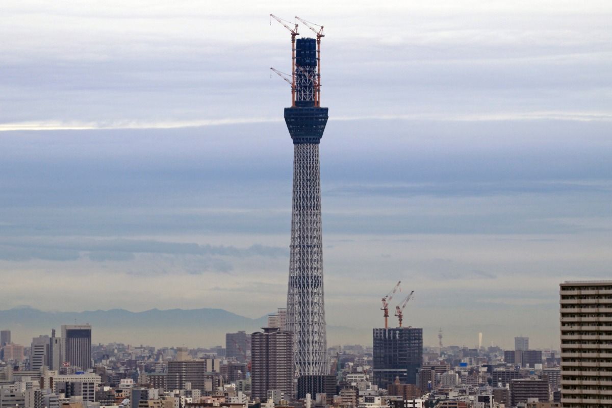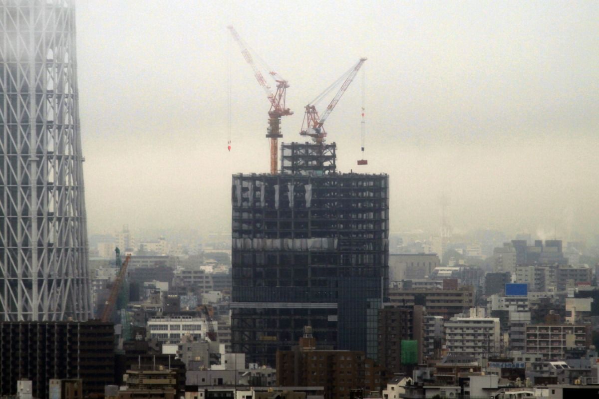 オフィス棟側の超望遠です。20~22階部分の鉄骨がどんどん組まれて行っています。左に写っているスカイツリーの航空障害灯の位置(柱に小さなデッキのような物が付いている場所)が高さ100mなので、オフィス棟の高さは100mを超えていますね。