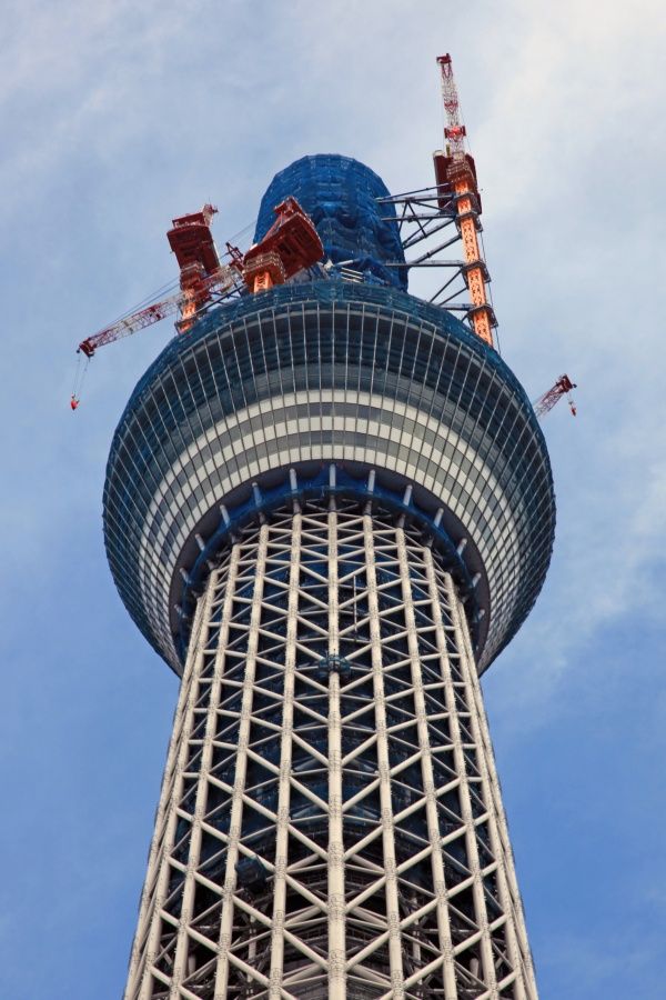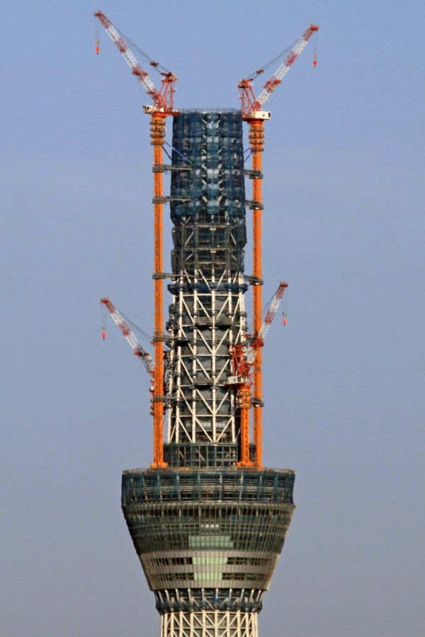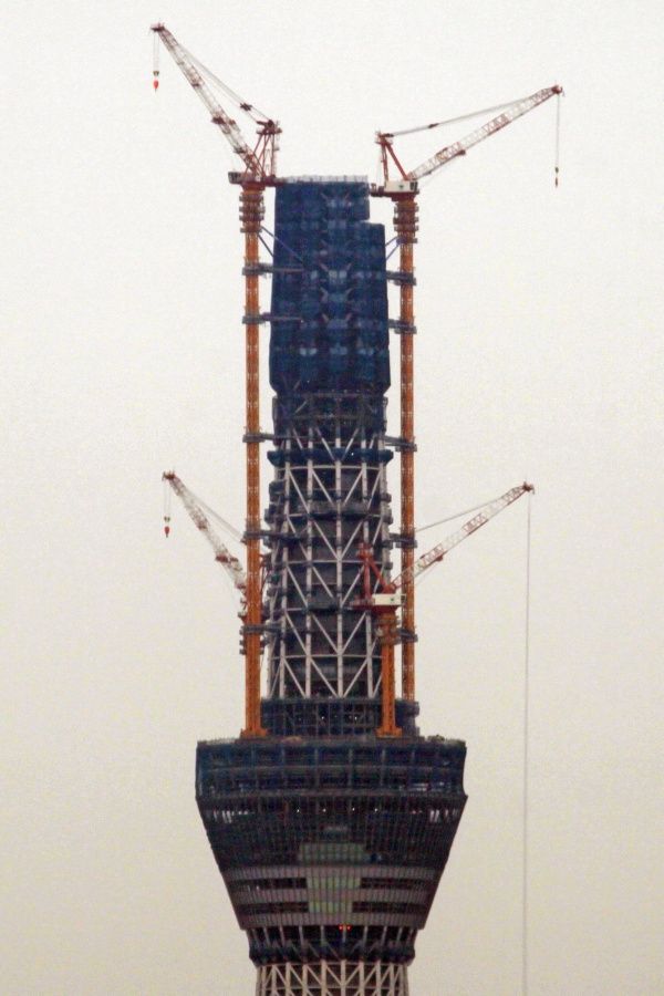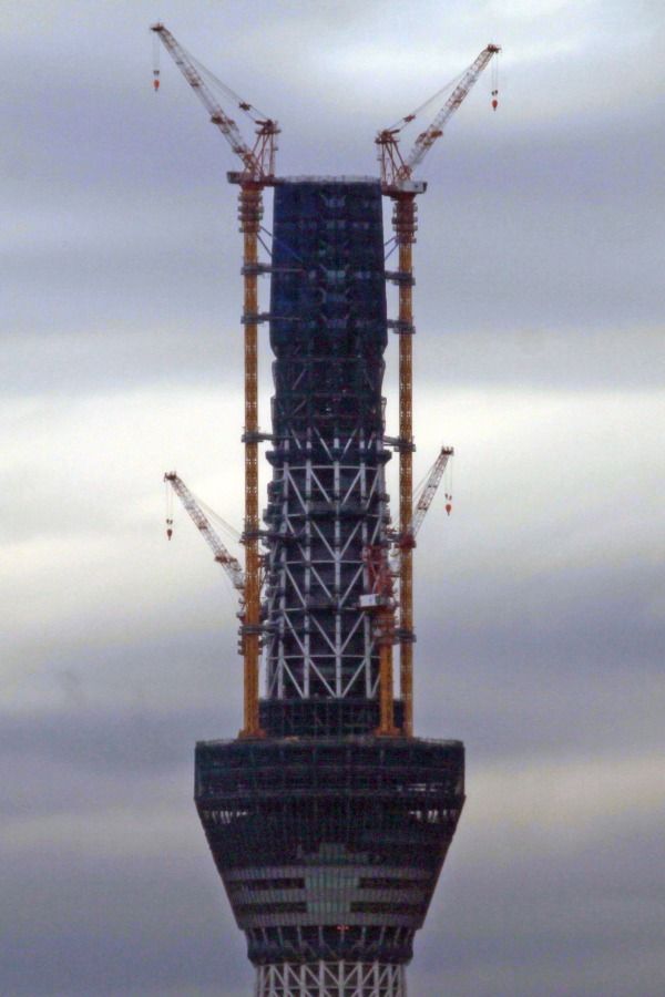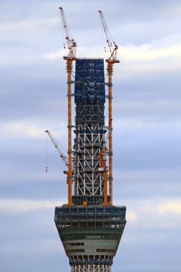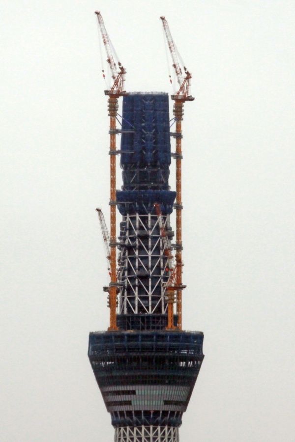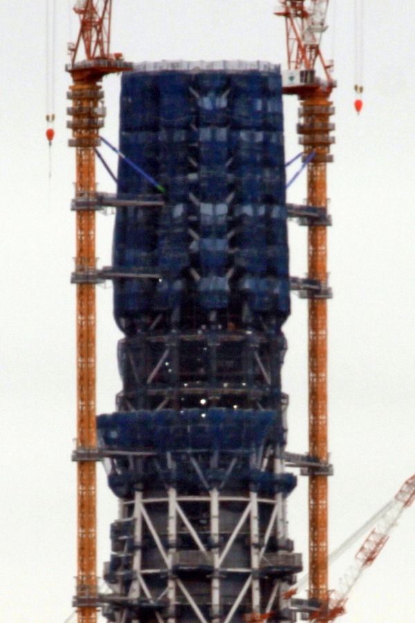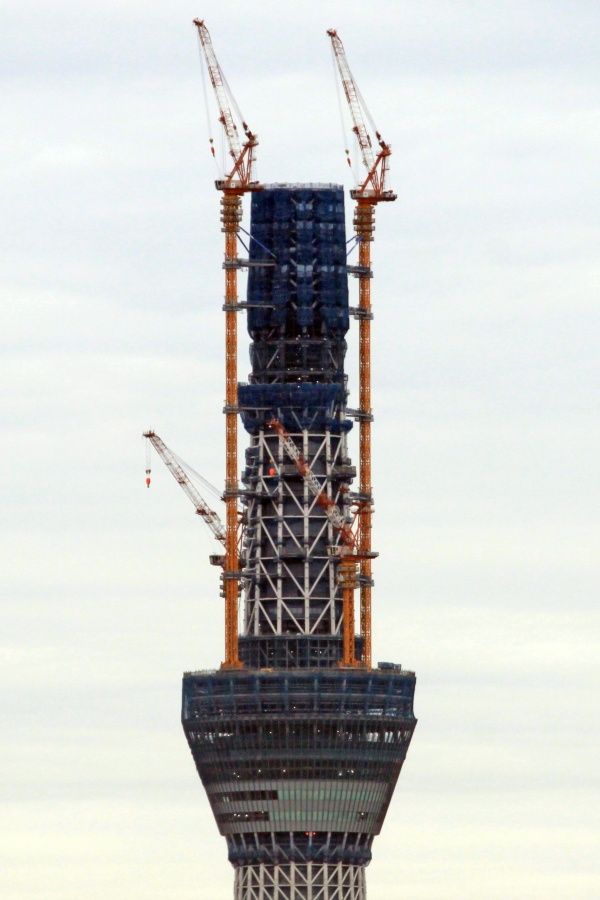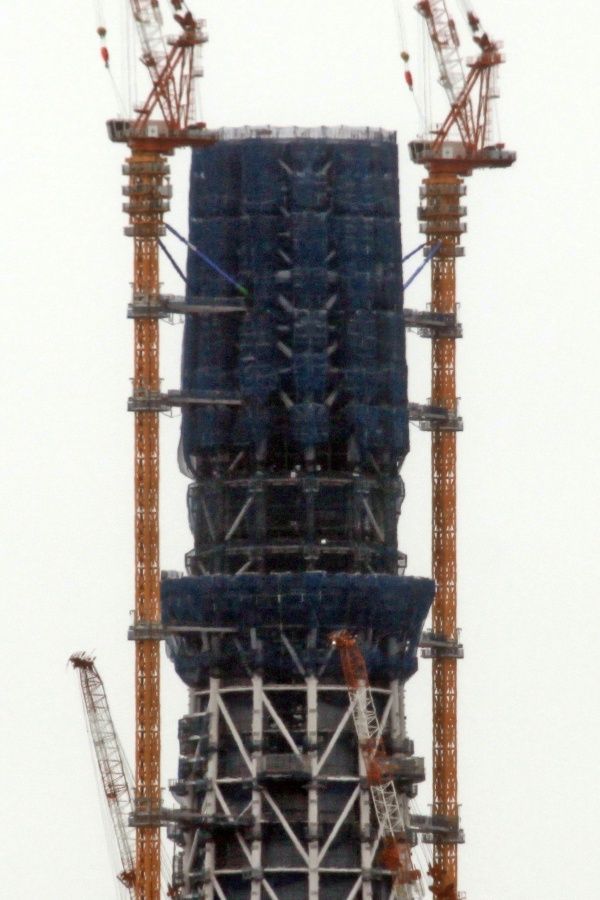 スカイツリー本体側の超望遠です。第一展望台上のタワークレーンが2基とも少しだけ下がりました。29日の写真と見比べると違いがわかると思います。第二展望台の工事を邪魔しないためですかね?