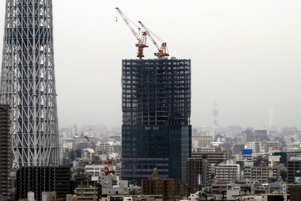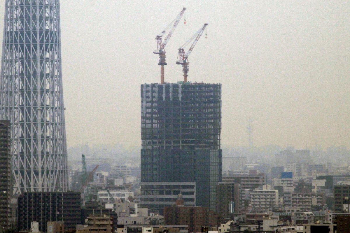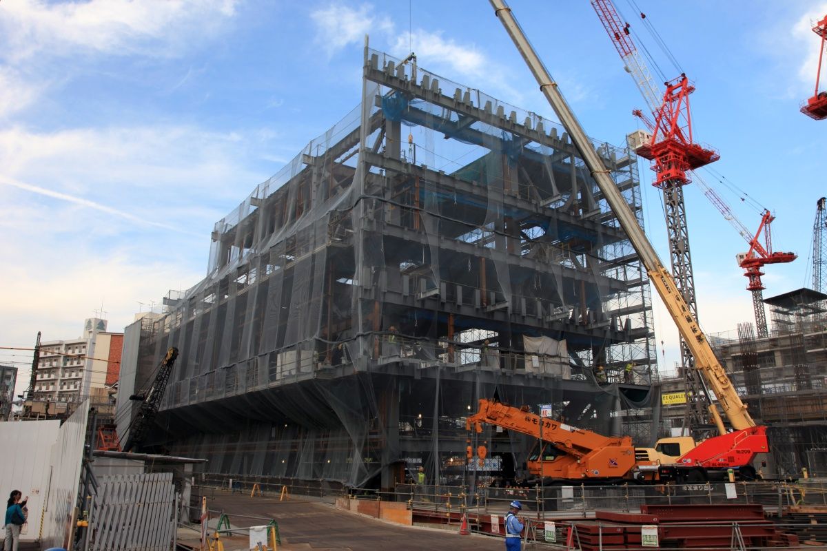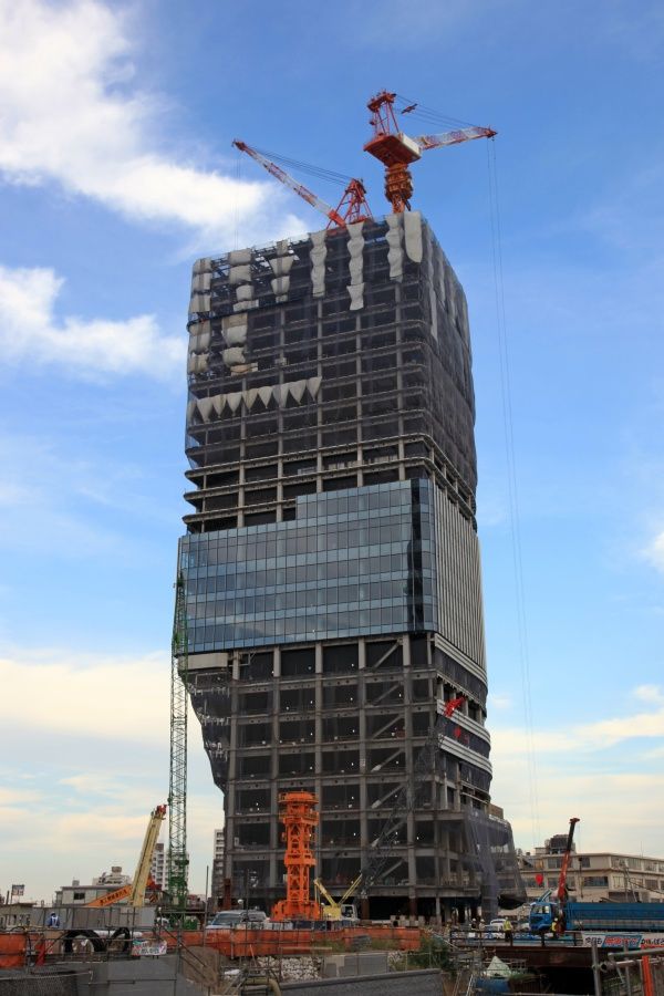 オフィス棟側の超望遠です。当観測所から見える側は、鉄骨に変化はなくガラスカーテンウォールの取付工事が少し進んだだけです。