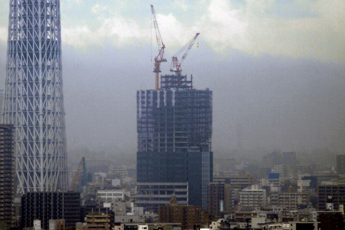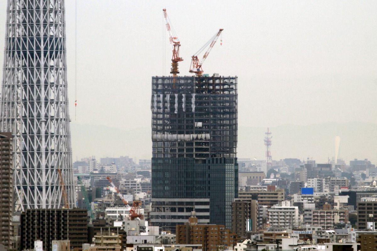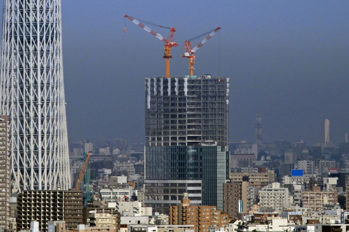オフィス棟側の超望遠です。当観測所から見える側は、鉄骨に変化はなくガラスカーテンウォールの取付工事が少し進んだだけです。