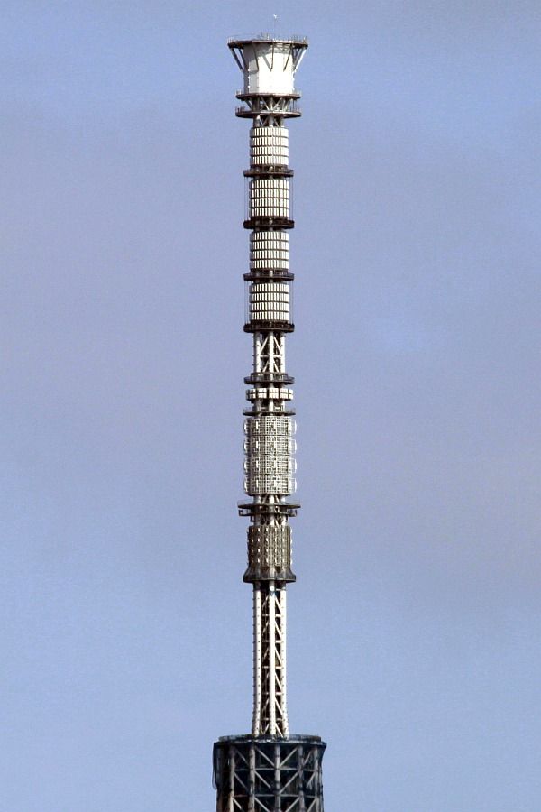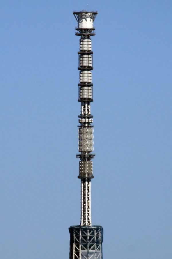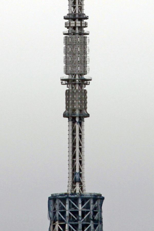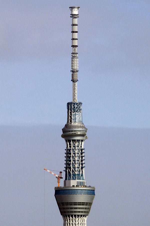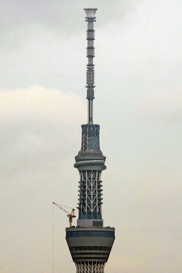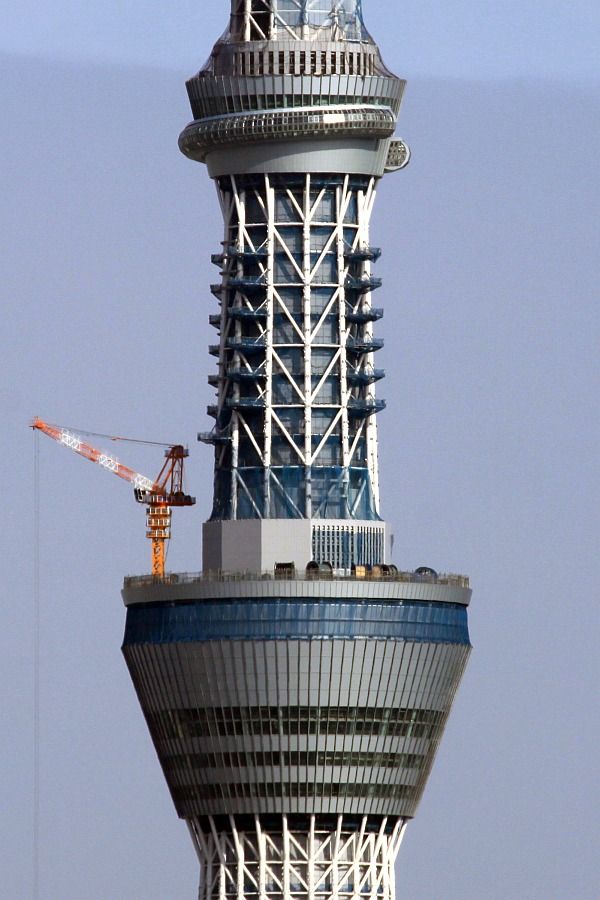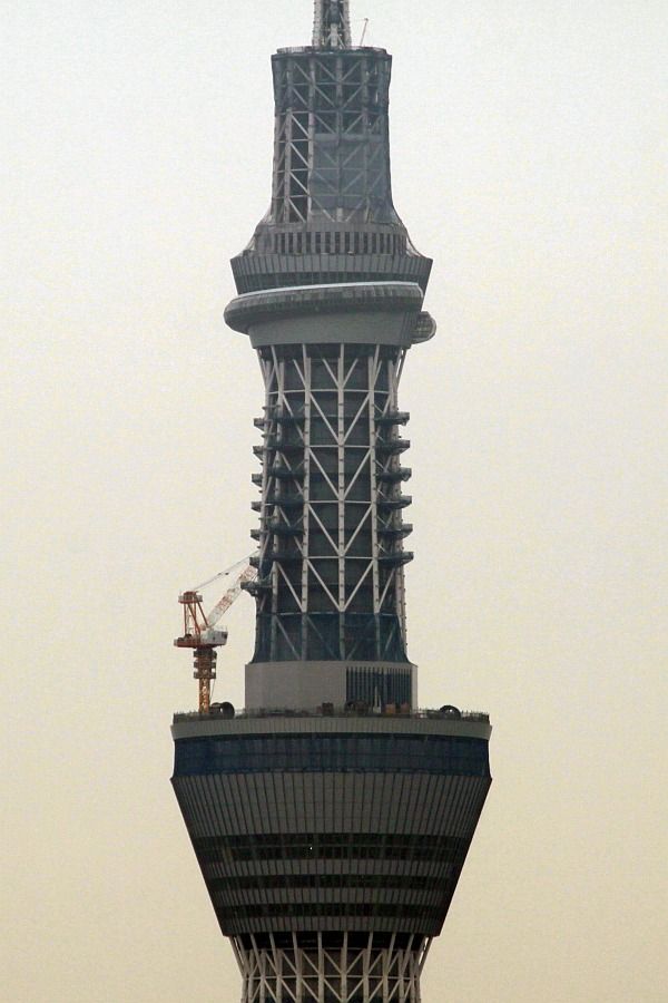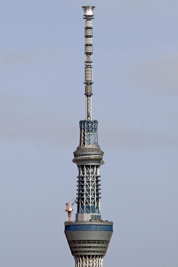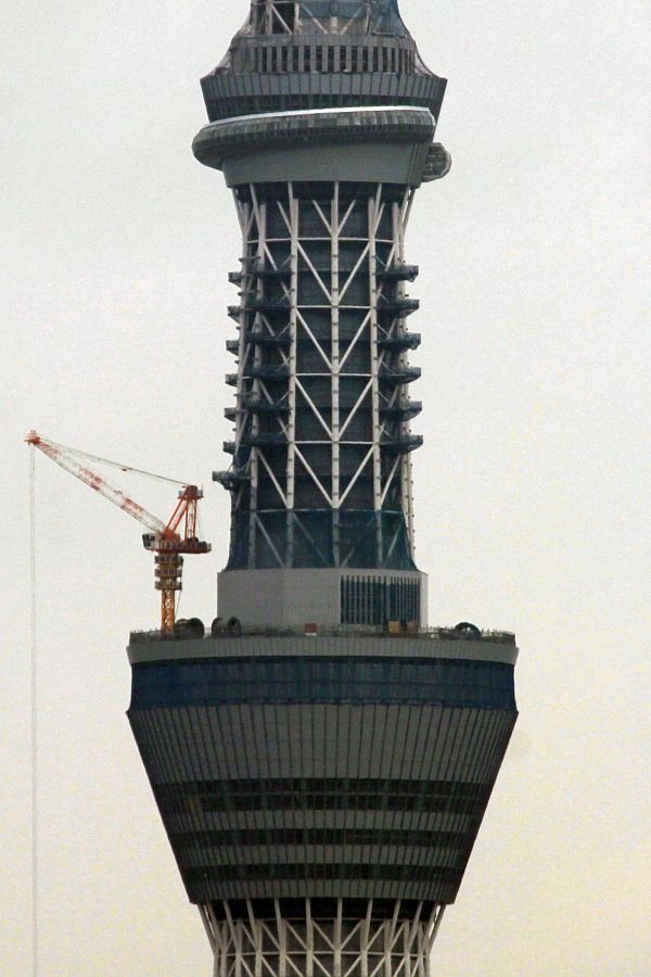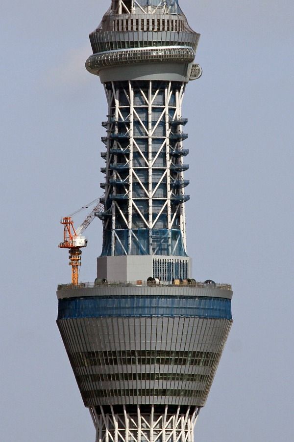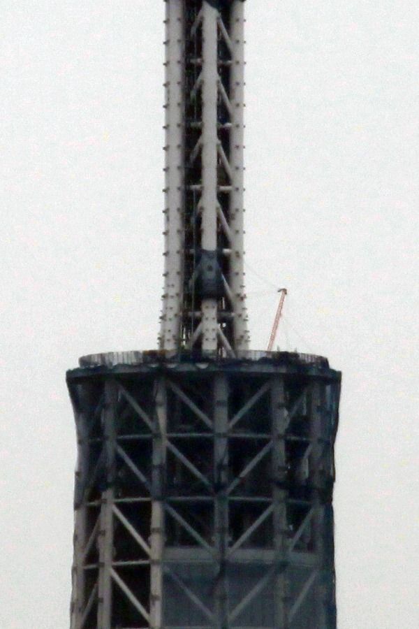 展望台部分の超望遠です。展望台部分に特に変化ありませんが、塔体の一番上(NHKスペシャルによると通称495という場所)に何かクレーンのようなものが見えます!
