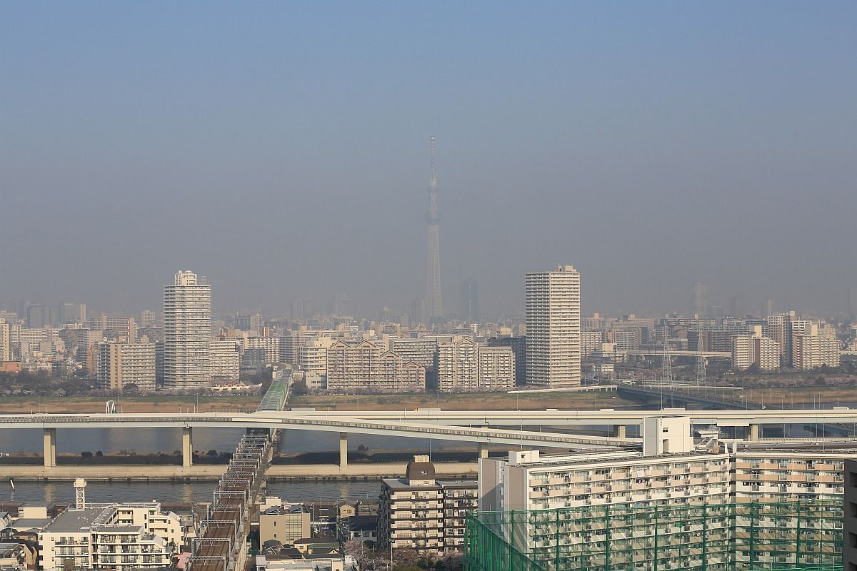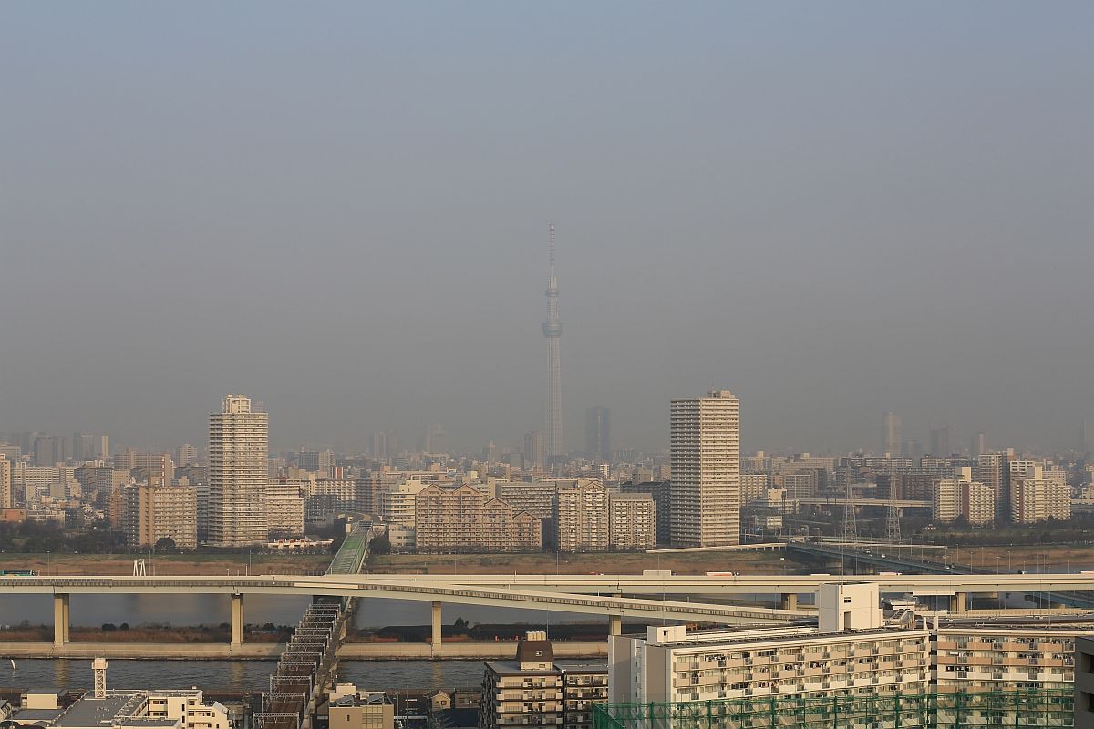 と言ってもスカイツリーがどこにいるのかわからないと思うのでスカイツリーにズームです。ちょうど天望デッキの上から見えています。ただ、手前に白いマンションが見切れていますが、そこは勝どき東地区の再開発で29階建てのタワーマンションが建設されます。これが建てば中央清掃工場の解放スペースからは完全にスカイツリーが見えなくなりそうです。