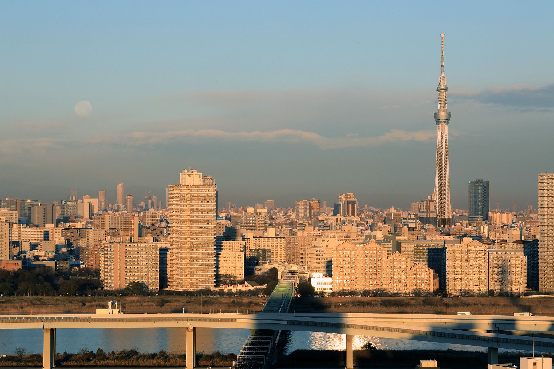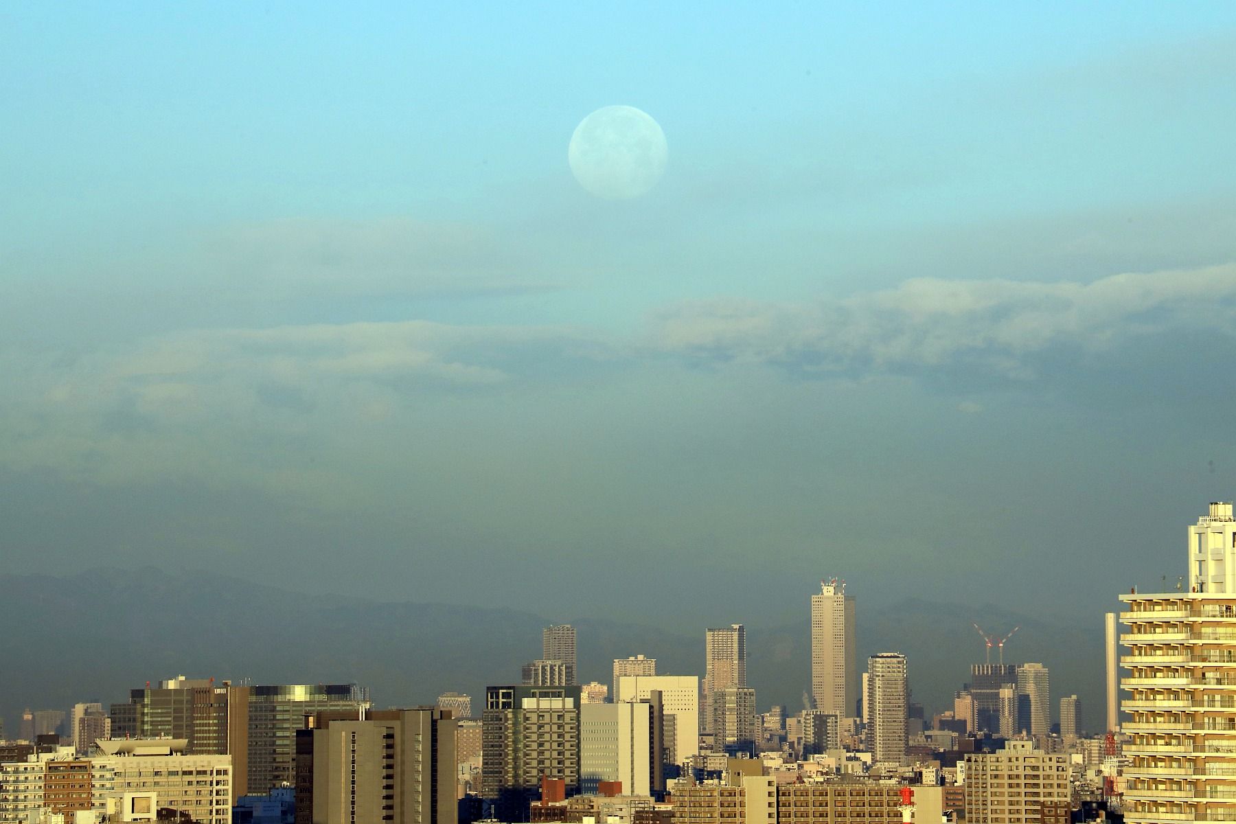 2019年1月22日、自宅マンションから撮影した満月と東京スカイツリーです。もう明るい時間で雲の近くに月がいるので月はわかりにくいですね。