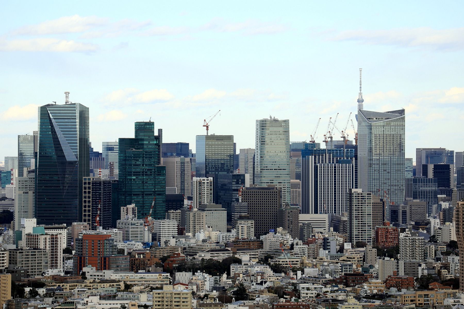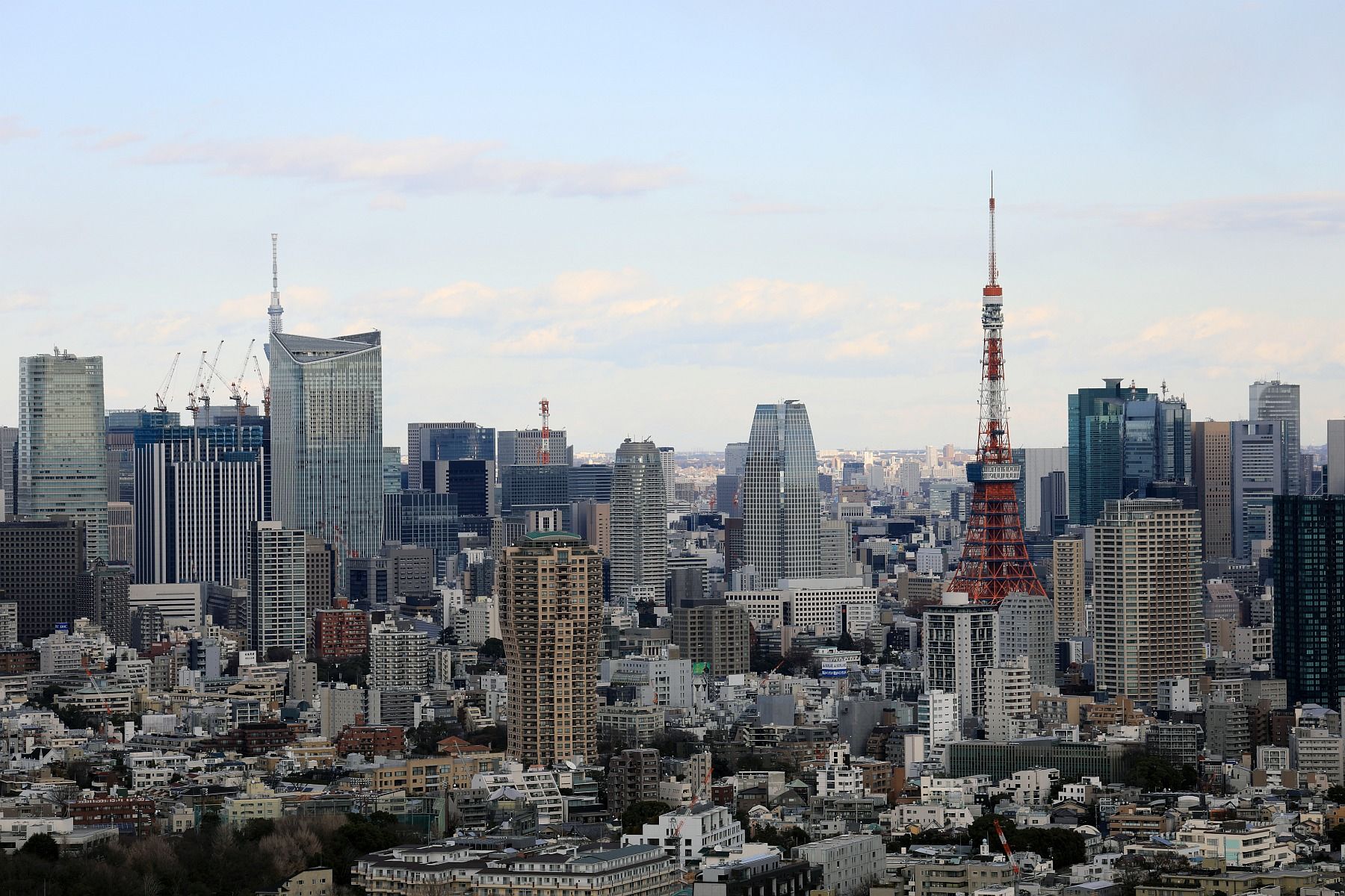 ところでこの中央から右にかけての超高層ビル群の手前側ですが、「虎ノ門・麻布台地区第一種市街地再開発事業」がこれから始まります。地上65階・高さ約323m、地上64階・高さ約263m、地上53階・高さ約233mと3棟の超高層が建設されます。一番高い高さ323mの超高層ビルがスカイツリーに重なるかどうかといった場所です。将来この景色は大きく変わります。