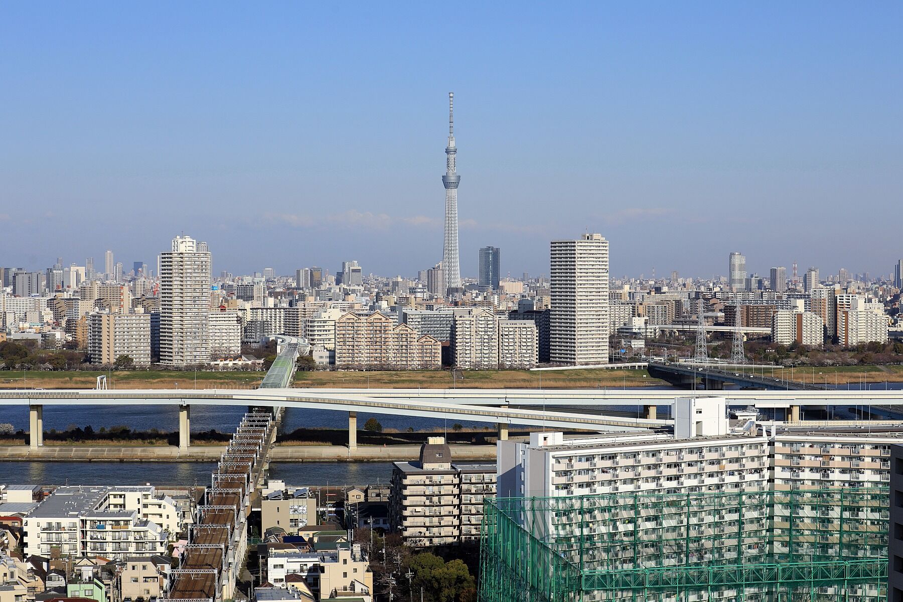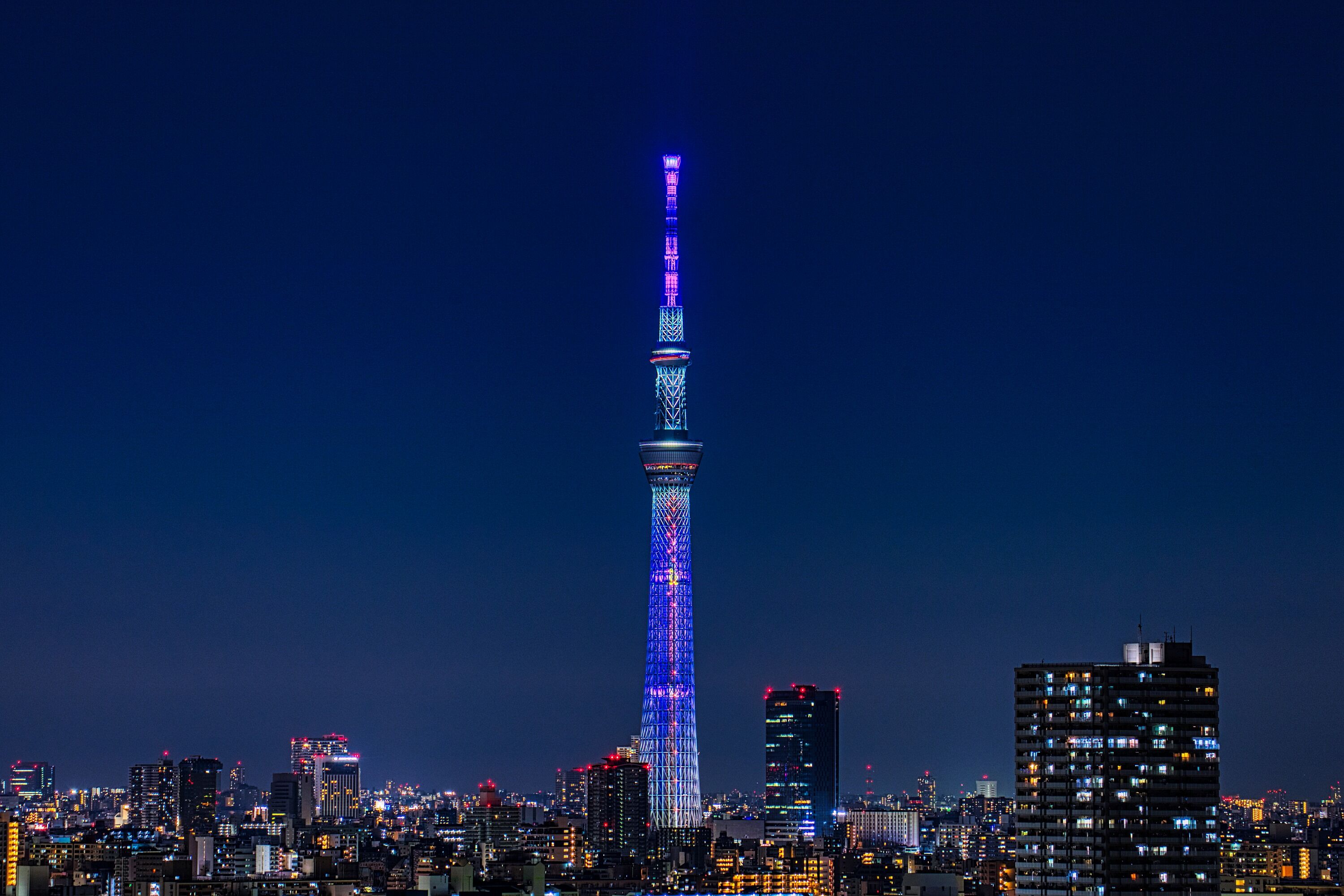 2020年3月30日、自宅マンションから撮影した東京スカイツリー夜景です。今の期間は世界的に拡がる新型コロナウイルス感染症に、世界が一丸となって立ち向かい、みんなで打ち勝とうという思いを込めて、地球をイメージした青色の特別ライティングが点灯しています。