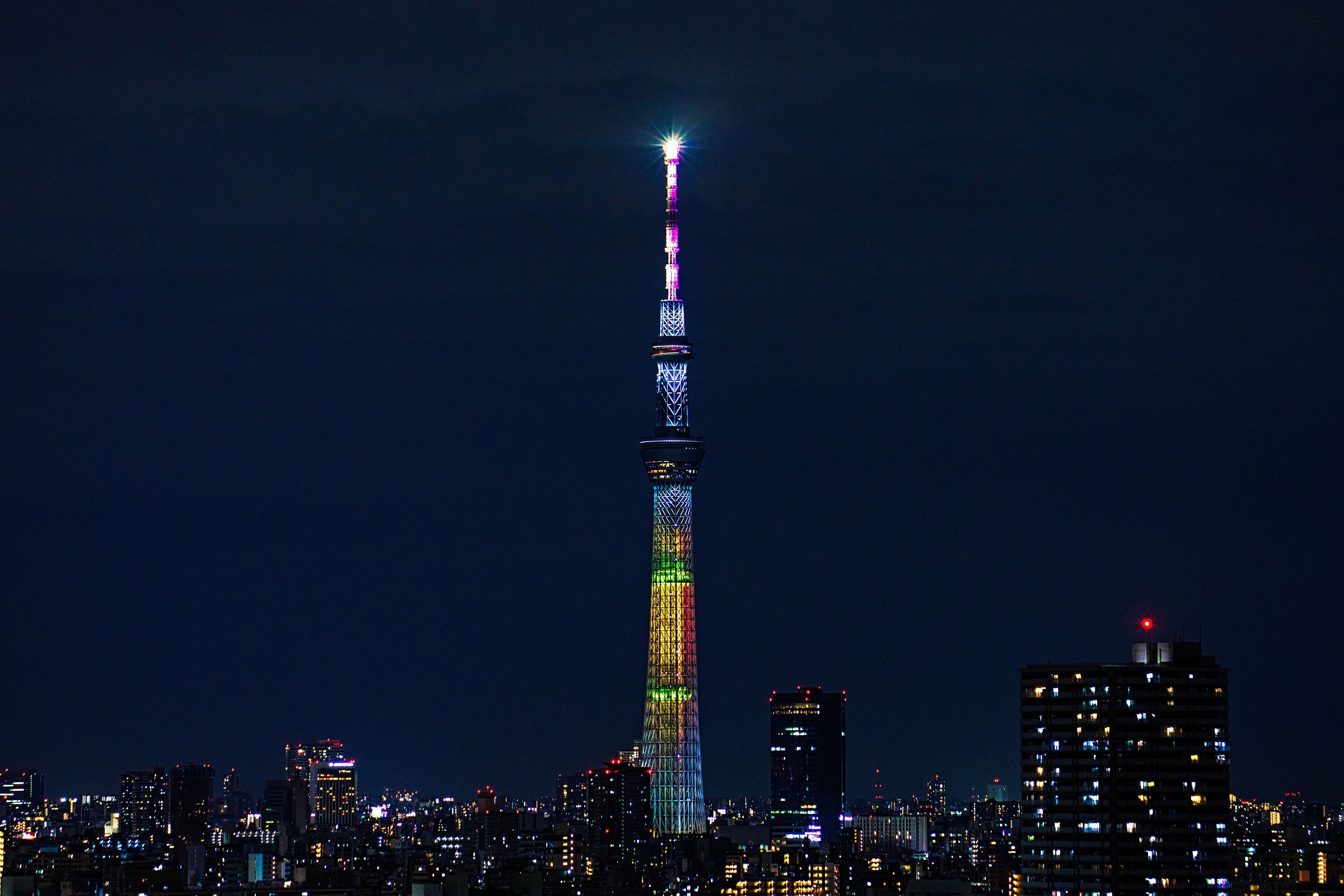 2020年10月25日、イーストタワーから撮影した17色に変化する東京スカイツリーの特別ライティングです。2020年に創設75周年を迎えた国際連合に協力し、持続可能な開発推進(SDGs)の機運を高めることを目的として、SDGsの17色をイメージした特別ライティングとなっています。
