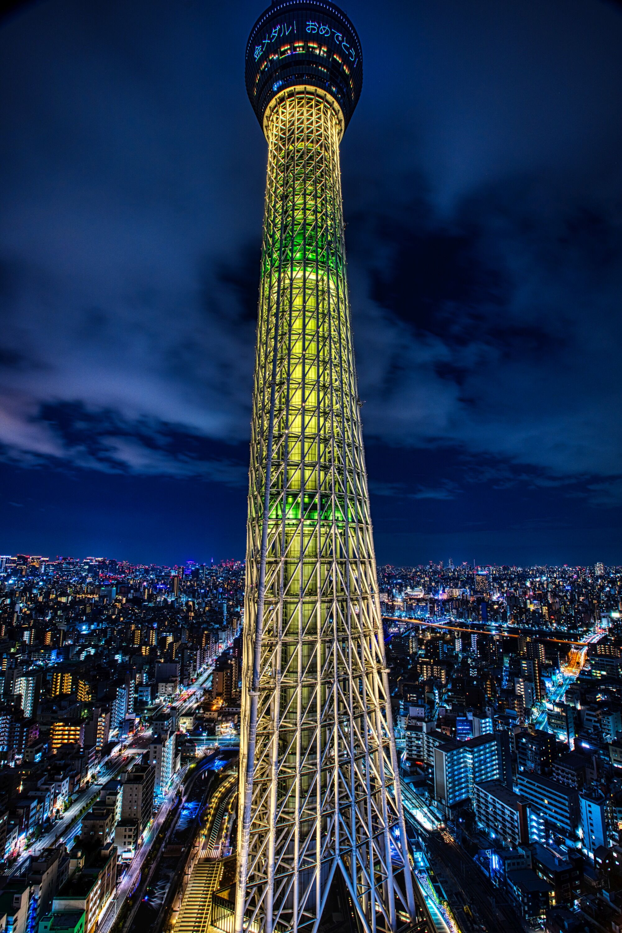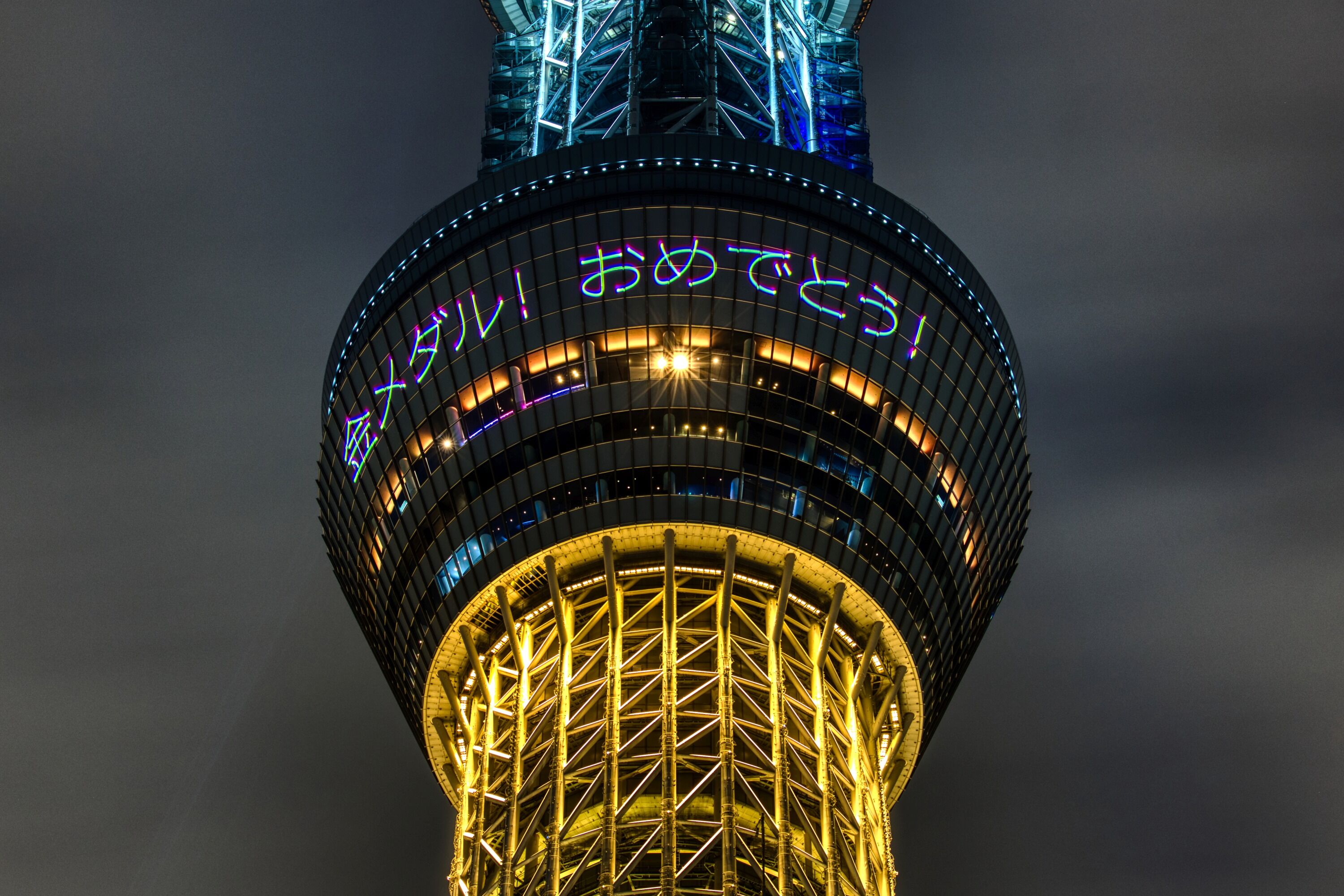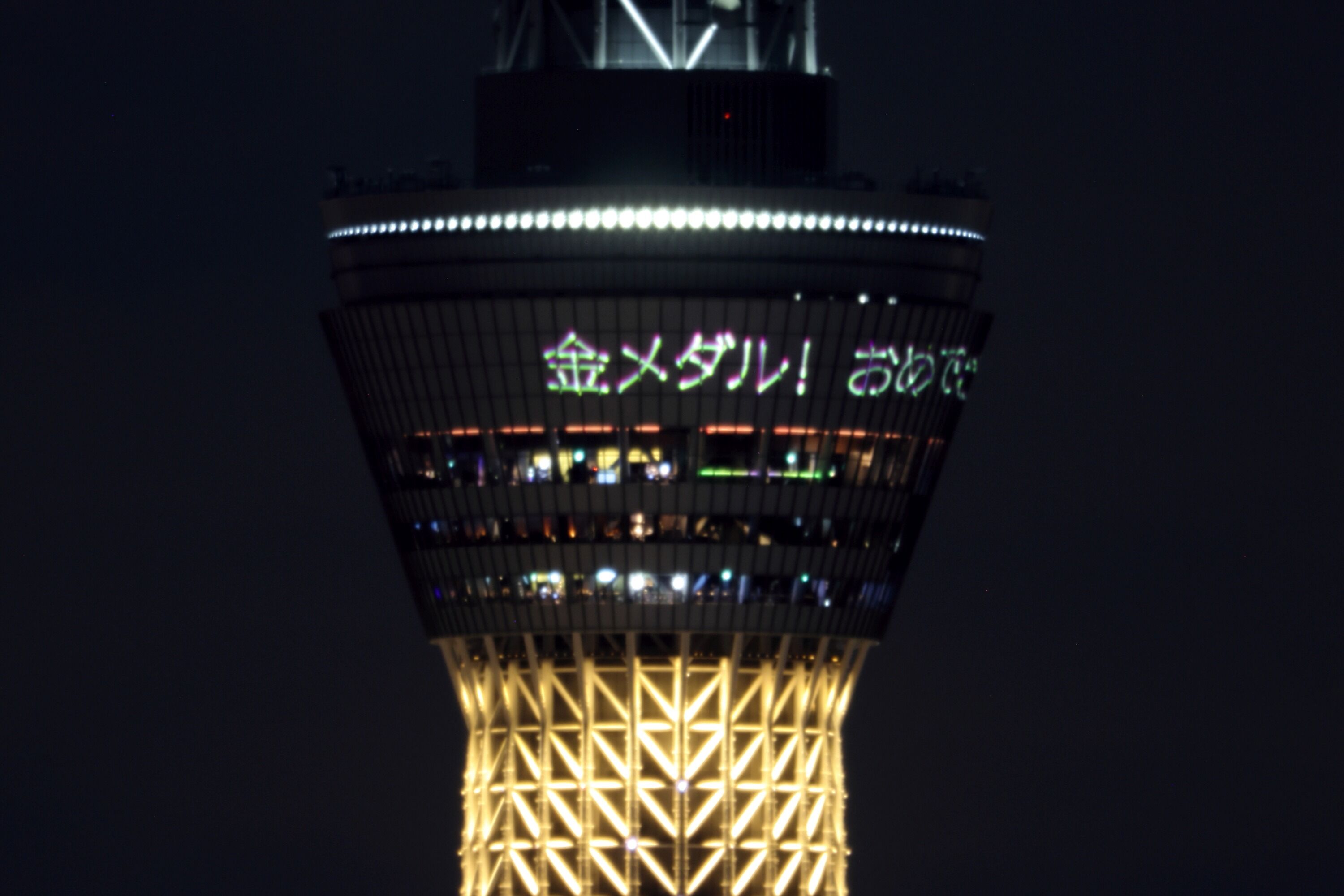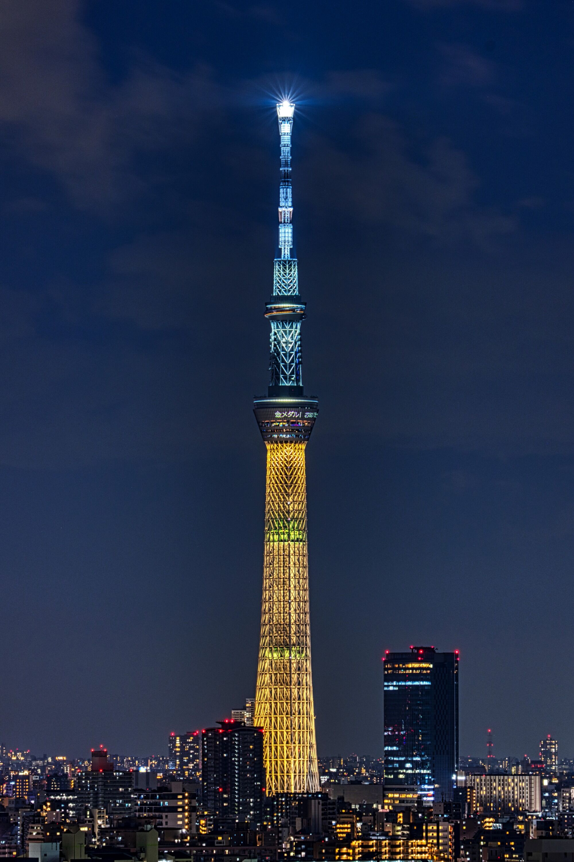 2022年2月11日、イーストタワーから撮影した東京スカイツリー夜景です。この日は男子ハーフパイプで平野歩夢選手が金メダルを獲得したことを祝福して「金メダル」をイメージした特別ライティングが点灯しました。