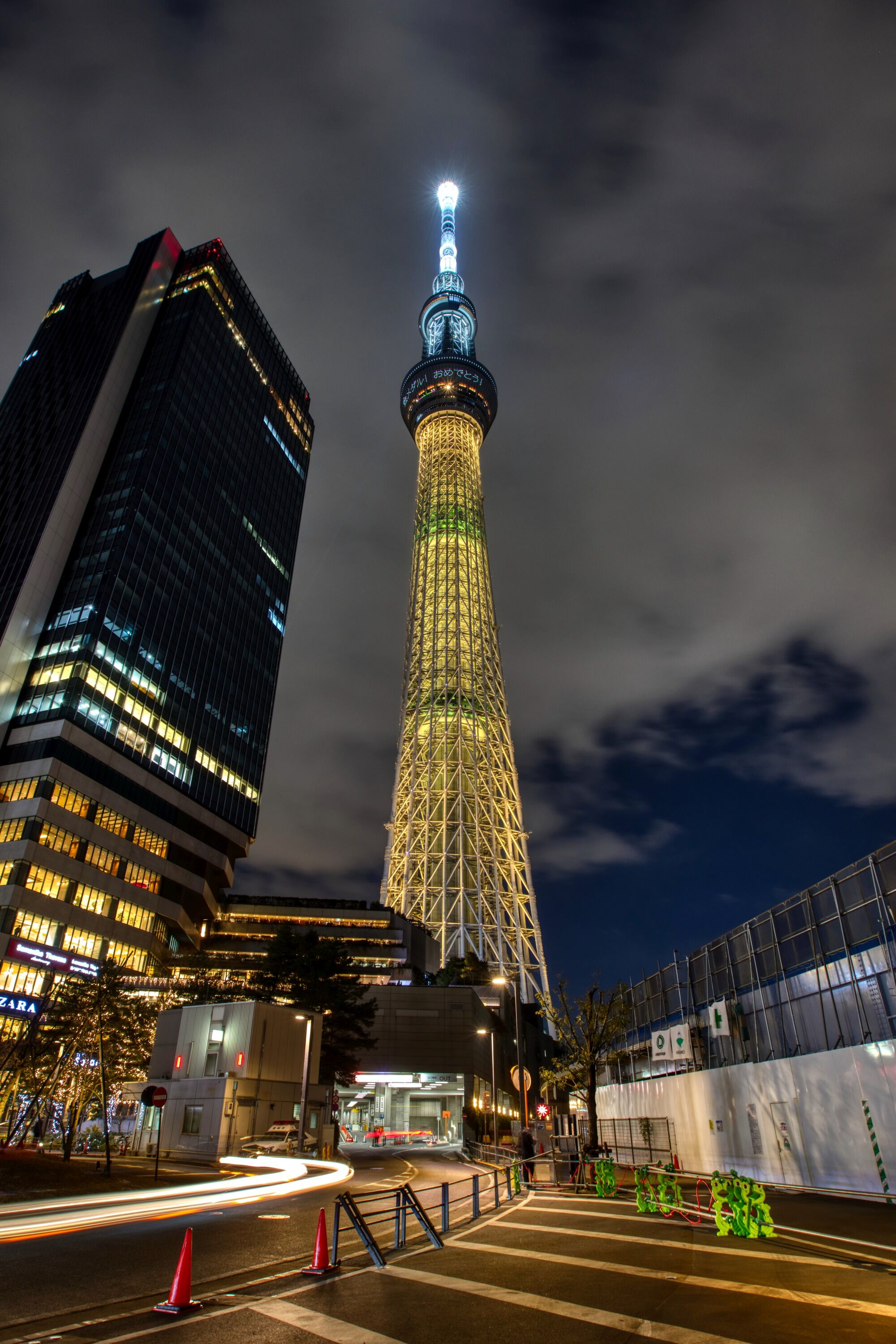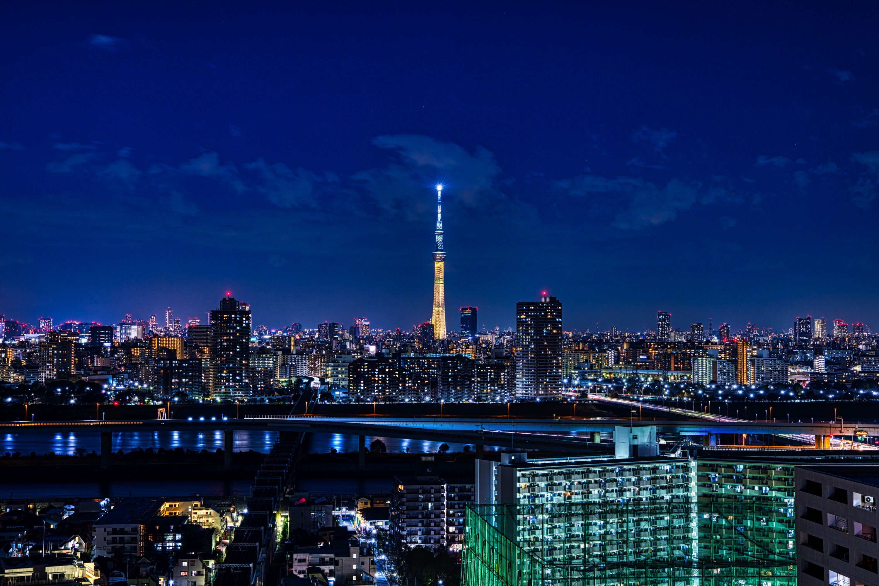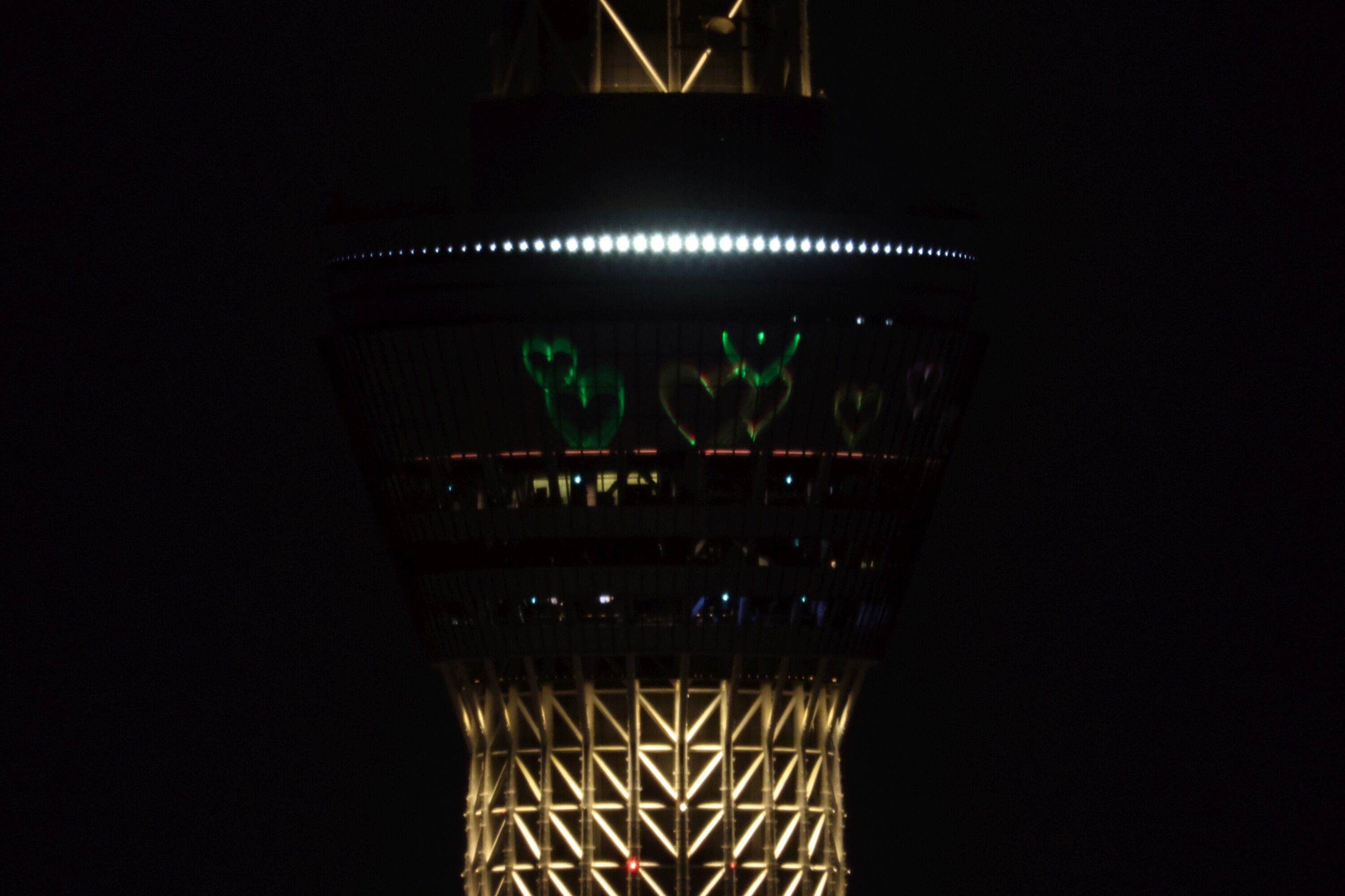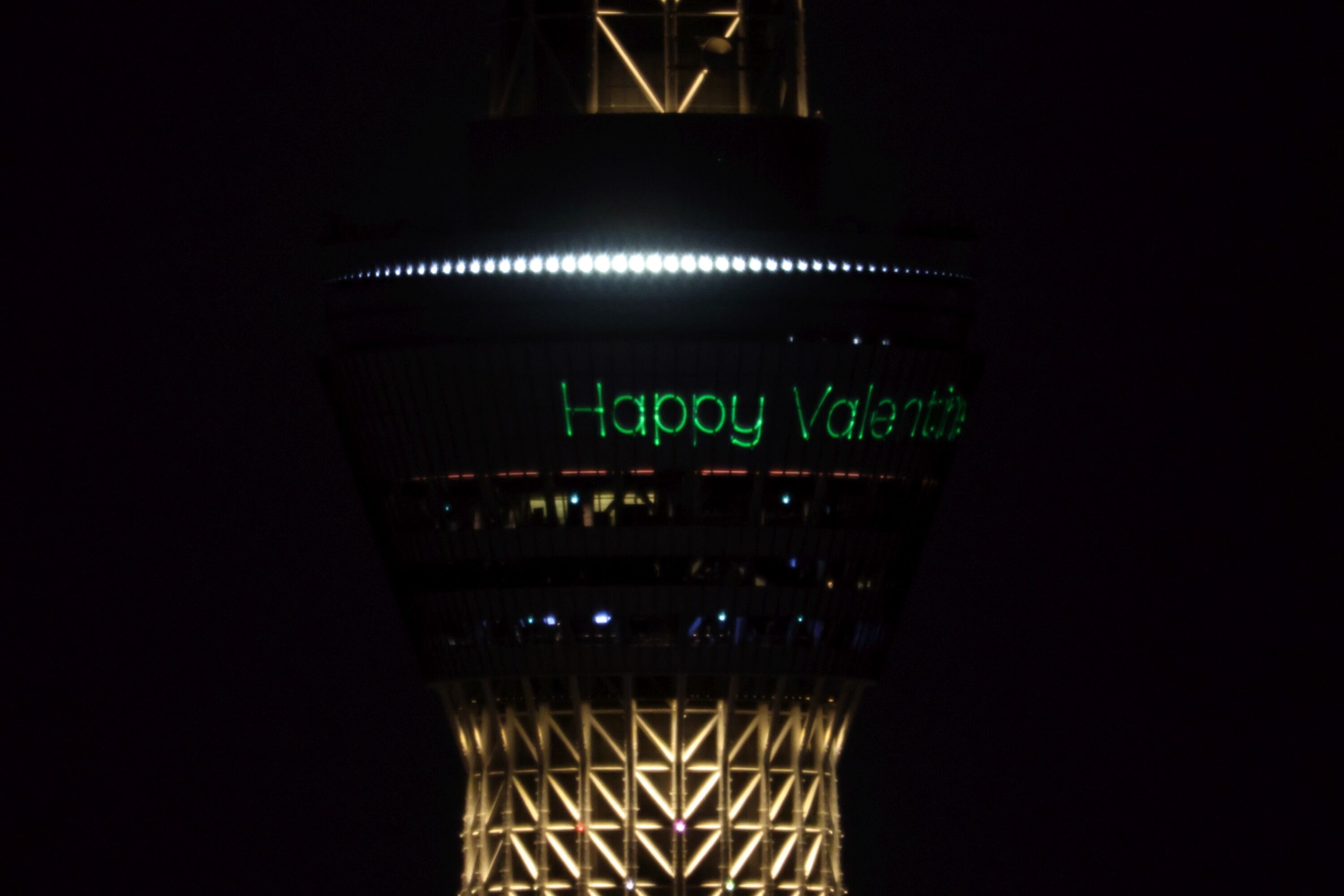 2022年2月11日、イーストタワーから撮影した東京スカイツリー夜景です。この日は男子ハーフパイプで平野歩夢選手が金メダルを獲得したことを祝福して「金メダル」をイメージした特別ライティングが点灯しました。