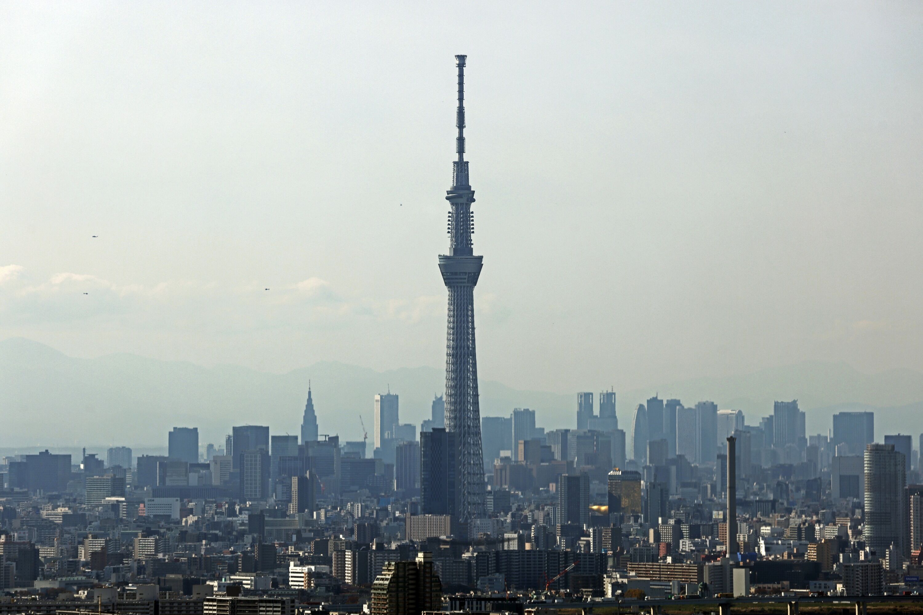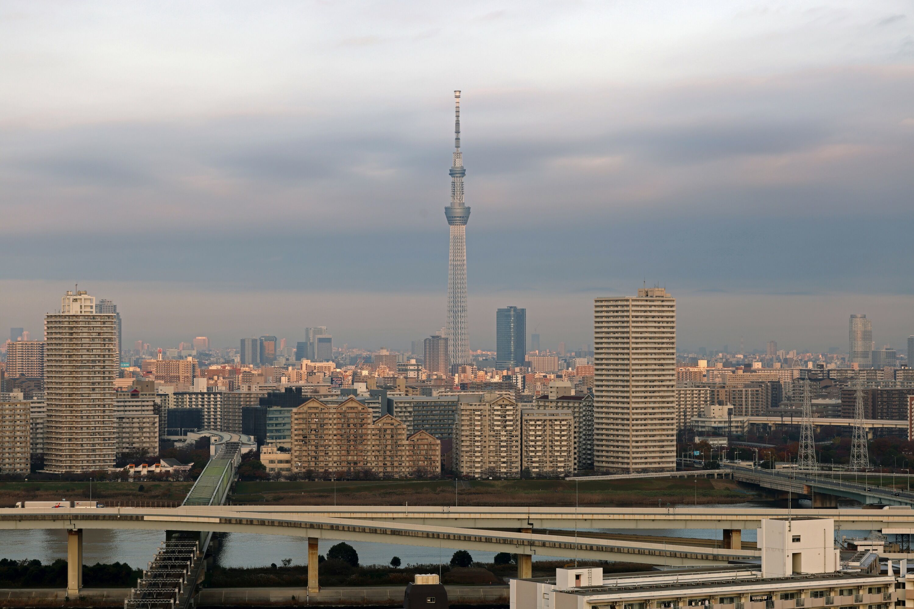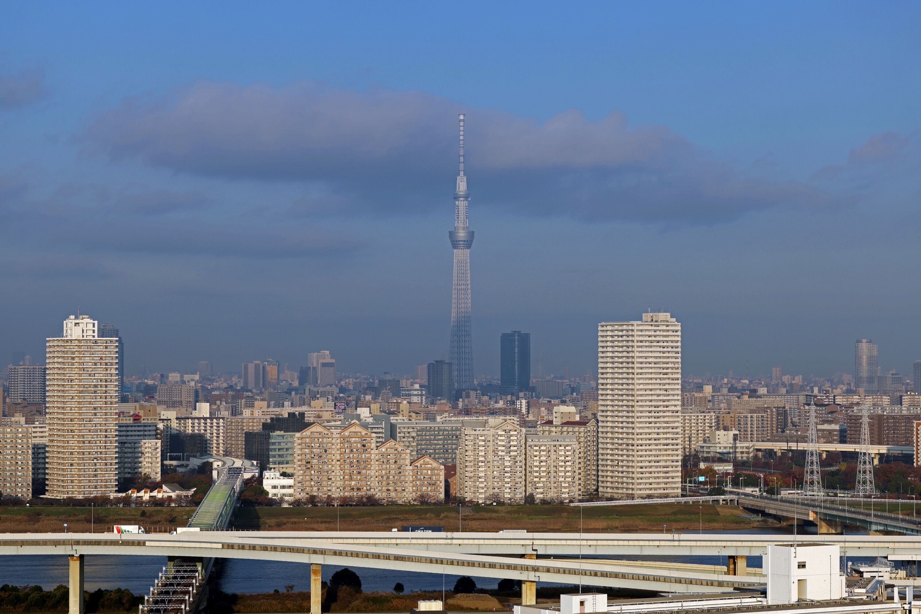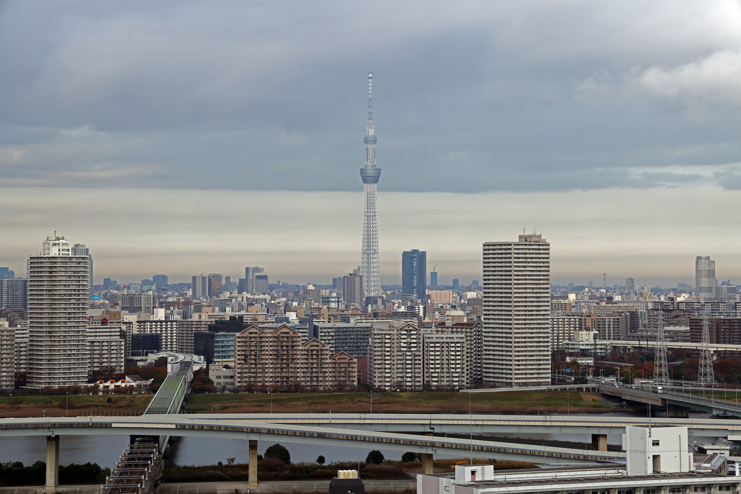 少しスカイツリーにズームです。手前に見えている高層マンションがある場所は新小岩駅周辺です。