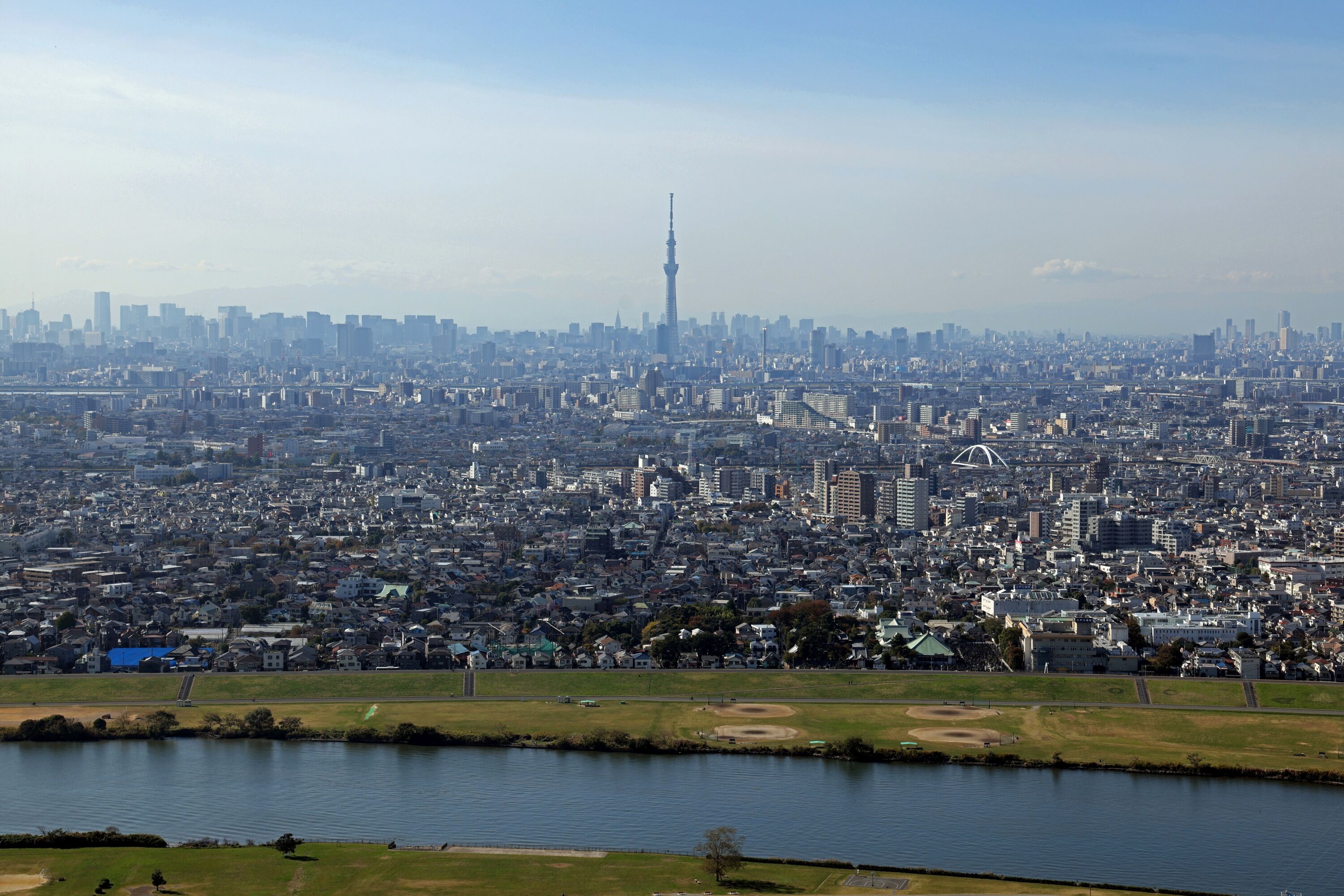 2023年11月16日、市川駅前のアイ・リンクタウン展望施設から撮影した東京スカイツリーです。目の前の川は江戸川です。