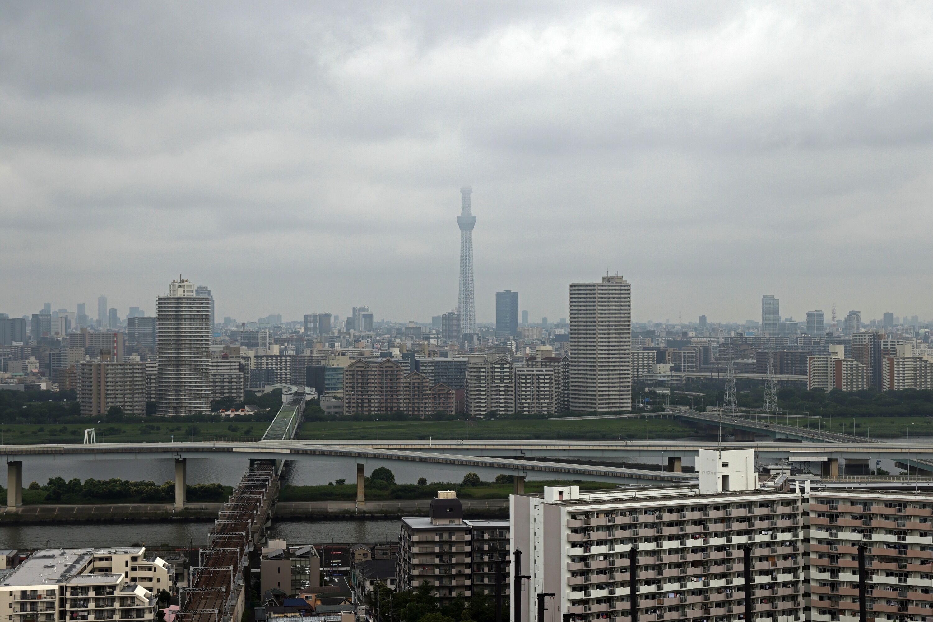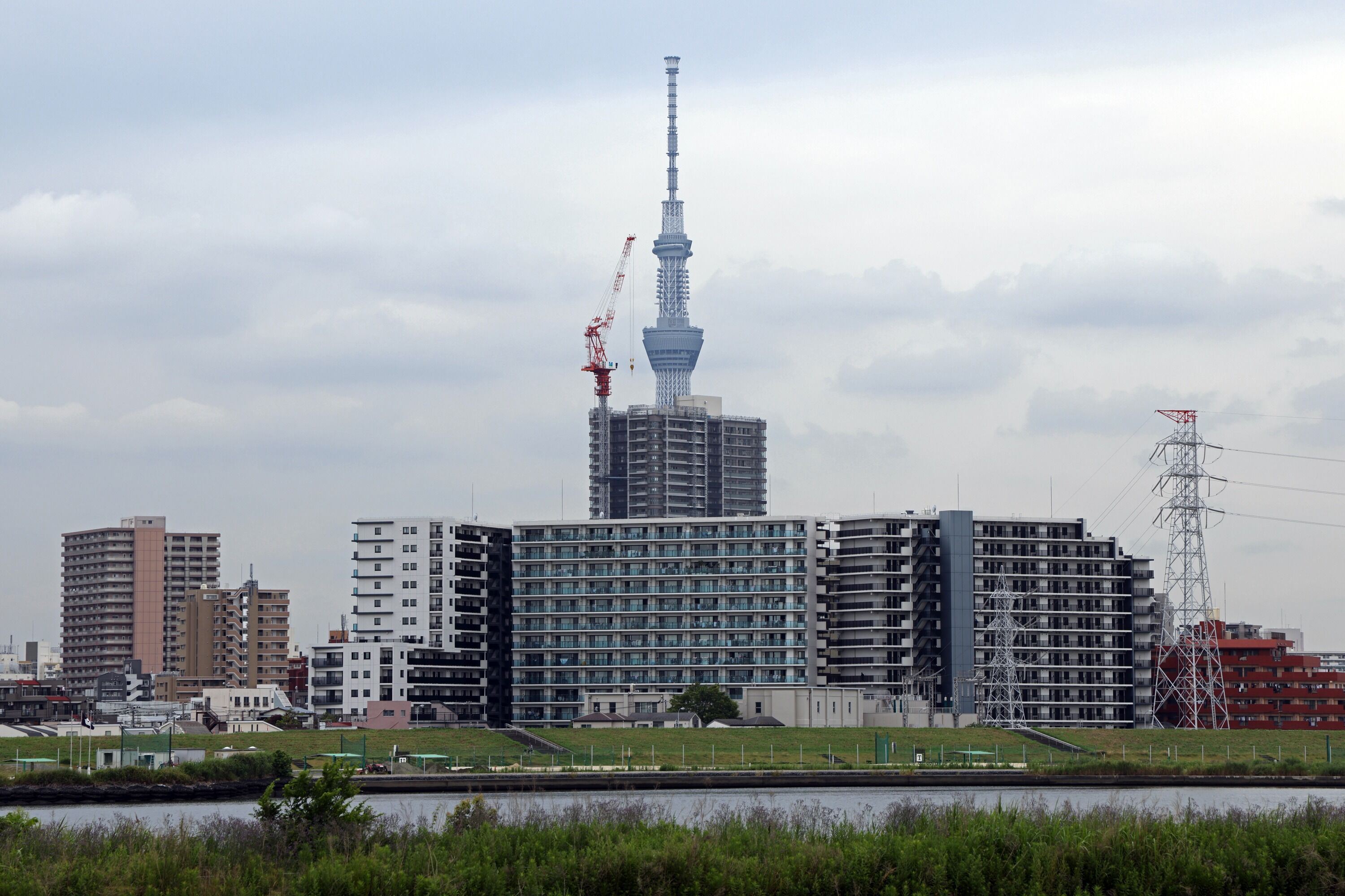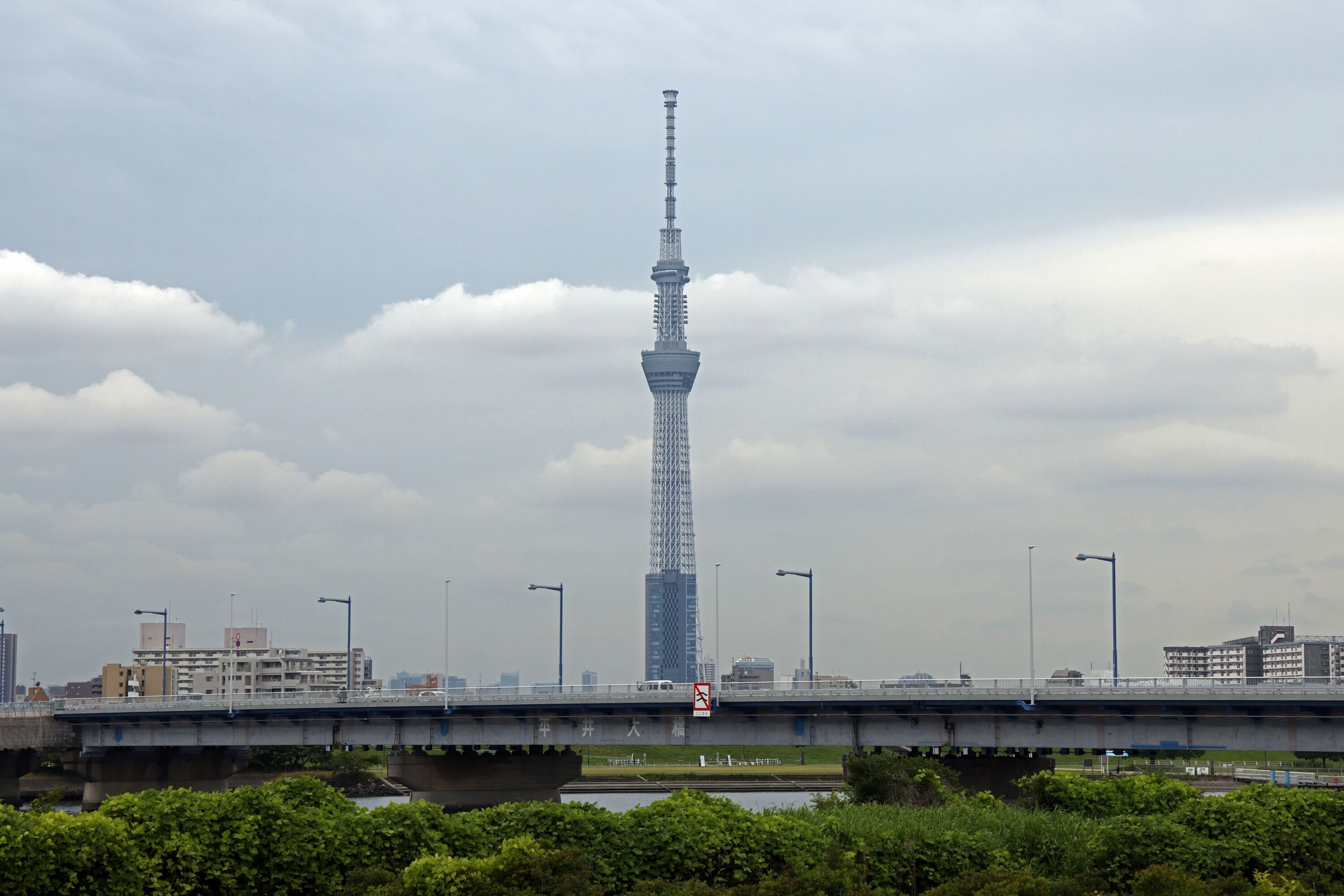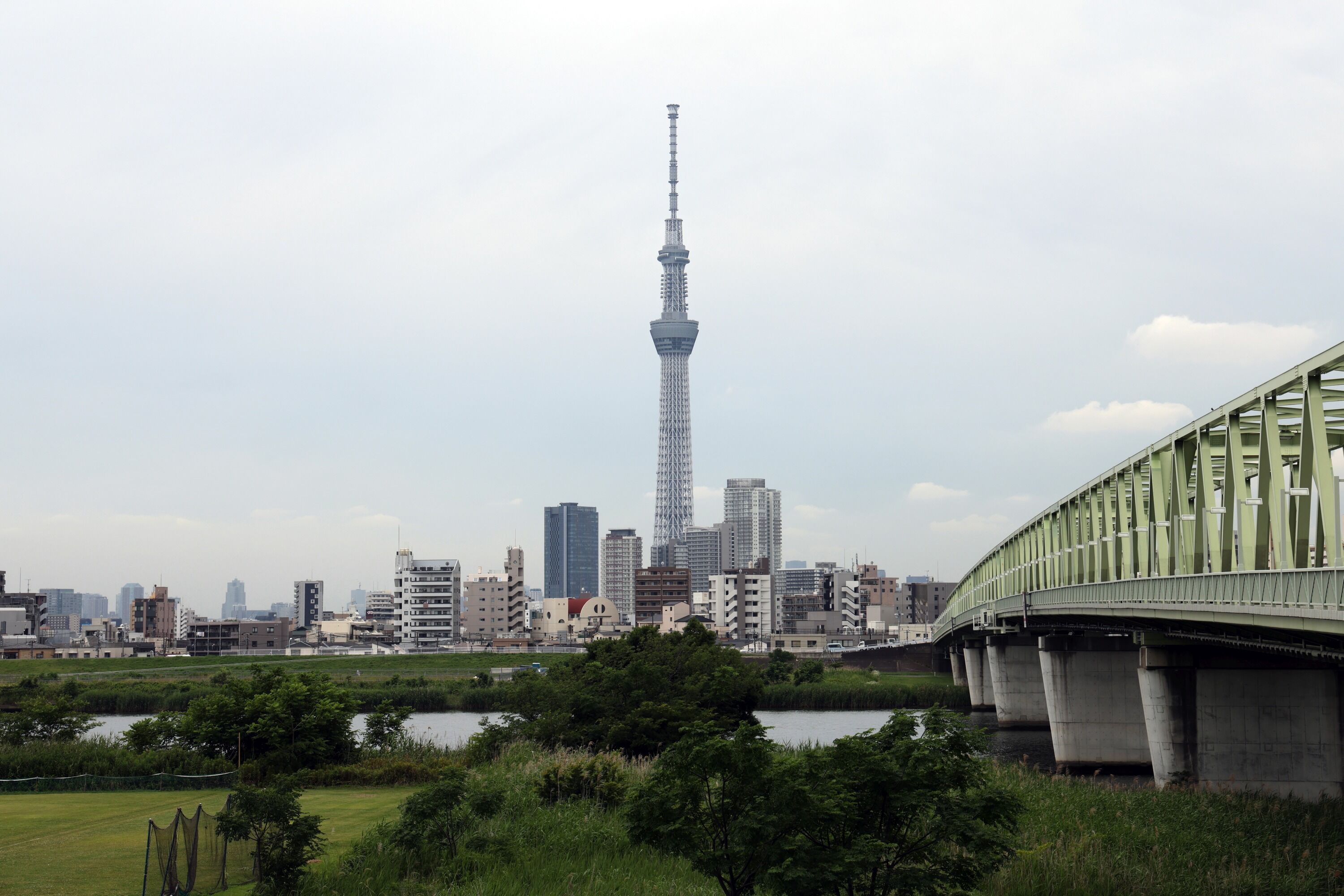 2024年6月13日に荒川と綾瀬川の間にある土手から撮影した東京スカイツリーです。足元は曳舟のタワマン群です。右の橋は木根川橋で、木根川という川があるわけではなく、現在の東四つ木1丁目~3丁目の昔の地名が「本田木根川町」だったということから付いた名称のようです。ただ、なぜこの地名だったのははっきりとわかっていないそうです。