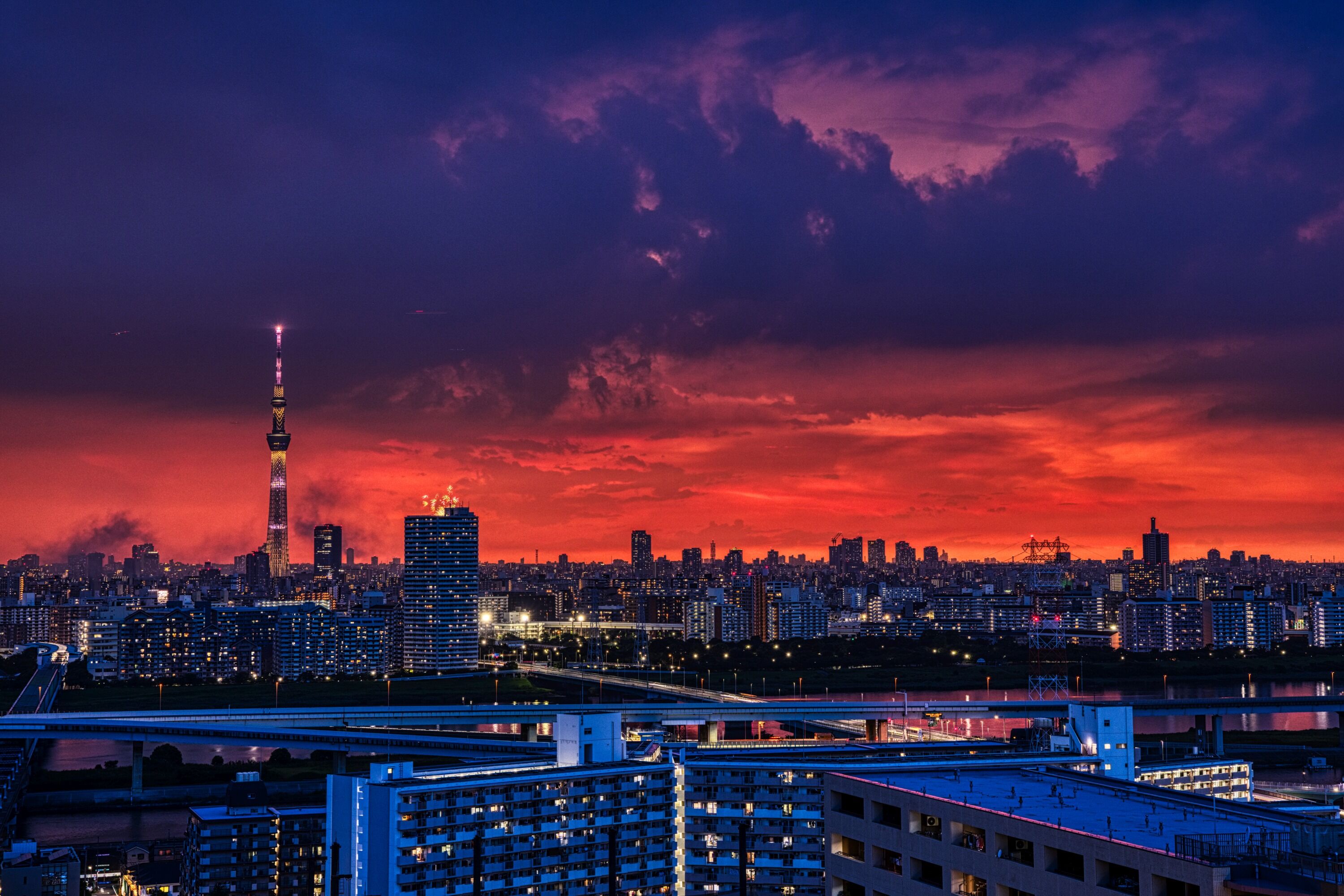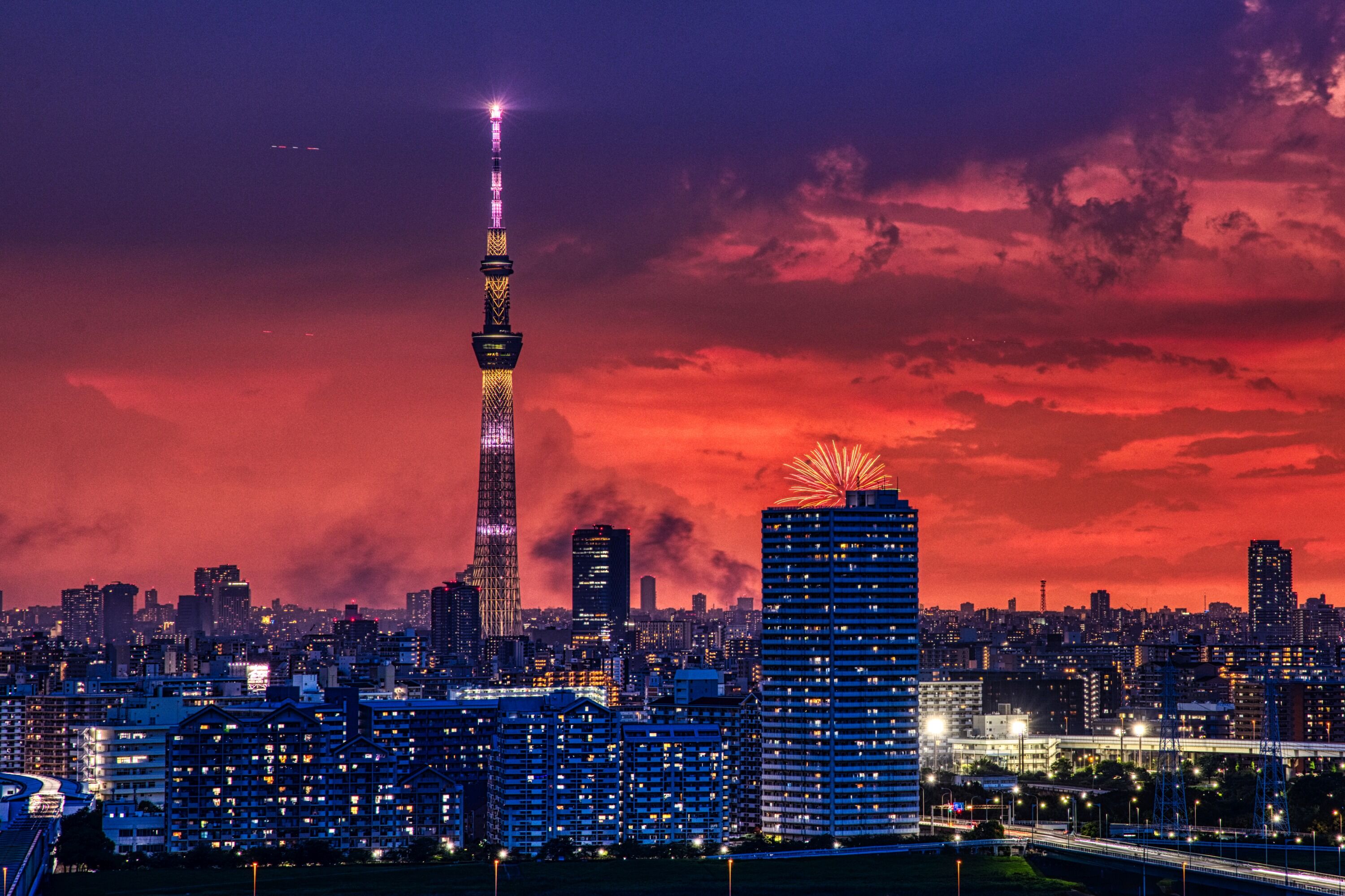 2024年7月27日、自宅マンションから撮影した東京スカイツリーと夕焼けです。わかりにくいですがスカイツリーの右側のタワマンの背後に隅田川花火大会が見えています。