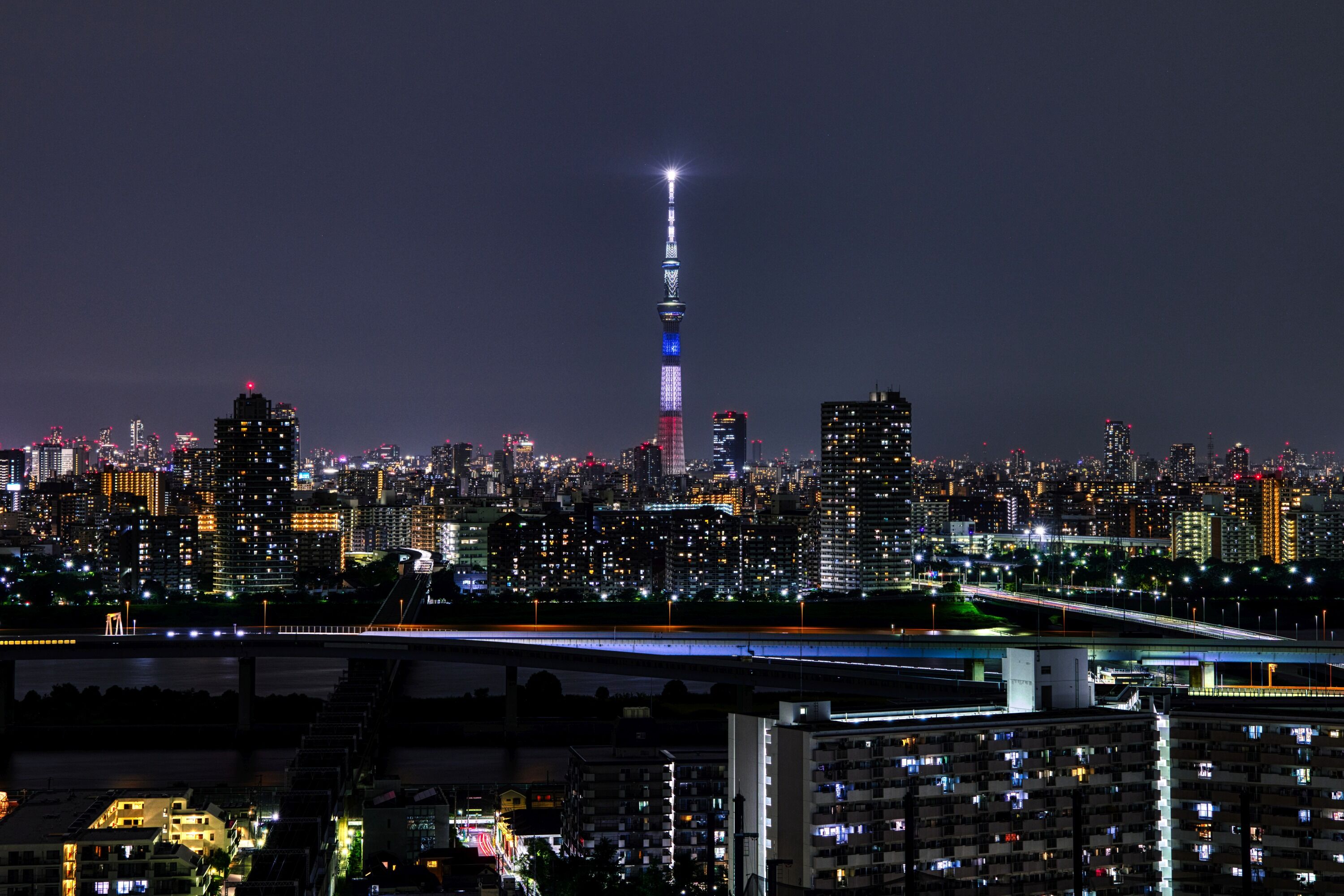 2024年7月26日、自宅マンションから撮影した東京スカイツリー夜景です。昨夜はパリ2024オリンピック開会式にあわせて特別ライティングが行われ、20時~22時は開催国であるフランス国旗をイメージした特別ライティングが点灯しました。