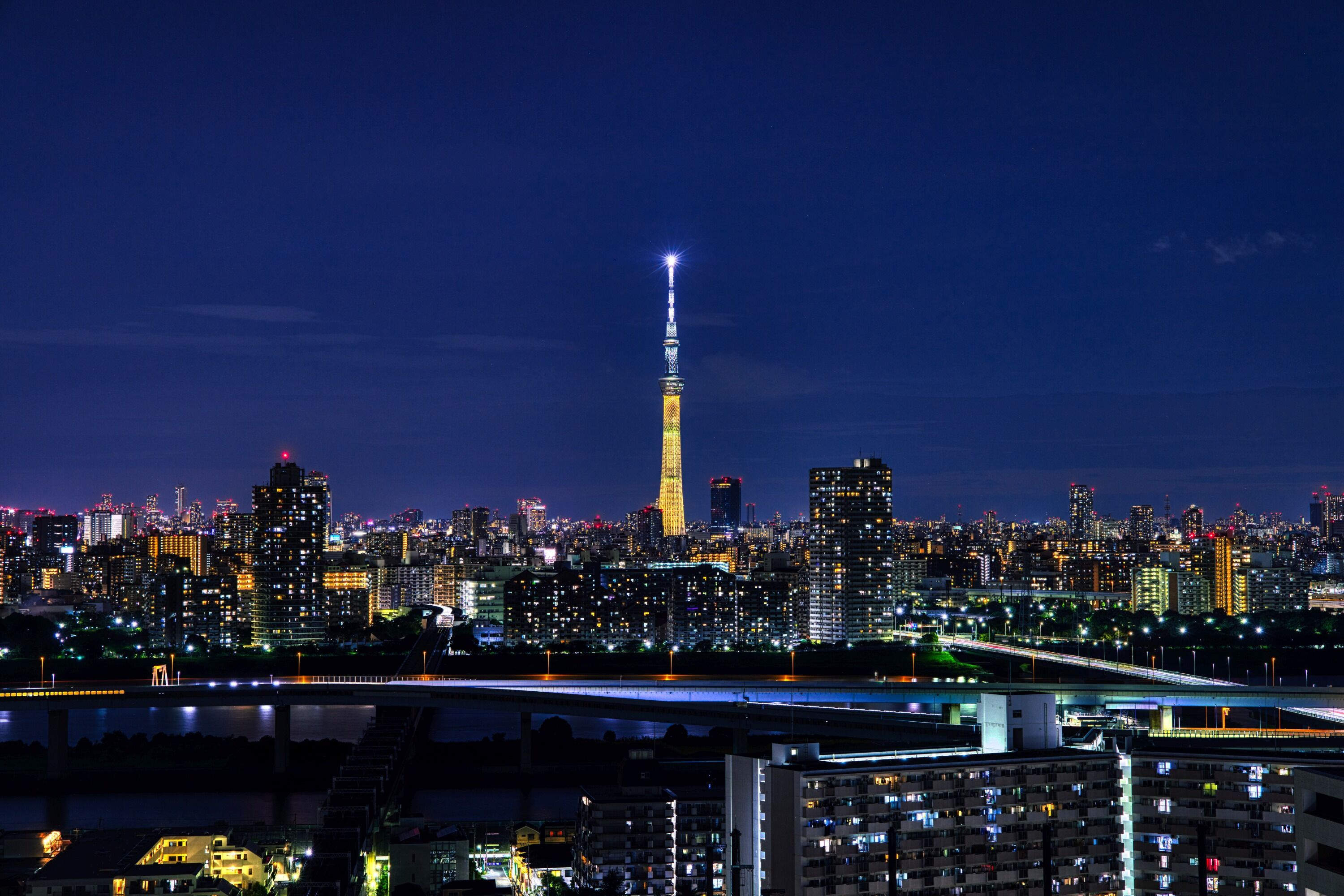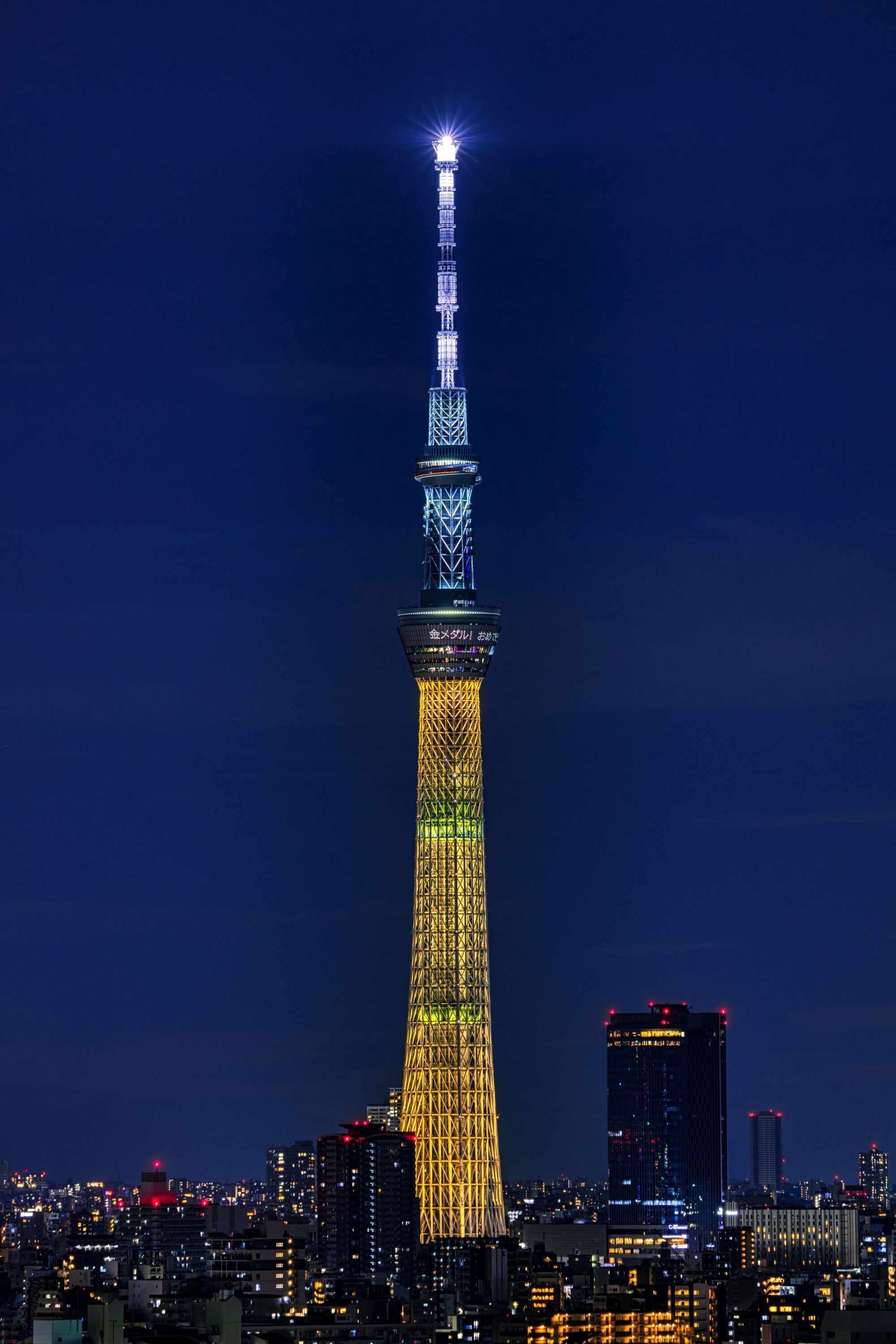 2024年7月29日、自宅マンションから撮影した東京スカイツリー夜景です。昨夜はパリ五輪の柔道男子66キロ級の阿部一二三選手、スケートボード女子ストリートの吉沢恋選手、フェンシング男子エペ個人の加納虹輝選手が金メダル獲得したことを祝して、東京スカイツリーは金メダルをイメージした特別ライティングが点灯しました。