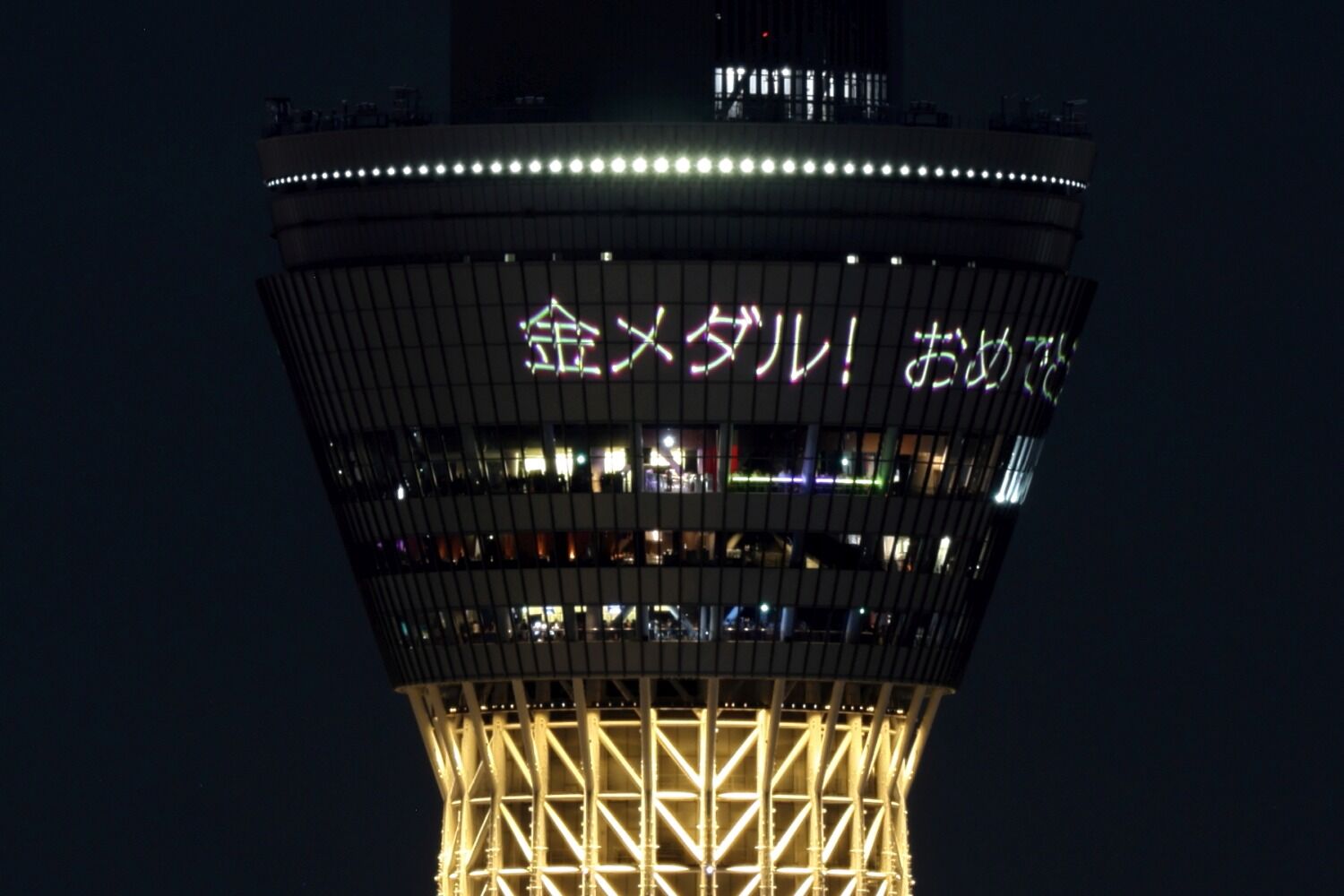 天望デッキには「金メダル!おめでとう!」の文字が映し出されていました。