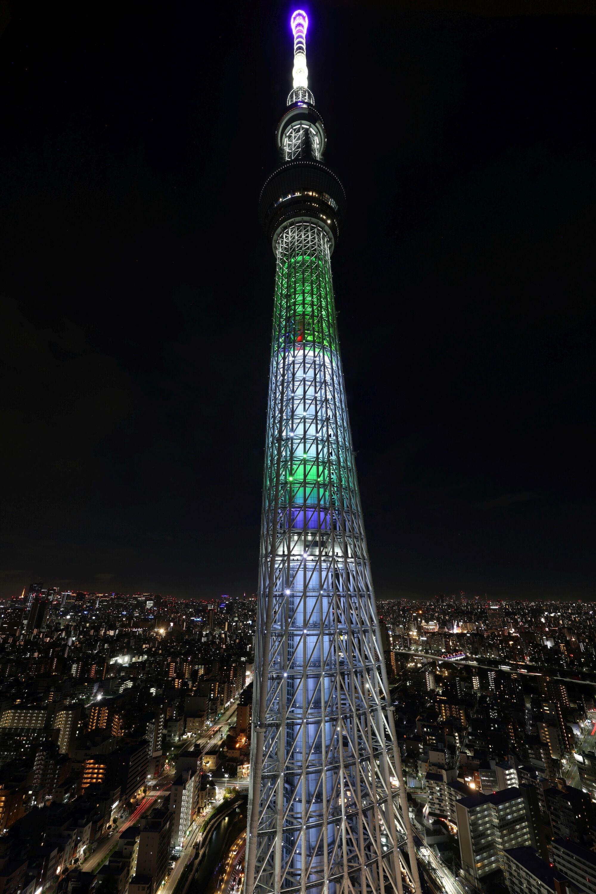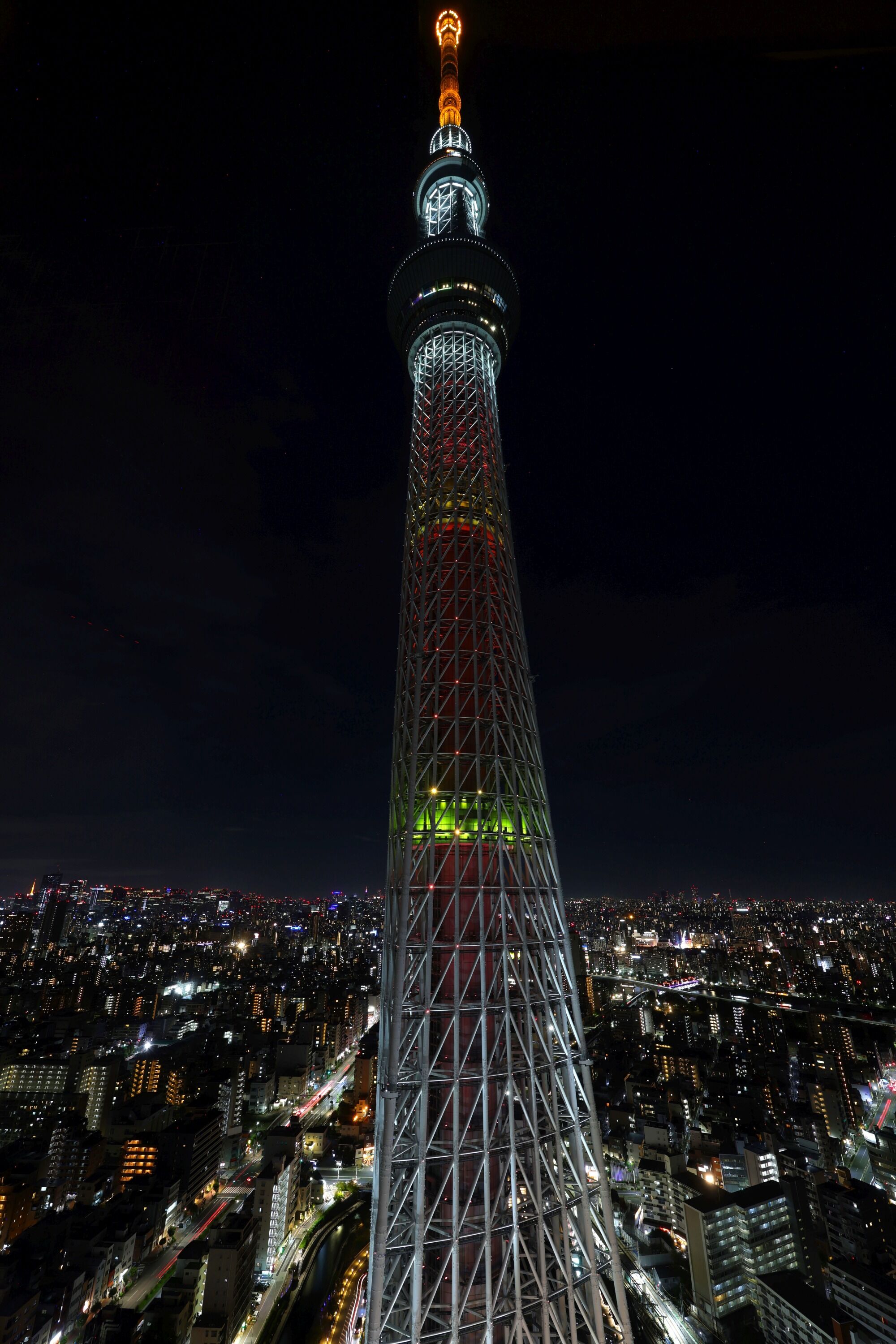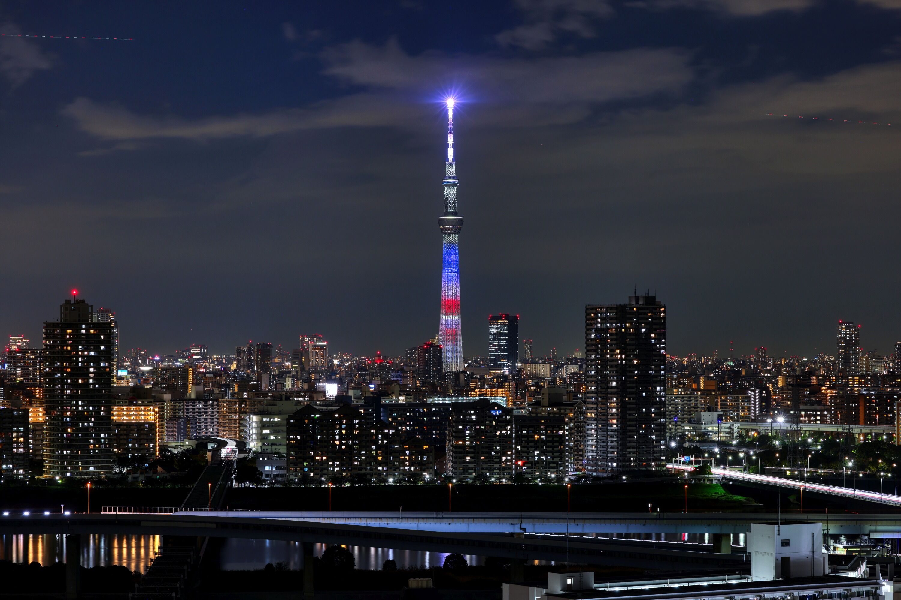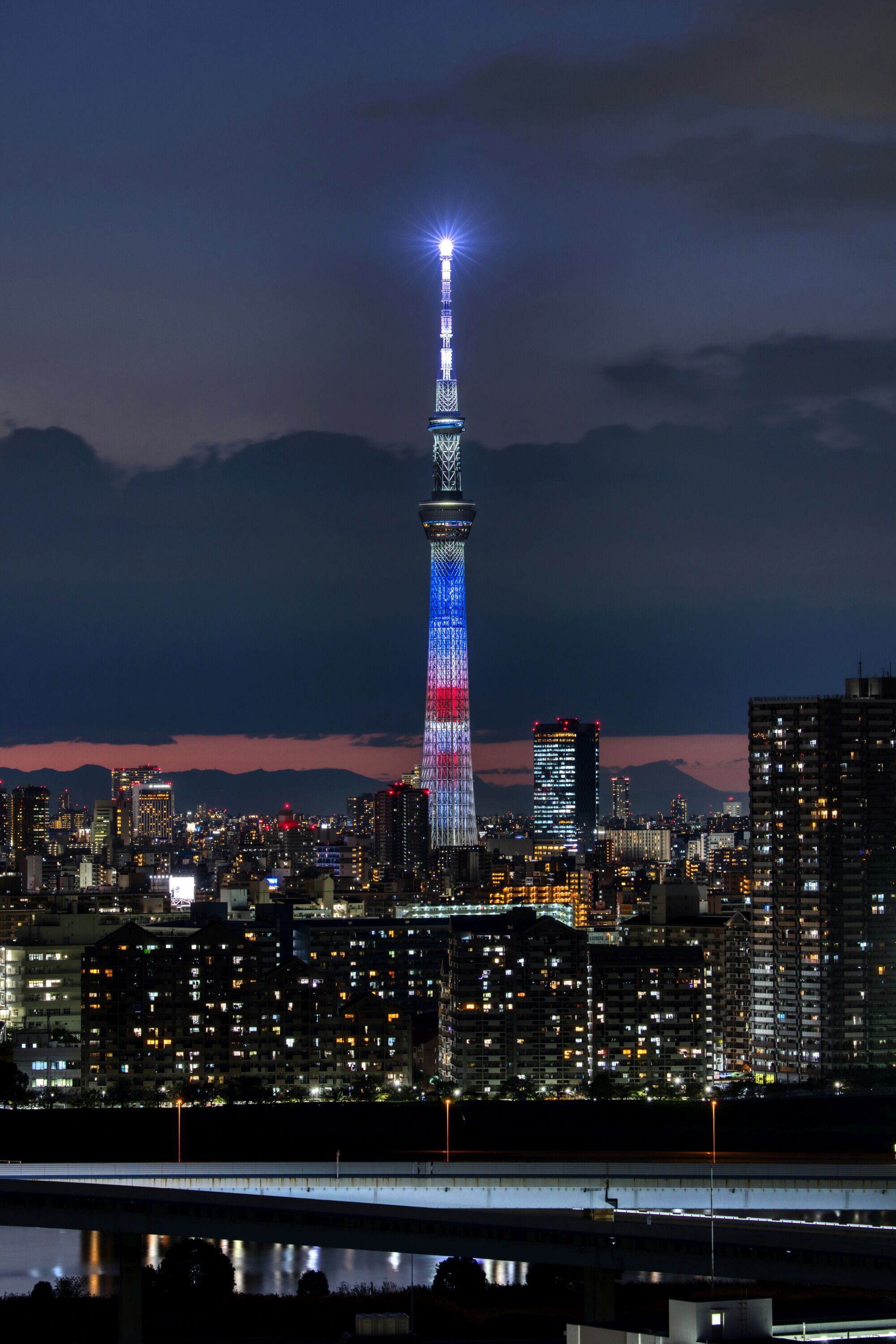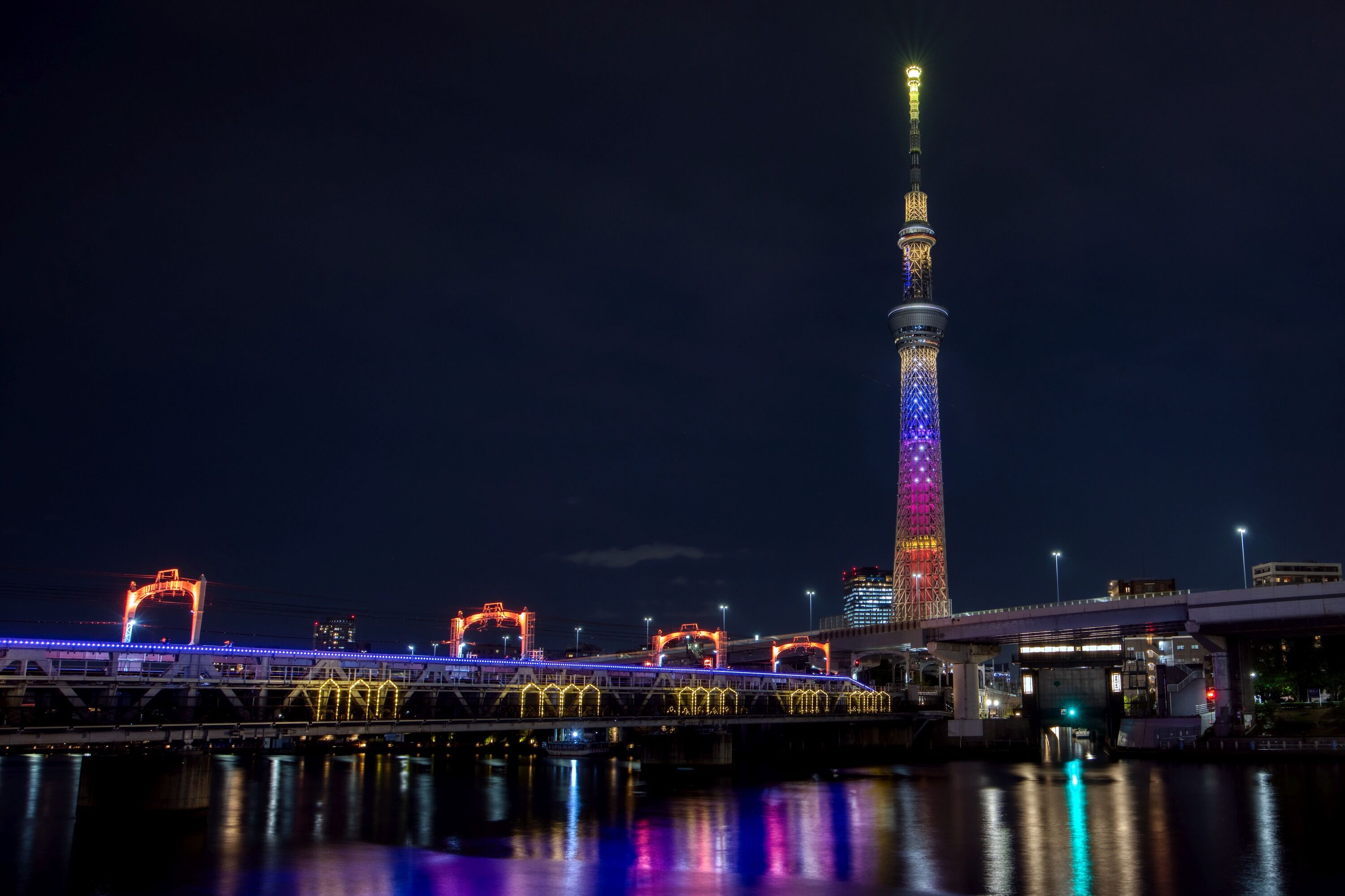 2025年10月29日、隅田川橋梁と東京スカイツリー夜景です。この日はハロウィン限定ライティングで、隅田川橋梁もハロウィンっぽいライティングになっていました。こちらはミステリアスで幻想的な月夜をイメージした「ムーンライト・ハロウィン」です。
