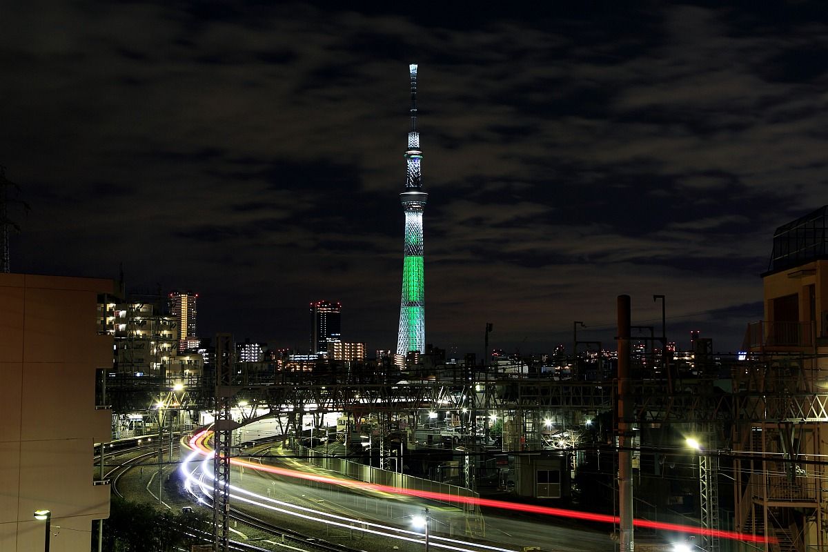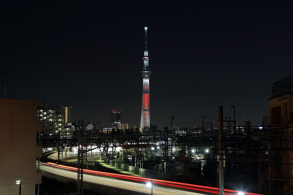 ちょっと古いですがまだ載せていない写真があるのでクリスマス特別ライトアップに戻ります。これは2012年12月22日、「東京スカイツリー」のクリスマス特別ライトアップ「ホワイトツリー」です。荒川土手沿いの歩道から鐘ヶ淵駅に出入りする電車と一緒に撮りました。