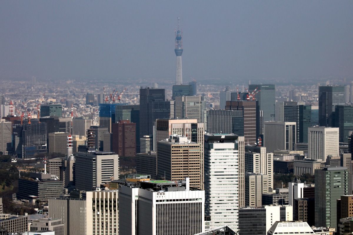 東京マラソンの前日、2月26日に「六本木ヒルズ」から見たスカイツリーです。東京駅周辺の超高層ビル群の後ろに見えました。