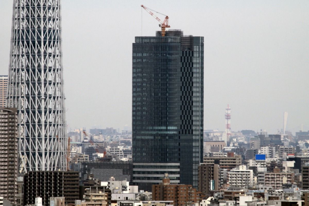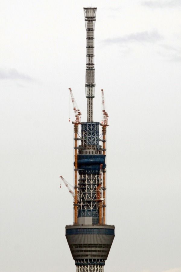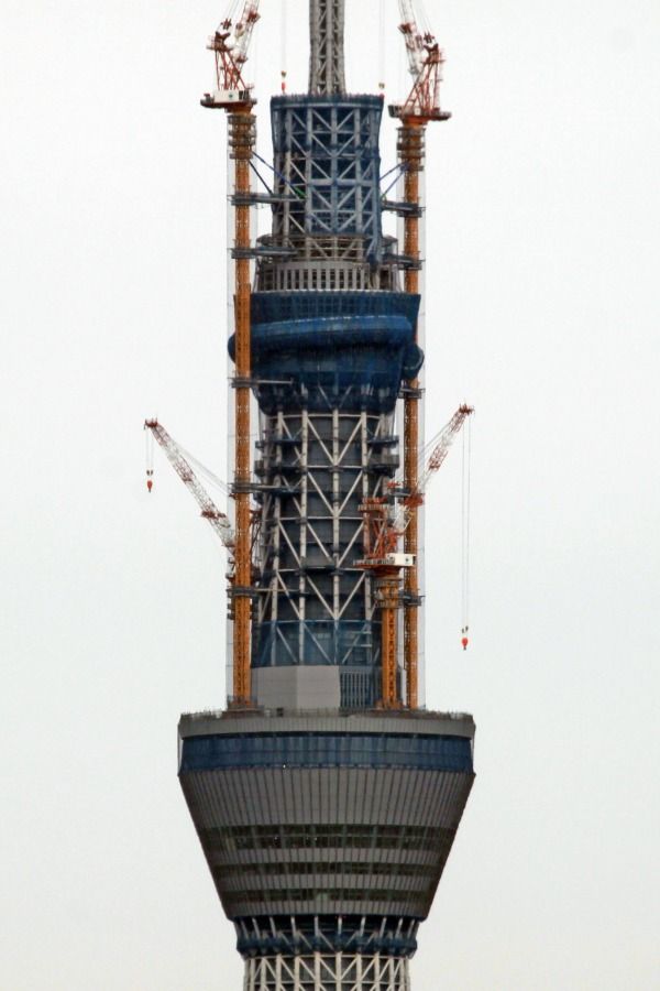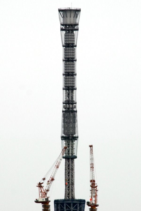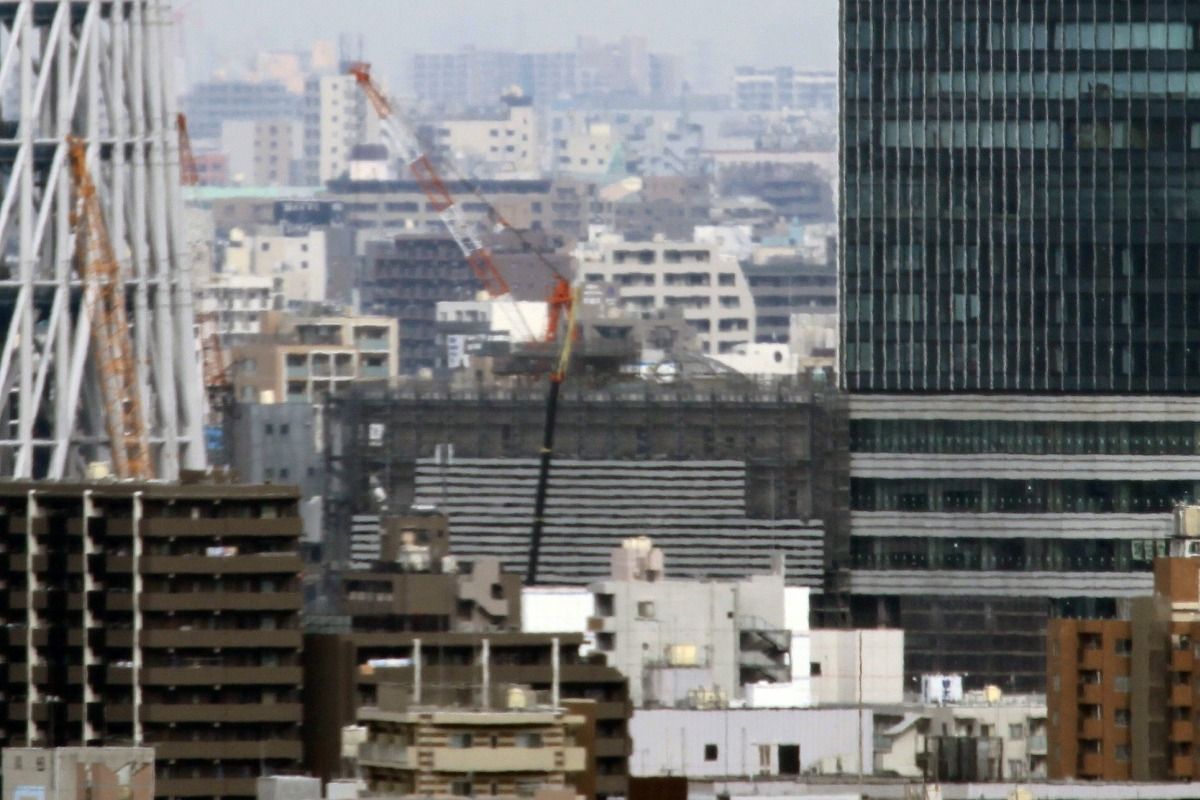 キレイに撮れませんでしたがイーストタワーとスカイツリーの間の超望遠です。タワークレーンの右側にプラネタリウムの骨組みが見えて来たのがわかるでしょうか?ここには多機能型ドームシアター「コニカミノルタプラネタリウム“天空”in 東京スカイ ツリータウン」というのが出来ます。スカイツリータウン内には水族館も出来るので、展望台、プラネタリウム、水族館でまるで池袋のサンシャインシティみたいです。