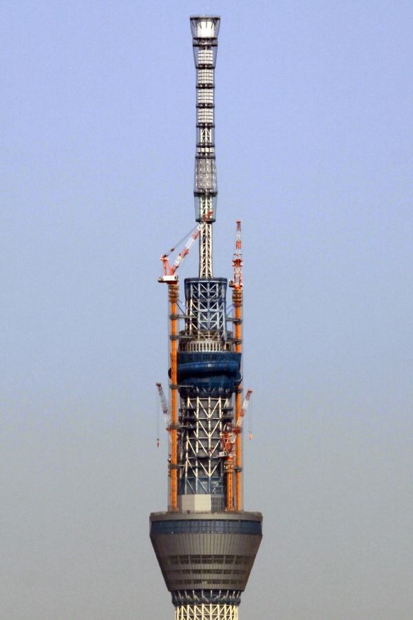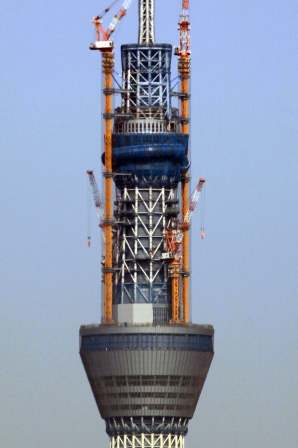 イーストタワーとスカイツリーの間の超望遠です。タワークレーンの右側にプラネタリウムのドームの骨組みがだいたい出来たように見えます。