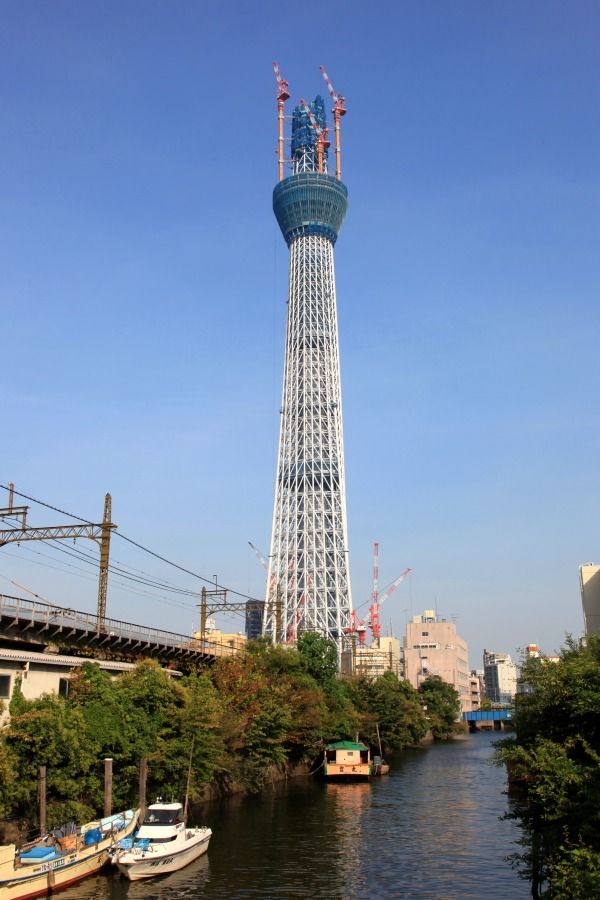 源森橋から見たスカイツリーです。周りに超高層ビルやタワーマンションがあれば比較しやすいのですが、スカイツリーがドーンと建っているだけなので、現在の高さを知らない人が見れば高さ450m以上もあるようには見えないでしょうね。
