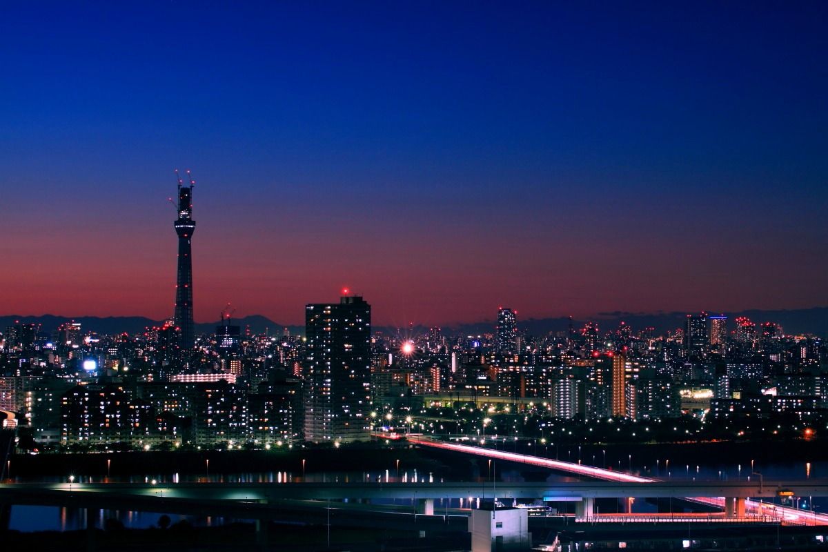 そしてトワイライトな夜景に浮かび上がるスカイツリーです。赤と青のグラデーションがキレイです。