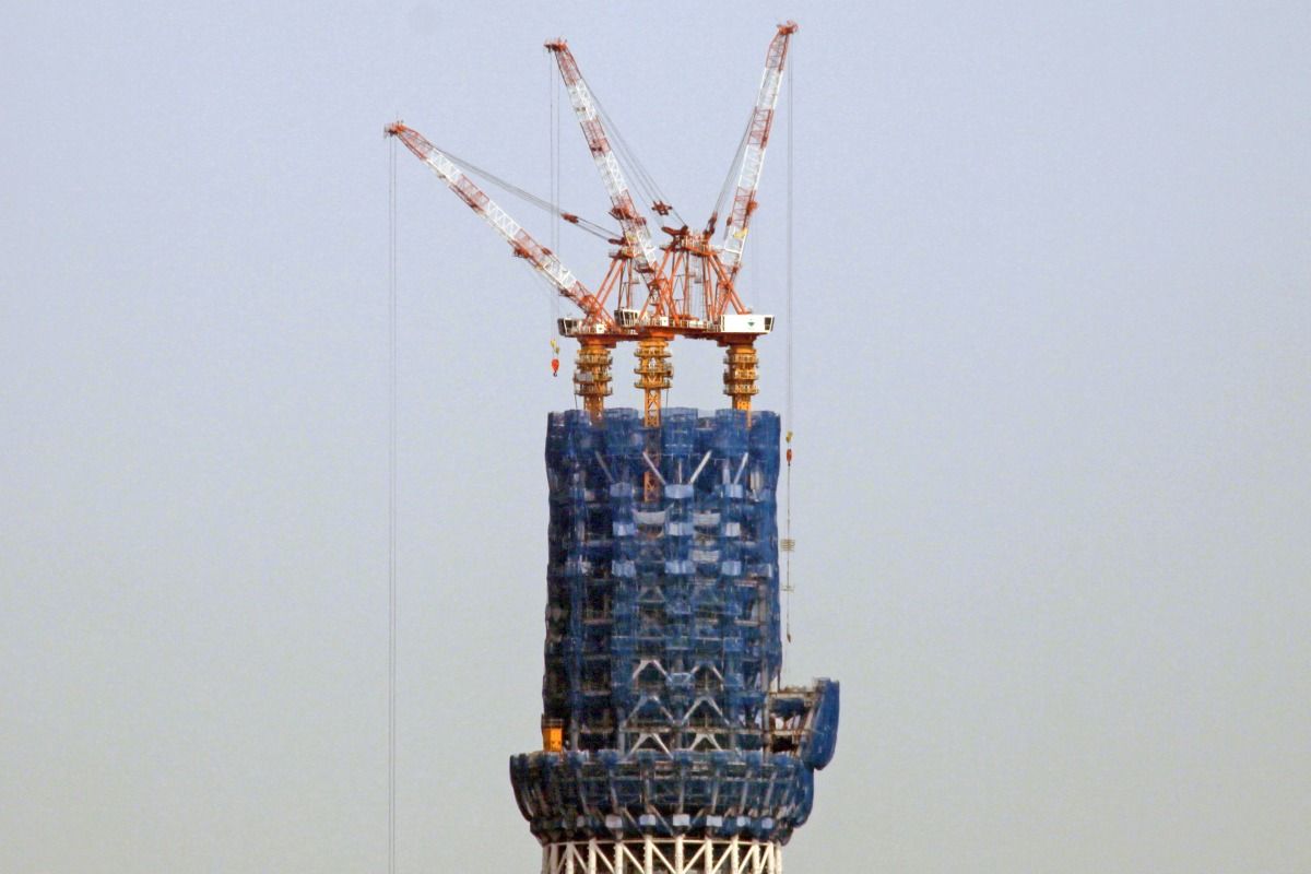 あの黄色いボックスみたいなのは、タワー上と地上を往復しています。仮設材を搬出しているような感じですが・・・(信頼度20%程度)