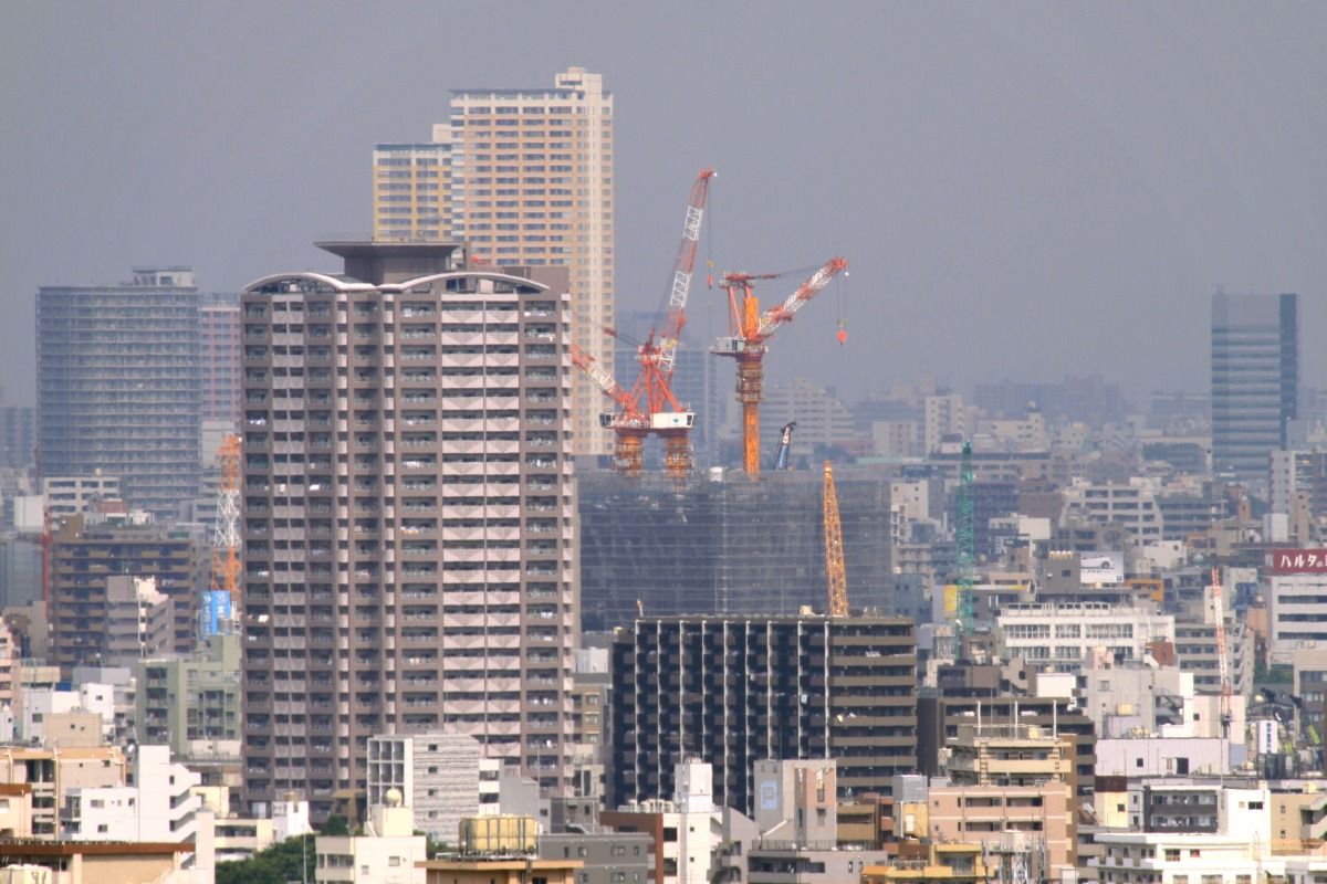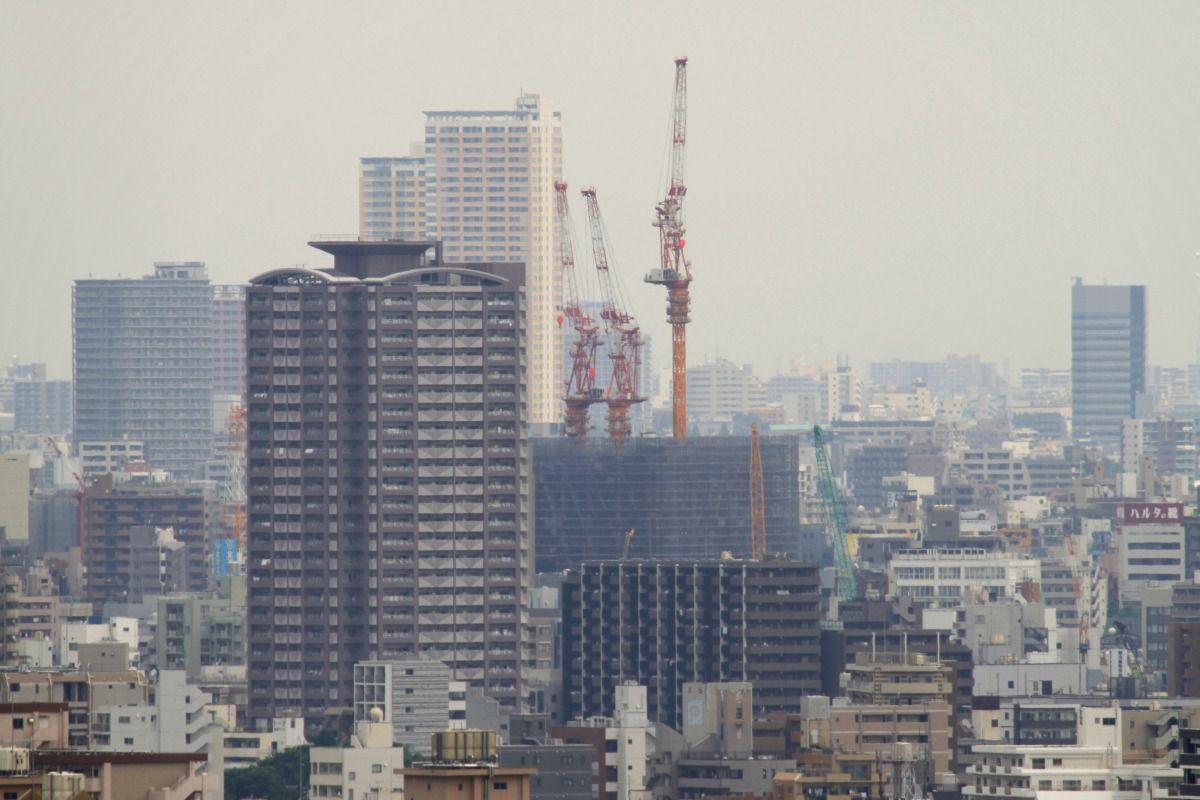 超望遠で見るとタワークレーンがクライミングしているのがわかります。タワークレーンが伸びるときは、上に継ぎ足した支柱を本体がクライミングして行きます。