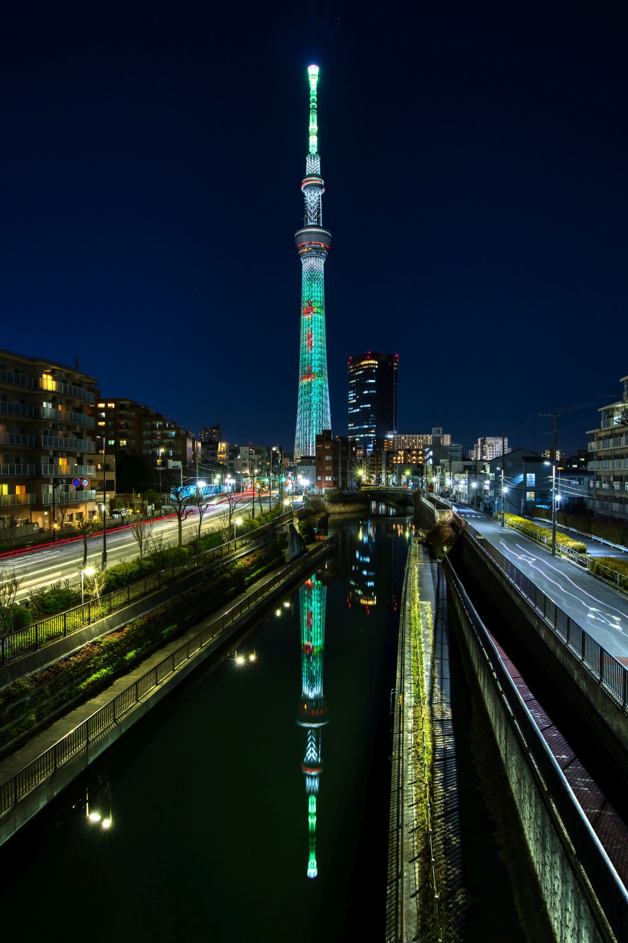 2022年1月24日、柳島歩道橋から撮影した東京スカイツリー夜景です。この日はHey!Say!JUMPの山田涼介さん主演の映画『大怪獣のあとしまつ』のPRイベントが東京スカイツリーの天望デッキで行われ、それを記念した大怪獣カラーの特別ライティングが点灯しました。