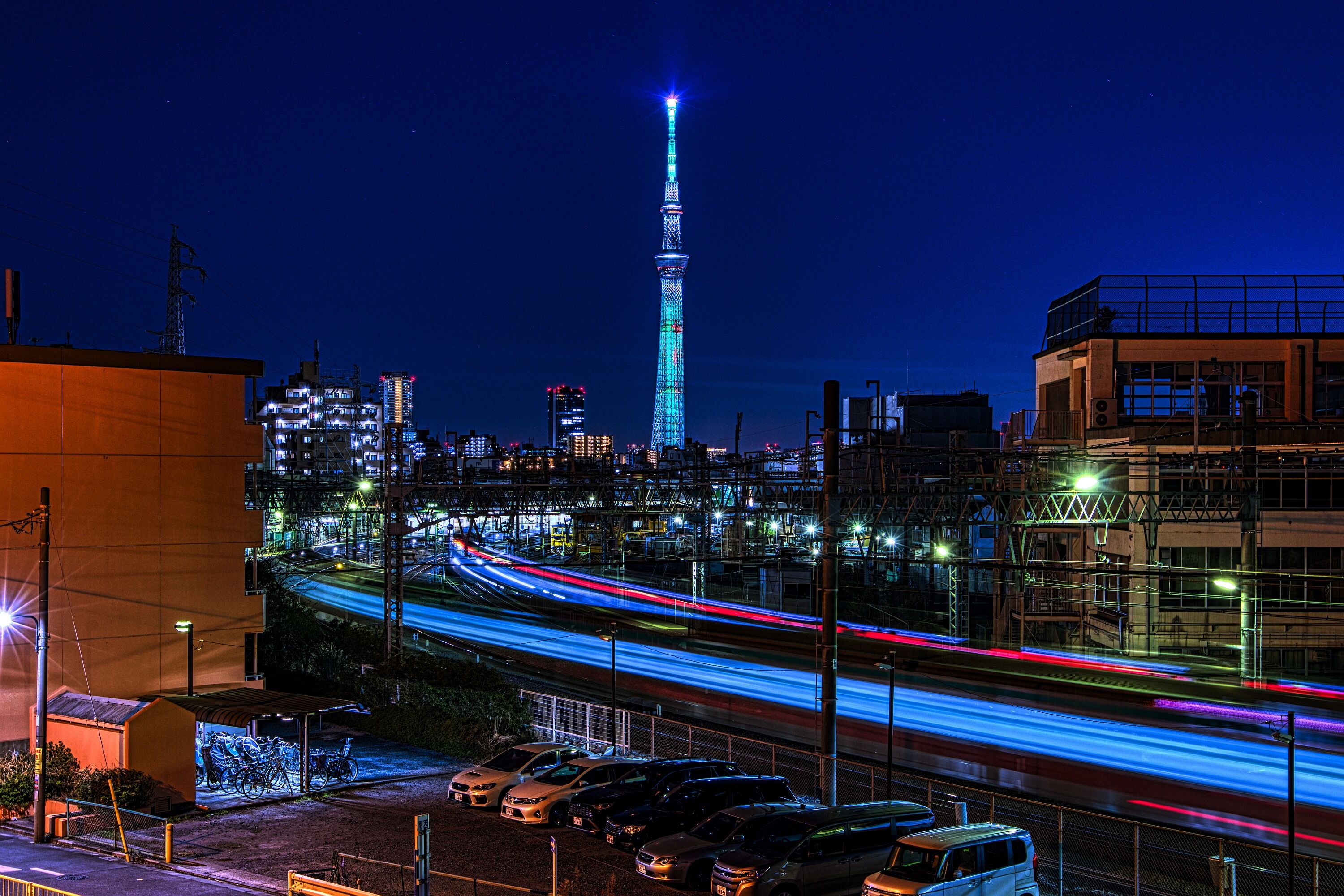 2022年1月24日、鐘ケ淵から撮影した東京スカイツリー夜景です。この日はHey!Say!JUMPの山田涼介さん主演の映画『大怪獣のあとしまつ』のPRイベントが東京スカイツリーの天望デッキで行われ、それを記念した大怪獣カラーの特別ライティングが点灯しました。
