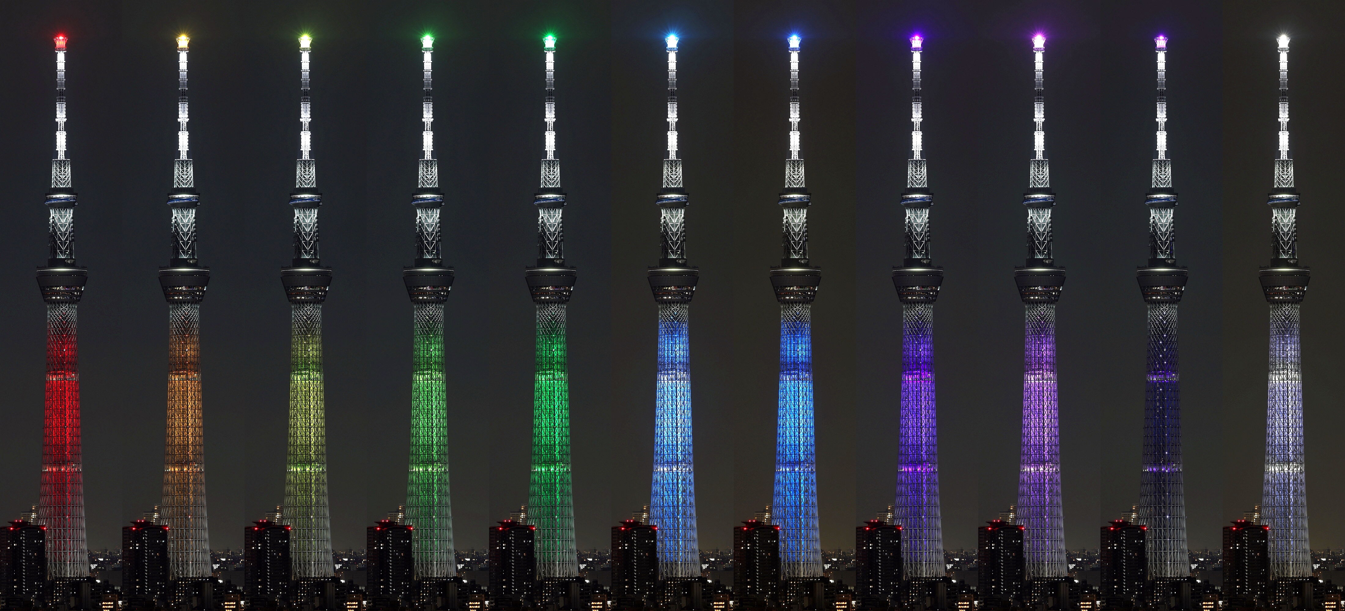 2023年7月20日、自宅マンションから撮影した東京スカイツリーの「さまざまな推しのメンバーカラーをイメージした特別ライティング」です。全11種の推し色ライティングが約30秒ごとに移り変わり点灯するライティングで、その11種の入りを並べてみました。