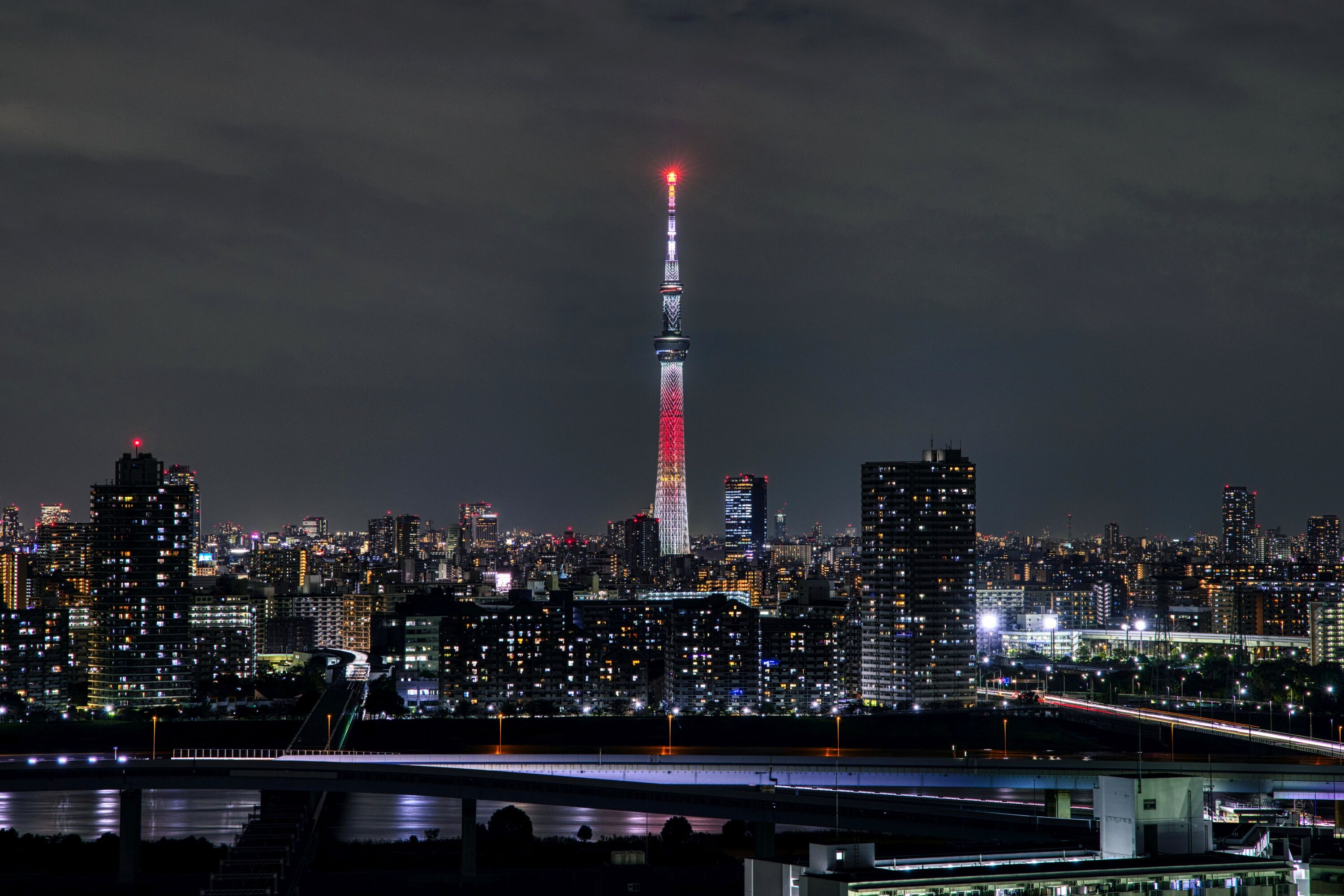 柳島歩道橋から撮影した東京スカイツリーのハロウィン限定ライティング(2025年10月29日)