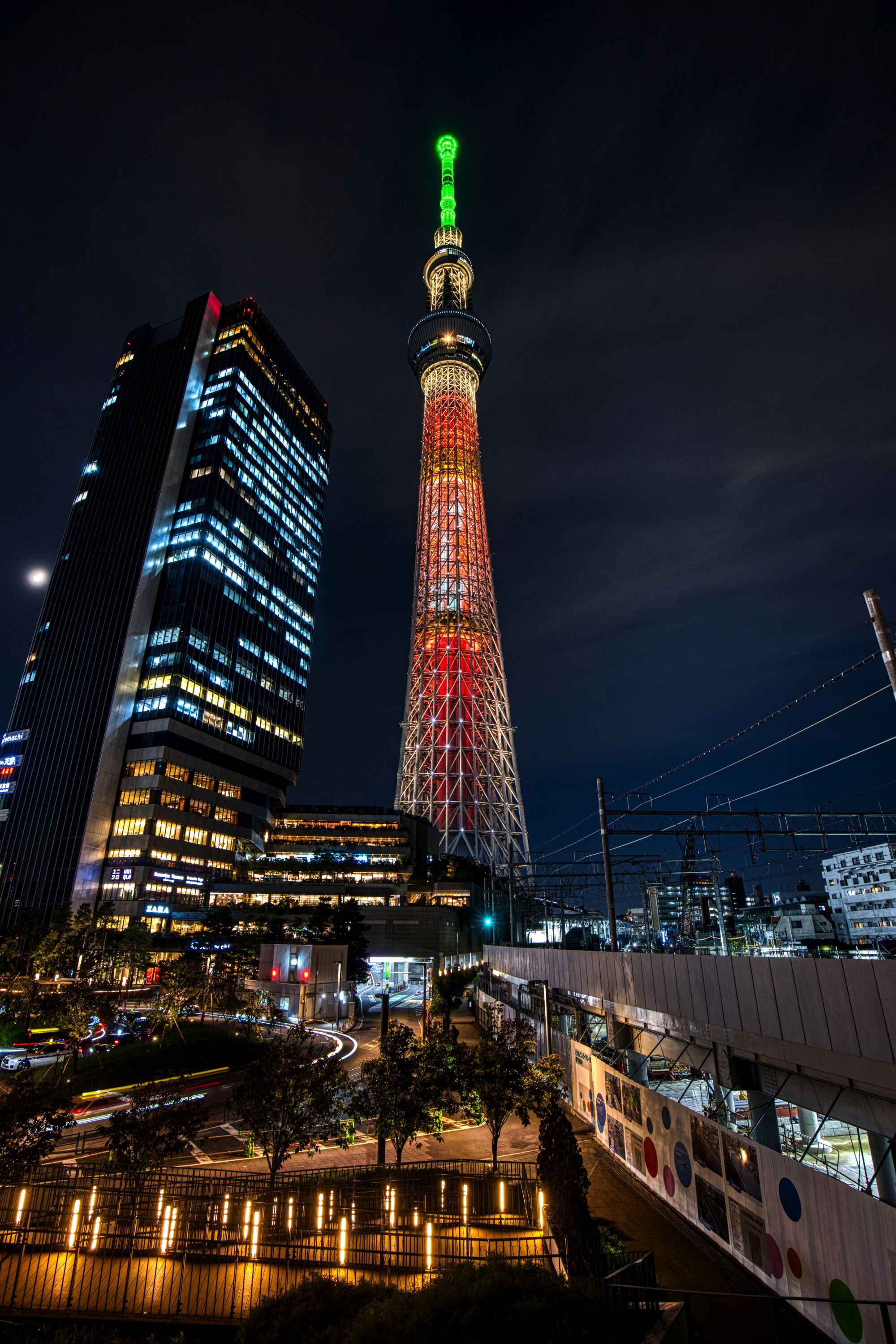 柳島歩道橋から撮影した東京スカイツリーのハロウィン限定ライティング(2025年10月29日)