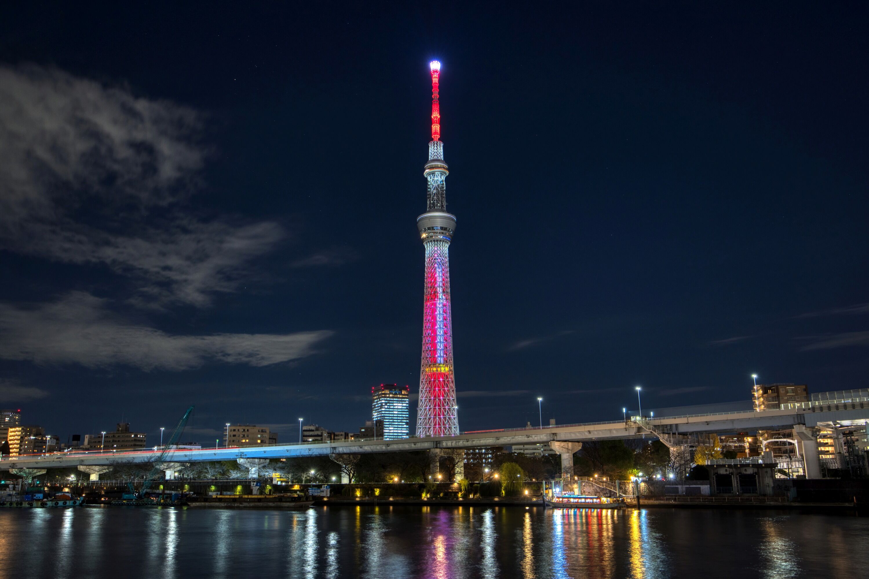 隅田川護岸から撮影した隅田川橋梁と東京スカイツリーのクリスマス特別ライティング(2025年12月18日)