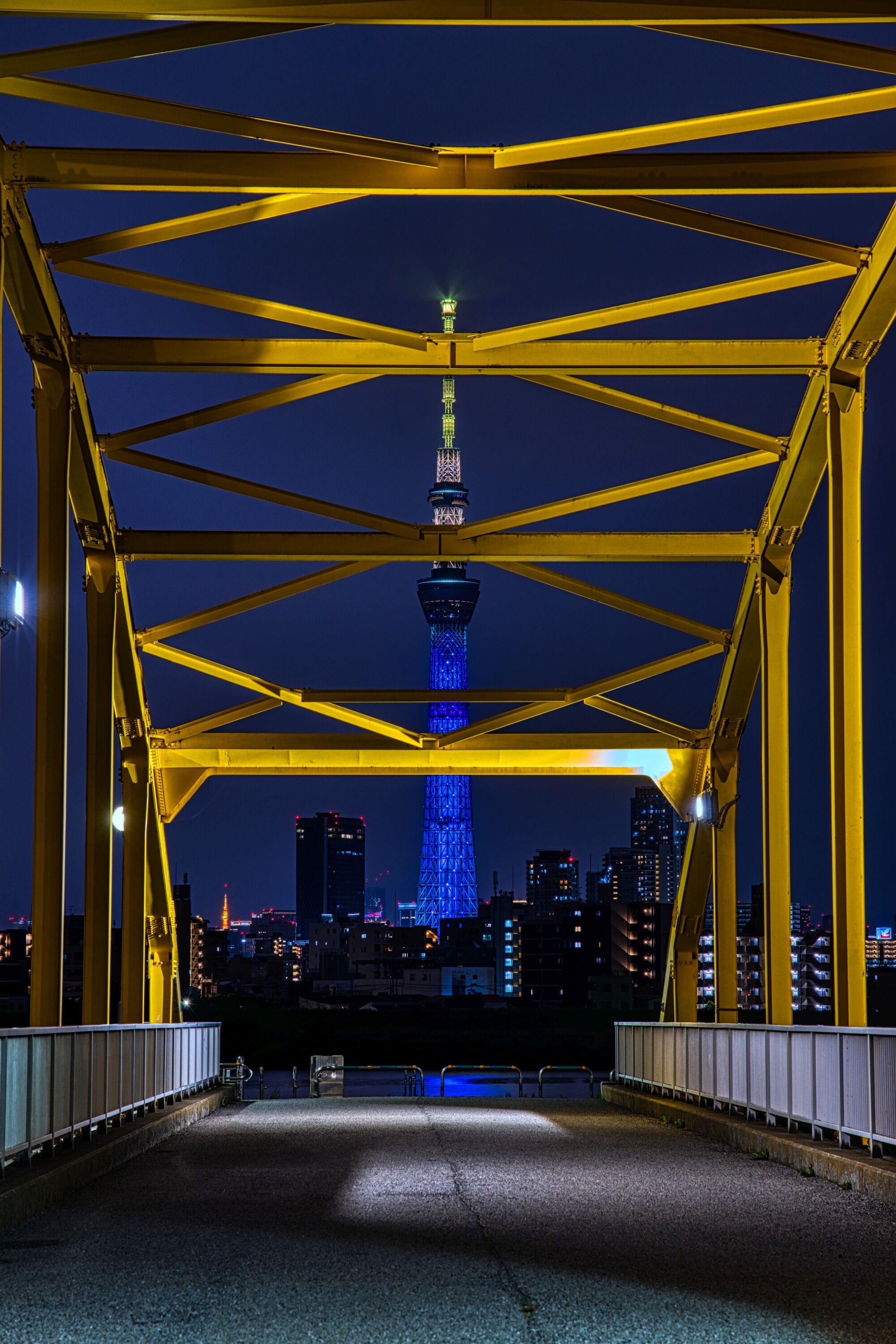 本当は月とスカイツリーが同じ高さに並んだときに撮りたかったのですが、同ライティングは22時までだったので無理でした。この縦構図は21時59分の撮影です。