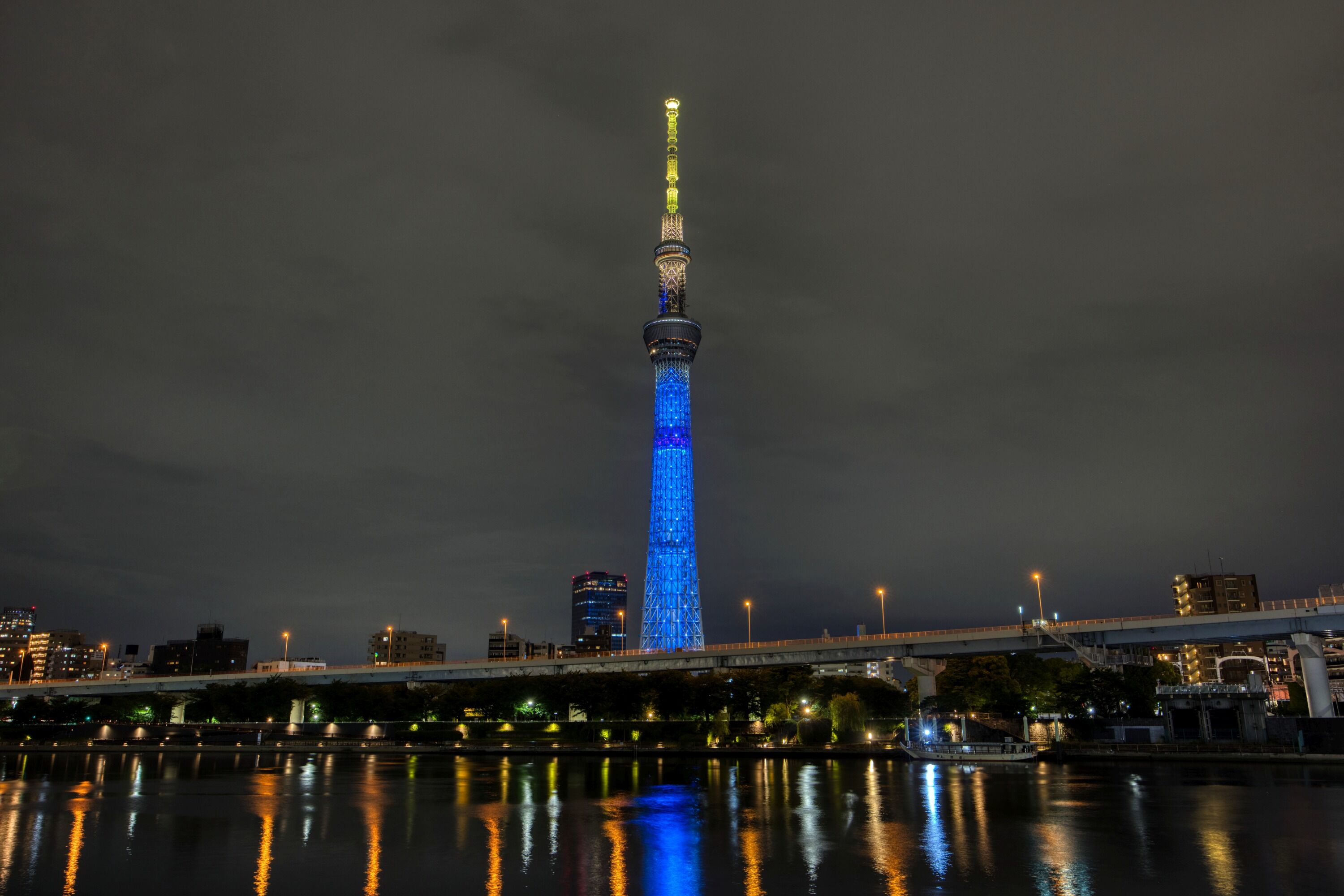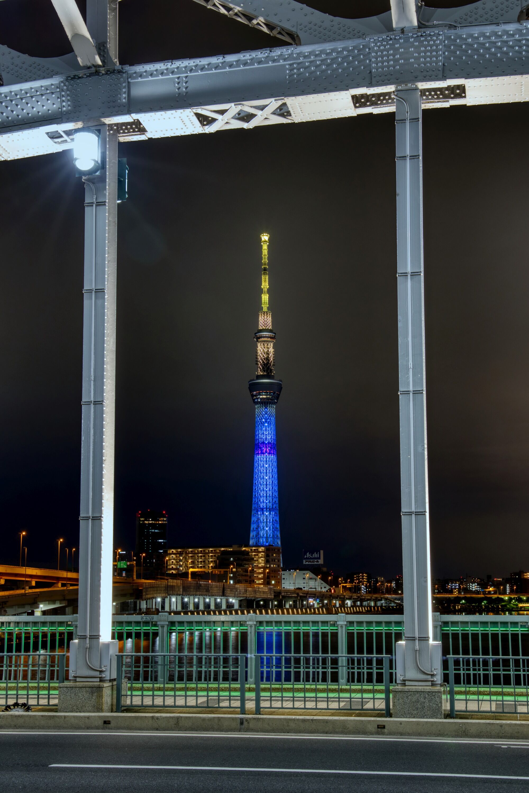 2022年5月8日に白髭橋から撮影した東京スカイツリーです。この日は東京スカイツリータウン開業10周年を記念して東京スカイツリーの公式キャラクター「ソラカラちゃん」をイメージした特別ライティング「ソラカラちゃんライティング」でした。
