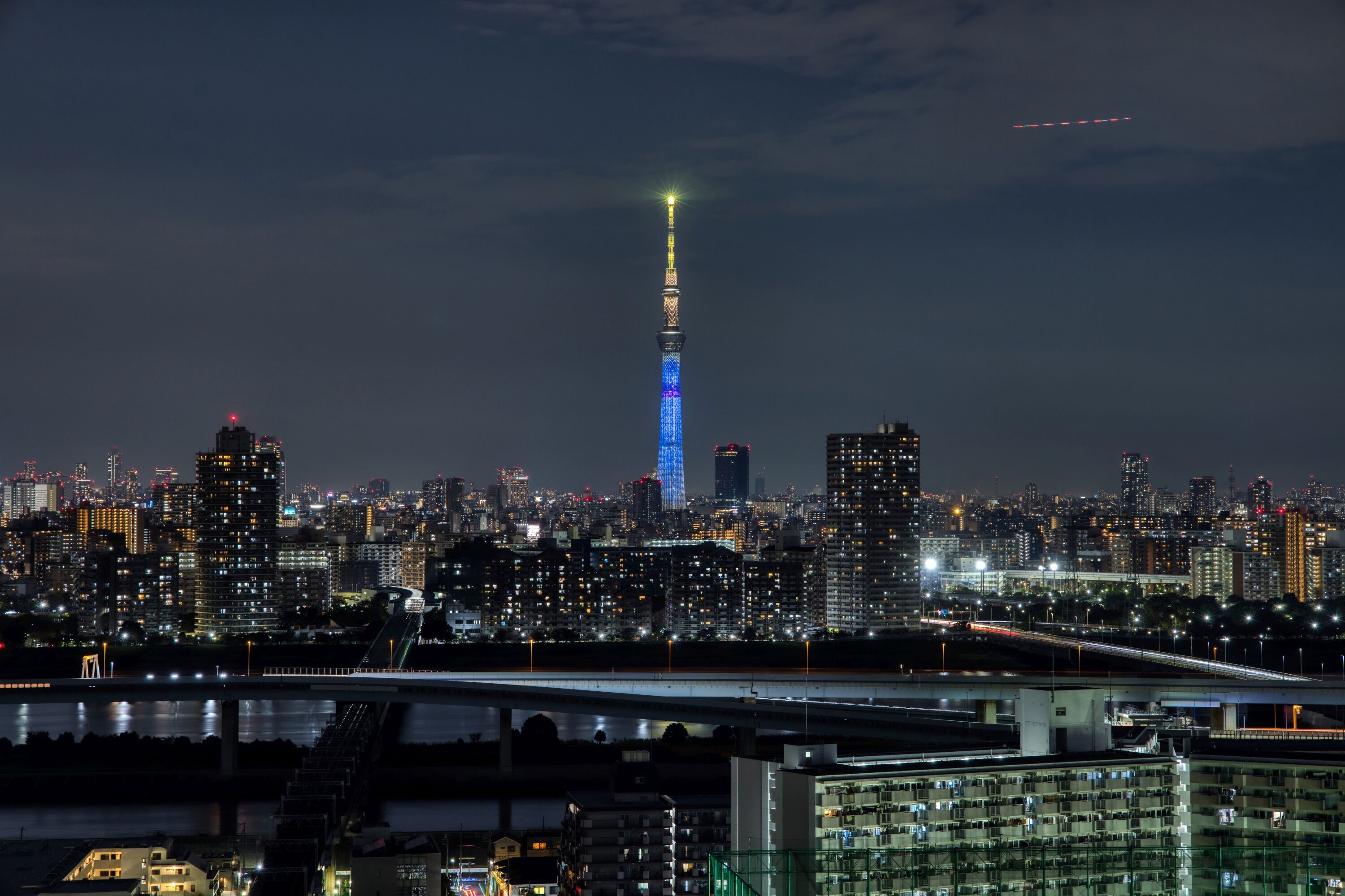 2022年5月8日に東四つ木避難橋から撮影した東京スカイツリーです。この日は東京スカイツリータウン開業10周年を記念して東京スカイツリーの公式キャラクター「ソラカラちゃん」をイメージした特別ライティング「ソラカラちゃんライティング」でした。