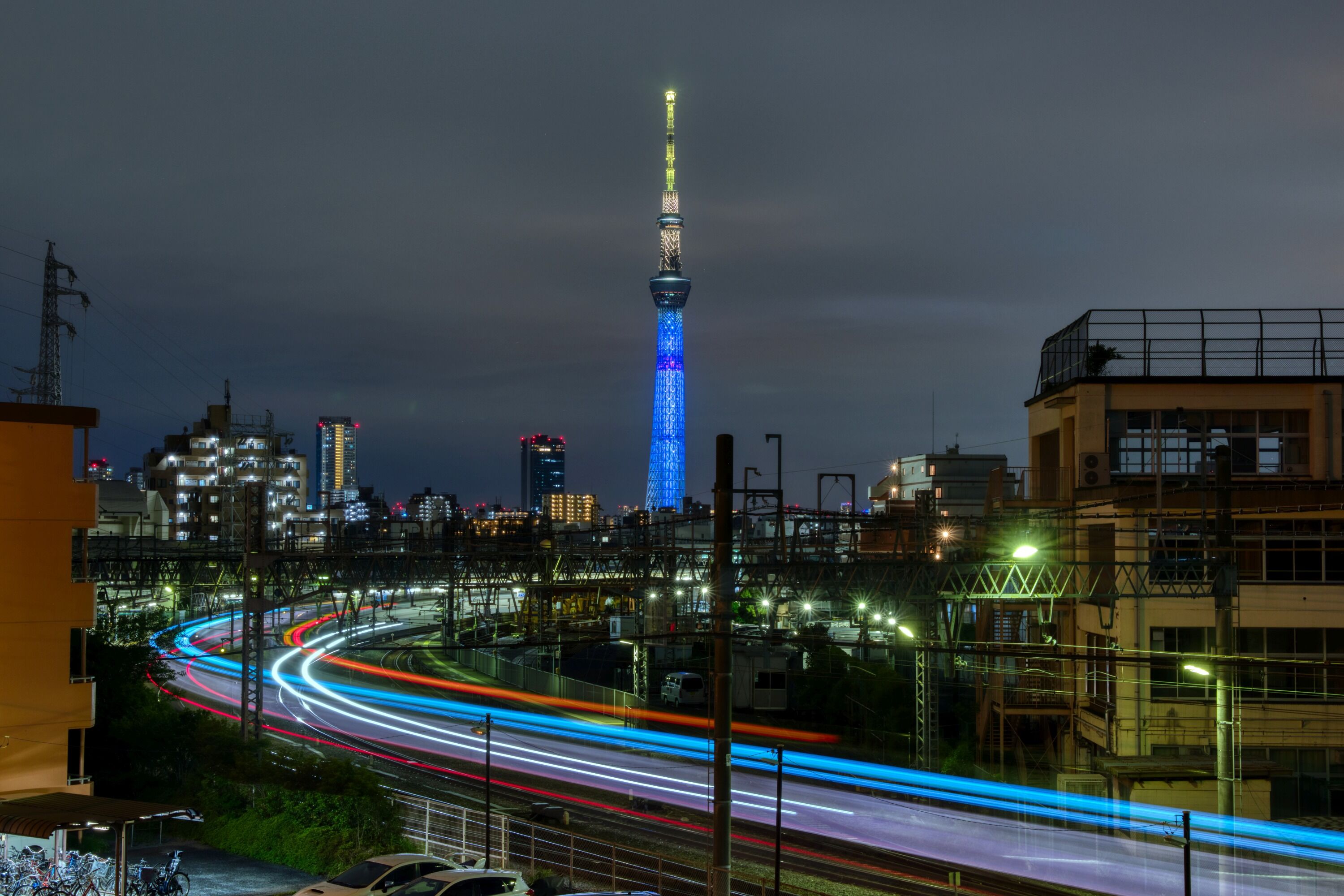 ここは東武スカイツリーライン「鐘ヶ淵」駅に出入りする電車の光跡を入れて撮るのが一番。ちょうど上りと下りの電車が来たタイミングで撮れると光跡が増えていい感じになります。ただ、タイミング良く電車が来るわけでもないので毎回結構な時間ここで撮っています。時刻表を見て調べてから来ればいいのかもしれませんが、ここは当観測所からは遠い場所のため行くのも一番最後。上りと下りが同時に来るかは毎回運頼みです。