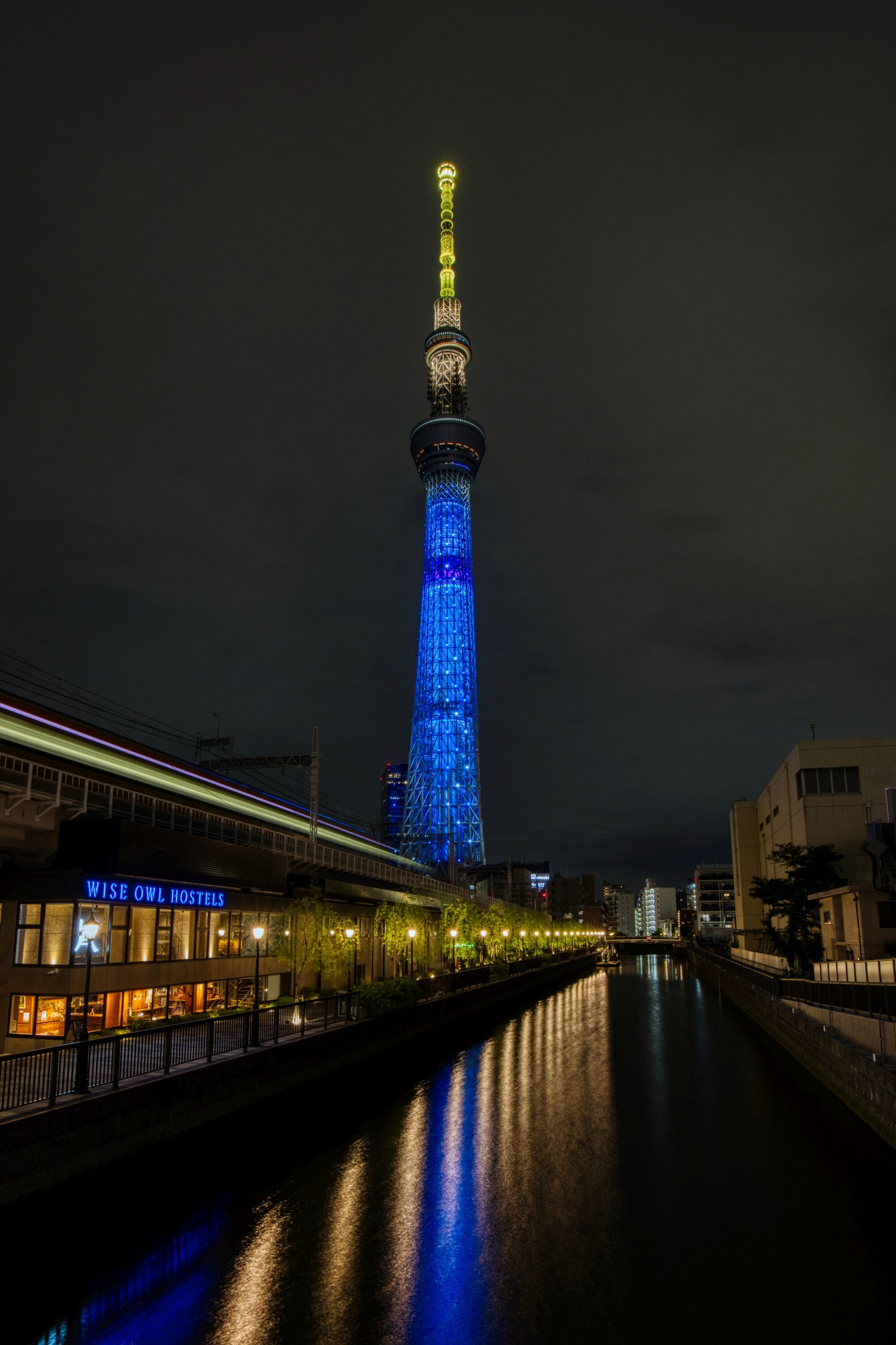 2022年5月8日に鐘ヶ淵から撮影した東京スカイツリーです。この日は東京スカイツリータウン開業10周年を記念して東京スカイツリーの公式キャラクター「ソラカラちゃん」をイメージした特別ライティング「ソラカラちゃんライティング」でした。