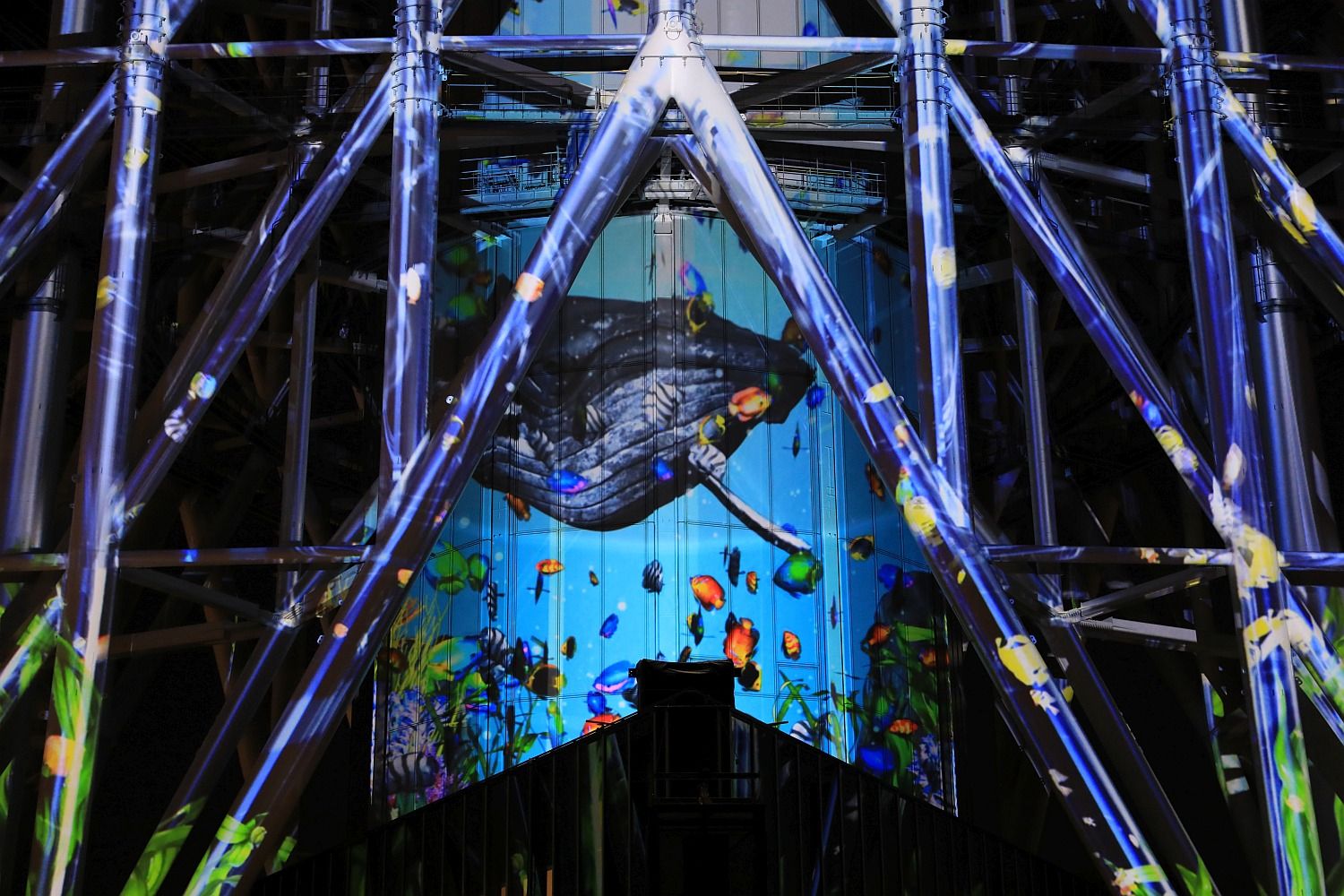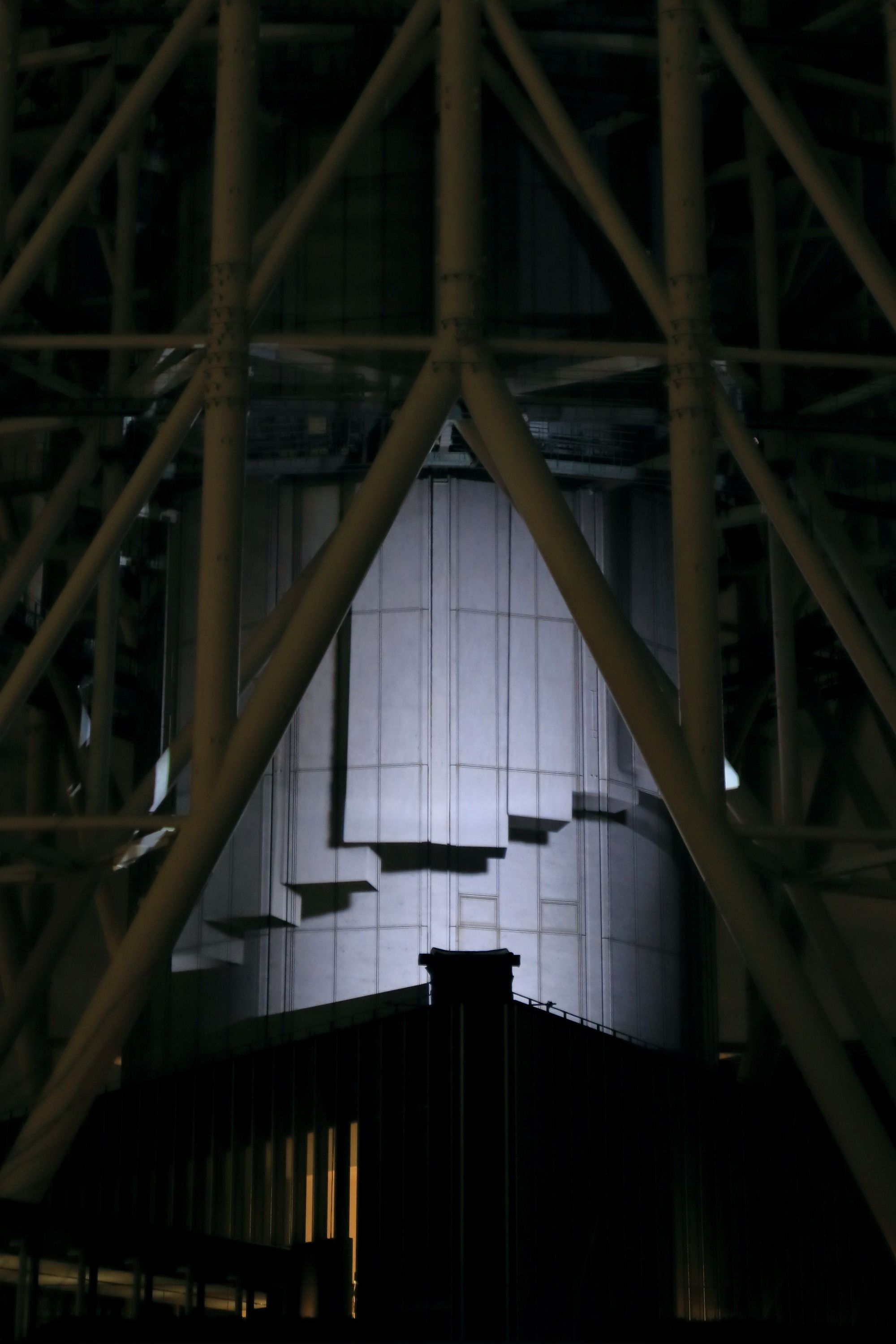 ここは昨日の動画を見てもらった方がわかりやすいですが、塔体の中を光の平面が移動するような演出でした。