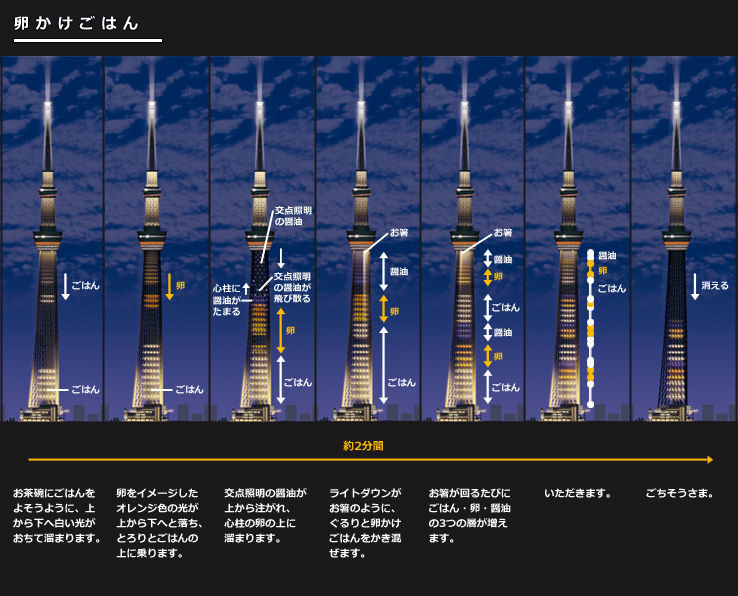 キッコーマンの協力のもと「炊き込みご飯」「お鍋」「卵かけごはん」の3種類が点灯とのことです。以下がそのライティングの詳細です。名称も面白いですが説明もなかなかのものです。