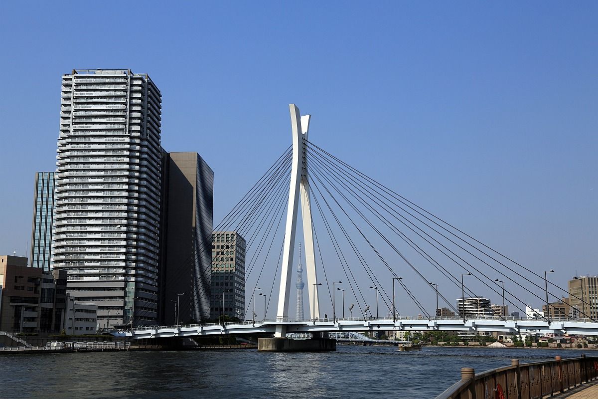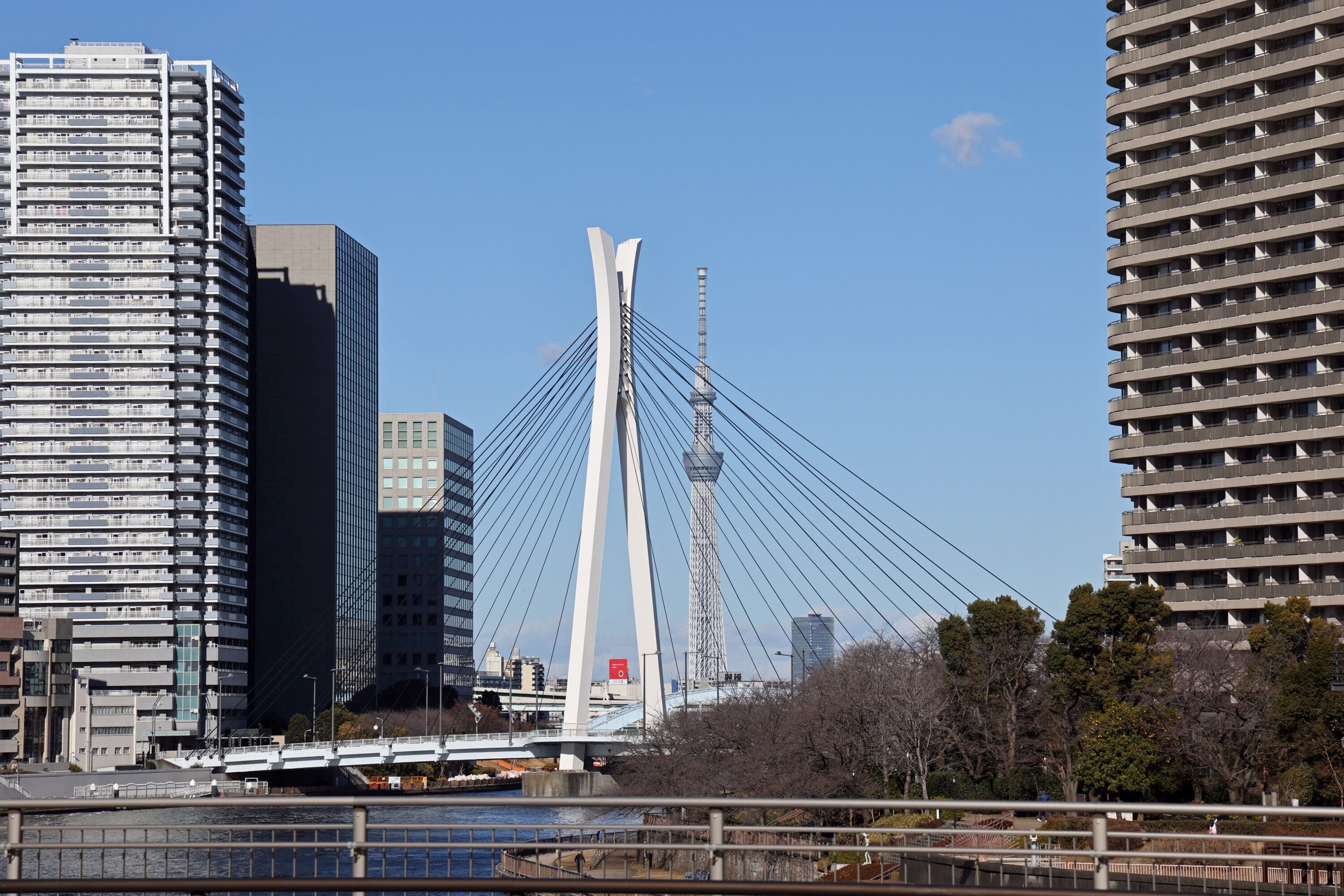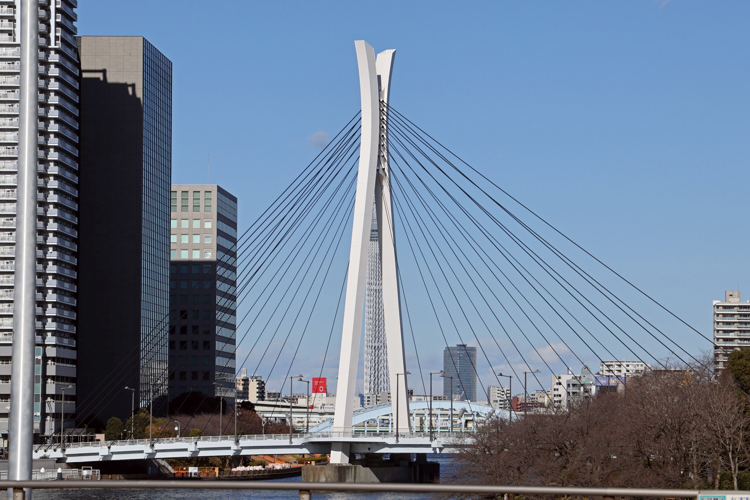 2025年2月8日に月島駅近くの佃大橋から撮影した東京スカイツリーと中央大橋です。