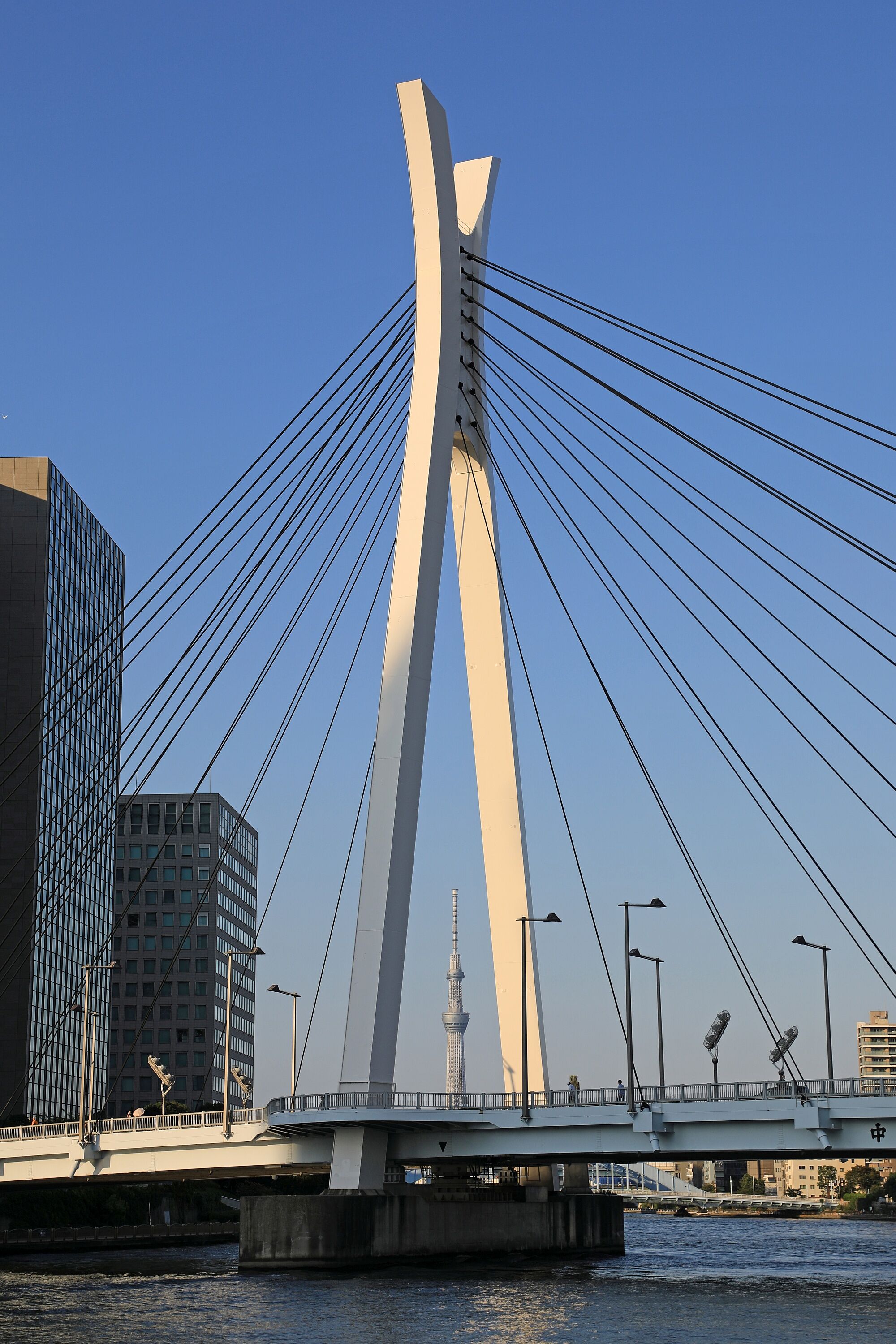中央大橋の橋脚の隙間に東京スカイツリーを入れて撮影。中央大橋と東京スカイツリーは何度か撮影していますがここから撮ったのは初めて。スカイツリーを隙間にぴったり合わせるには船から撮るしかなさそうです。