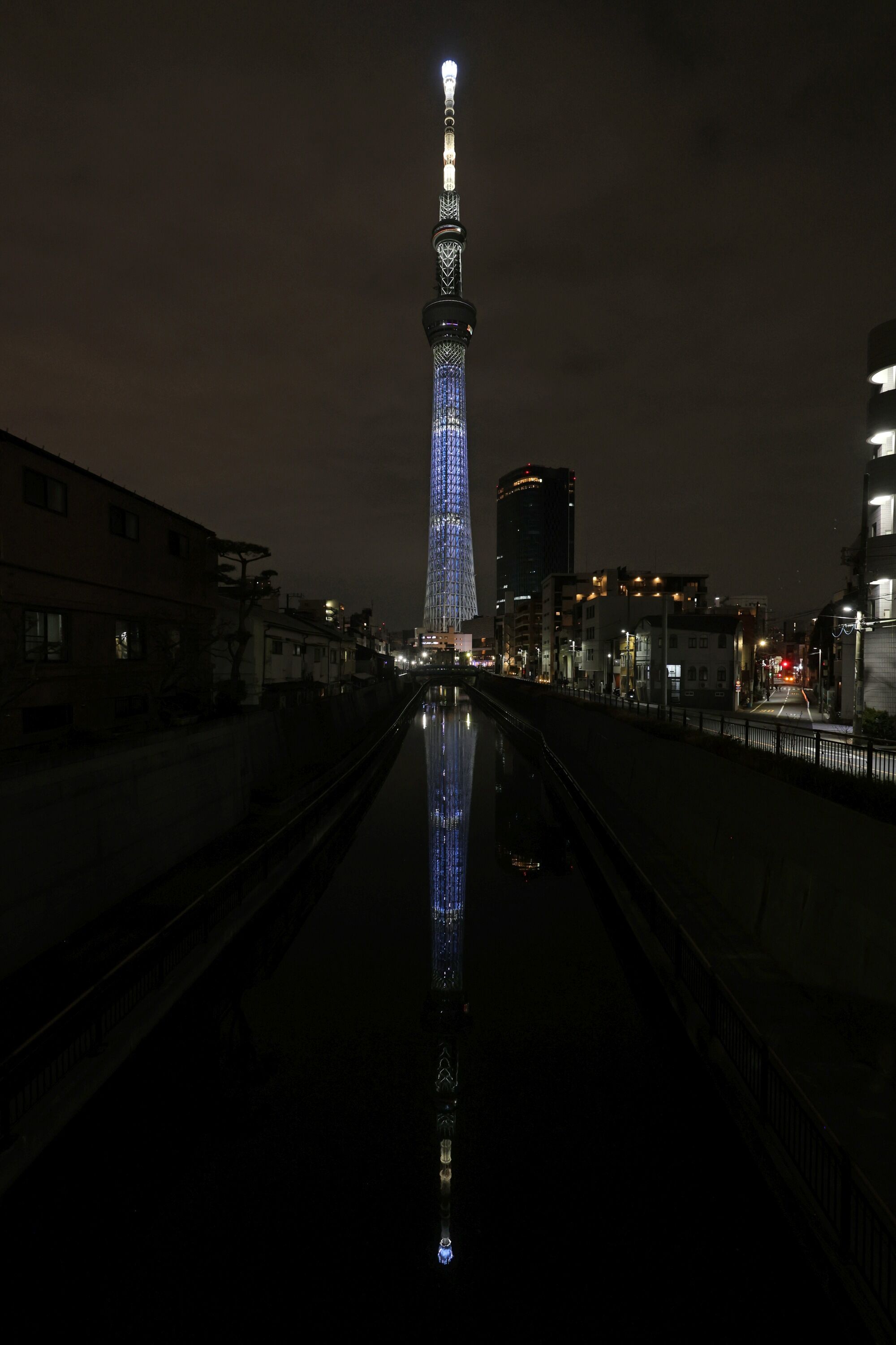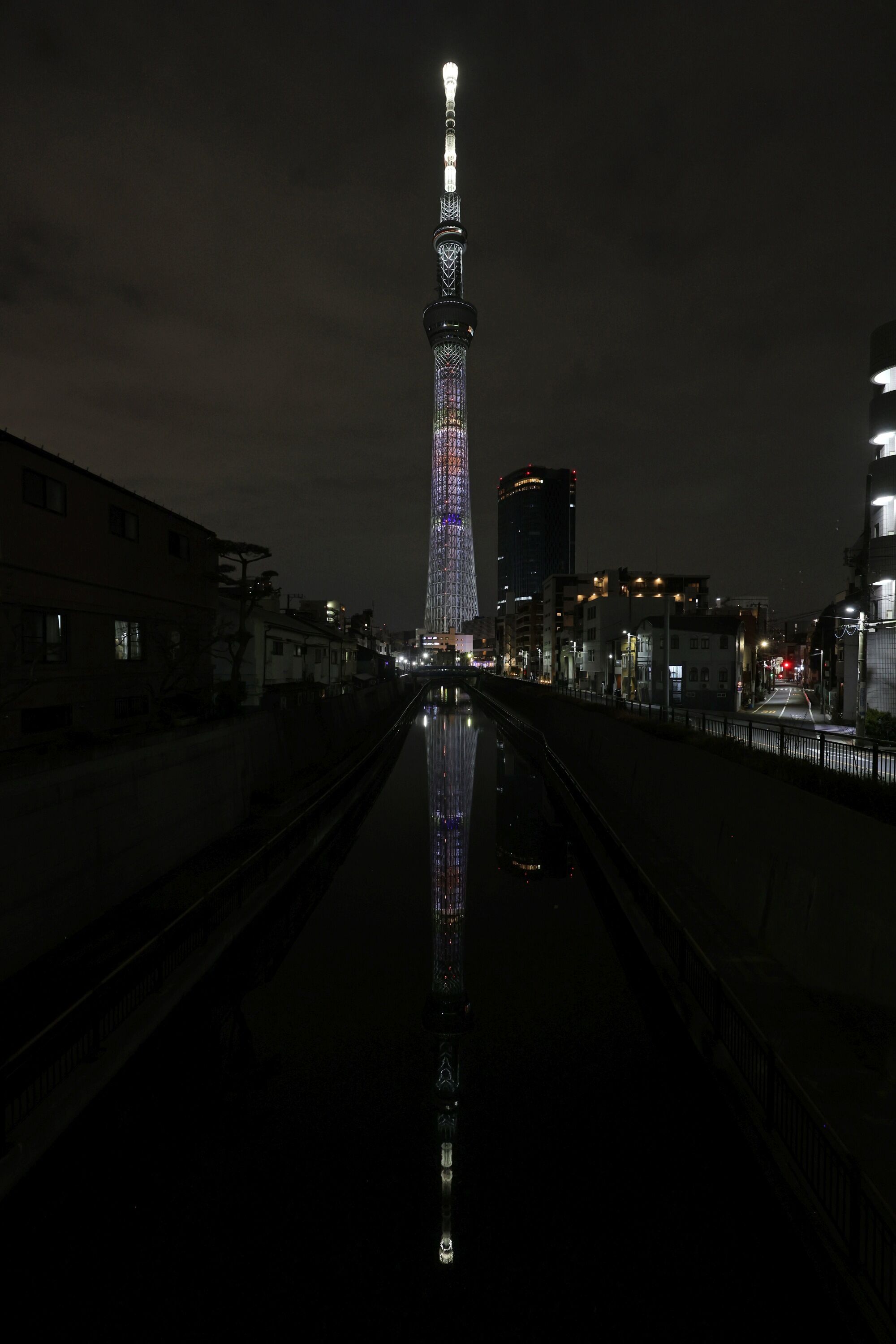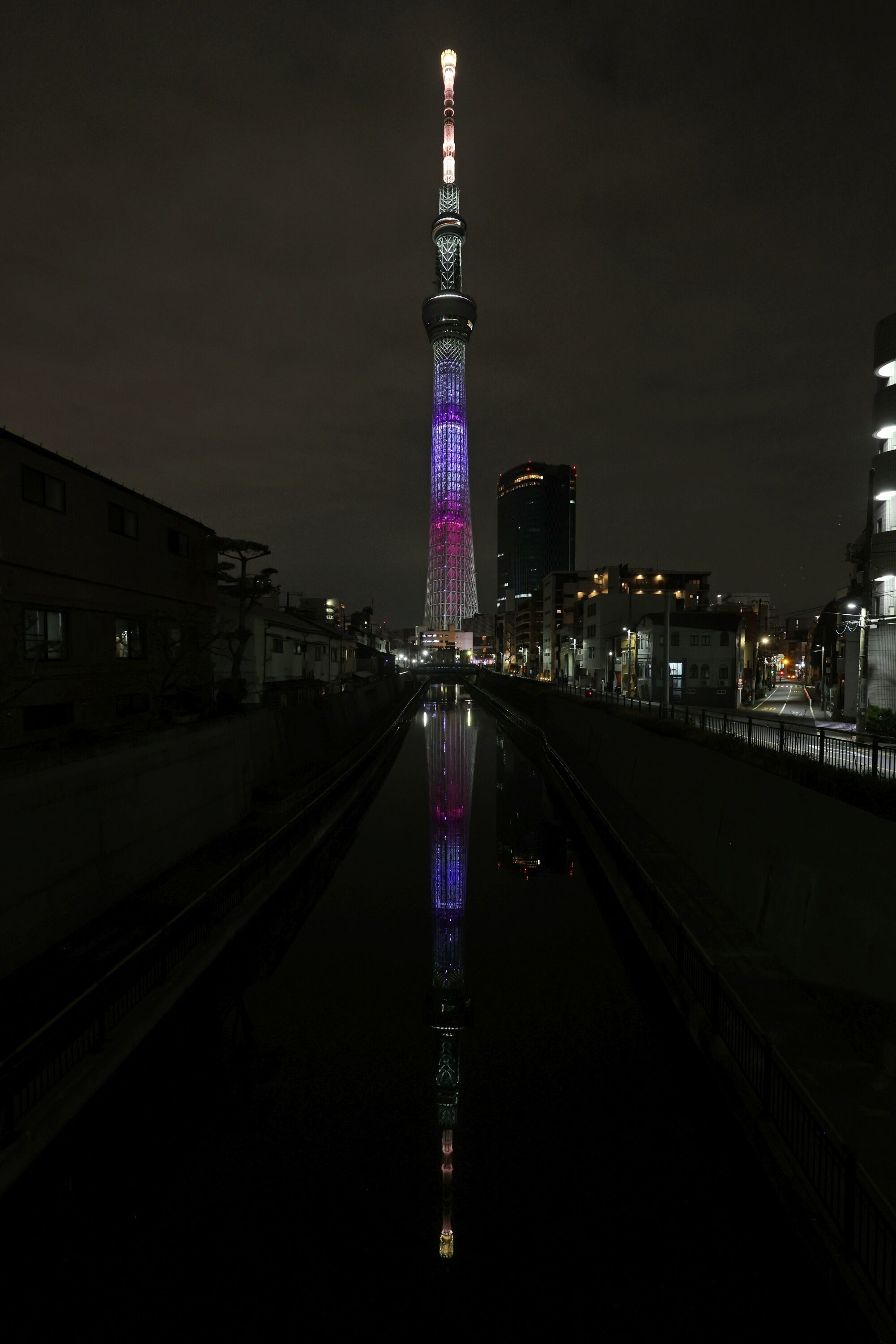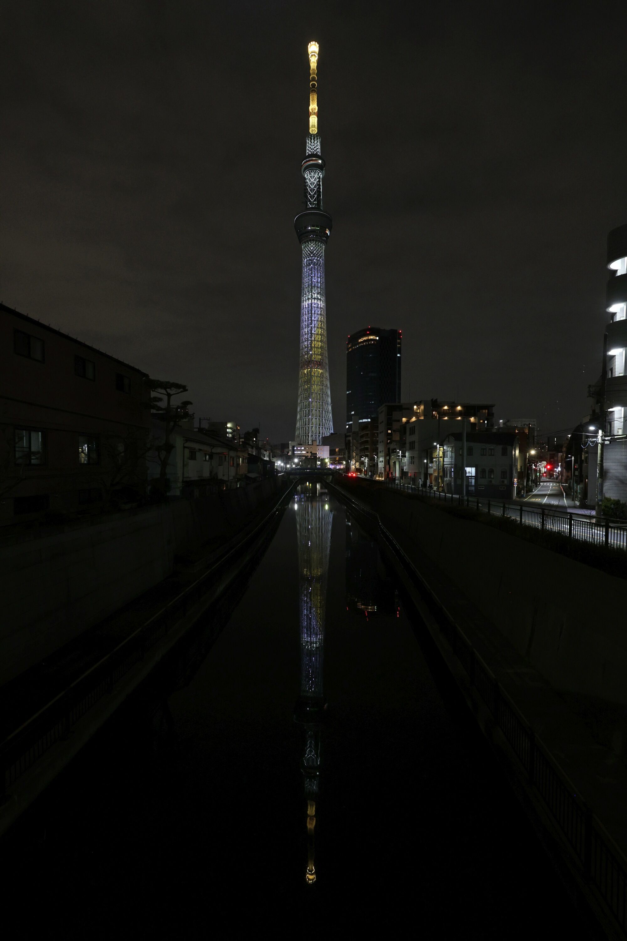 2024年2月24日に隅田川護岸から撮影した東京スカイツリー夜景です。この日のライティングは『原神×TOKYO SKYTREE 青空の大冒険 ~雷霊に導かれて~ 』の開催を記念した特別ライティングで、原神のキャラクターたちをイメージした8種類のライティングが点灯しました。