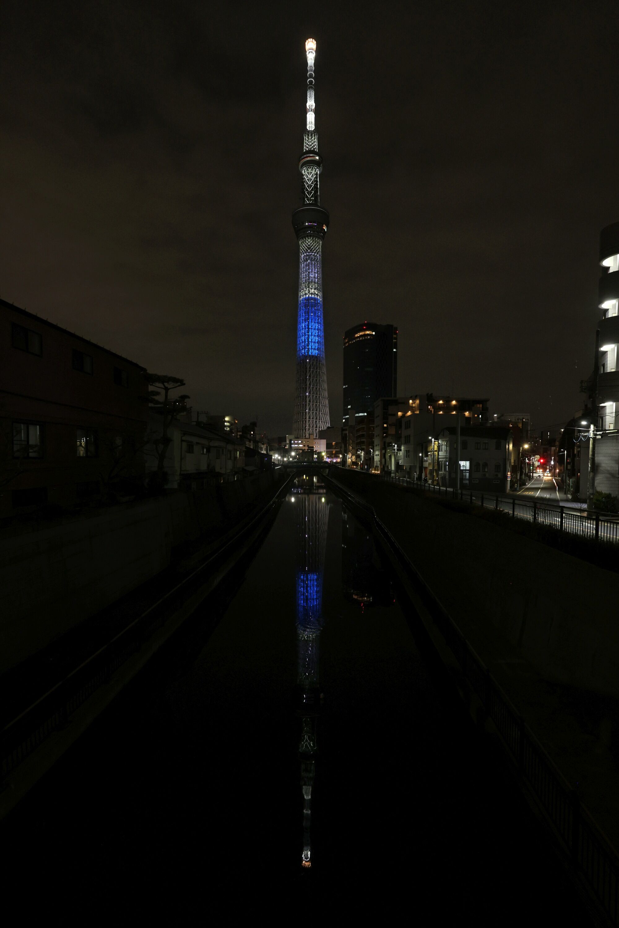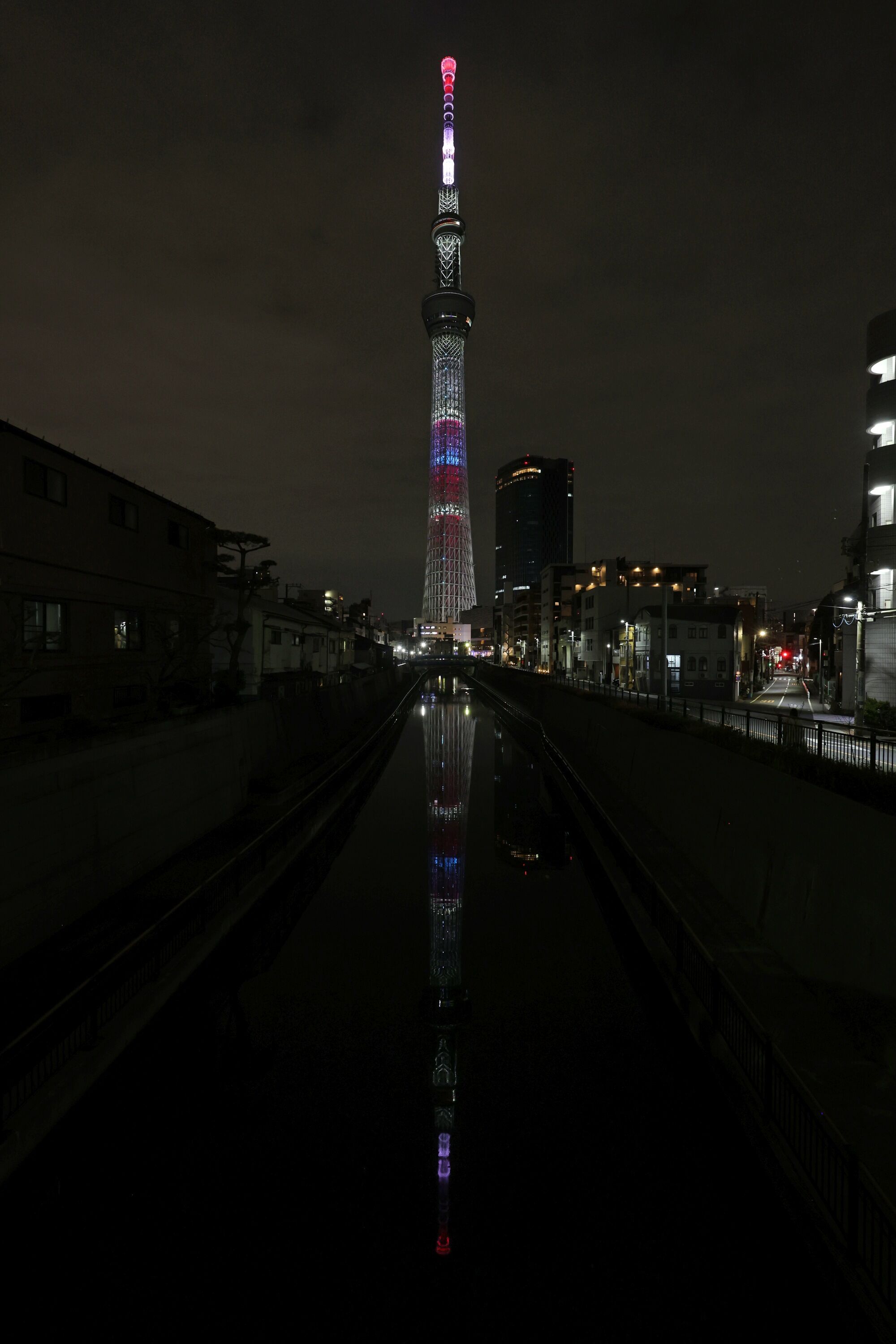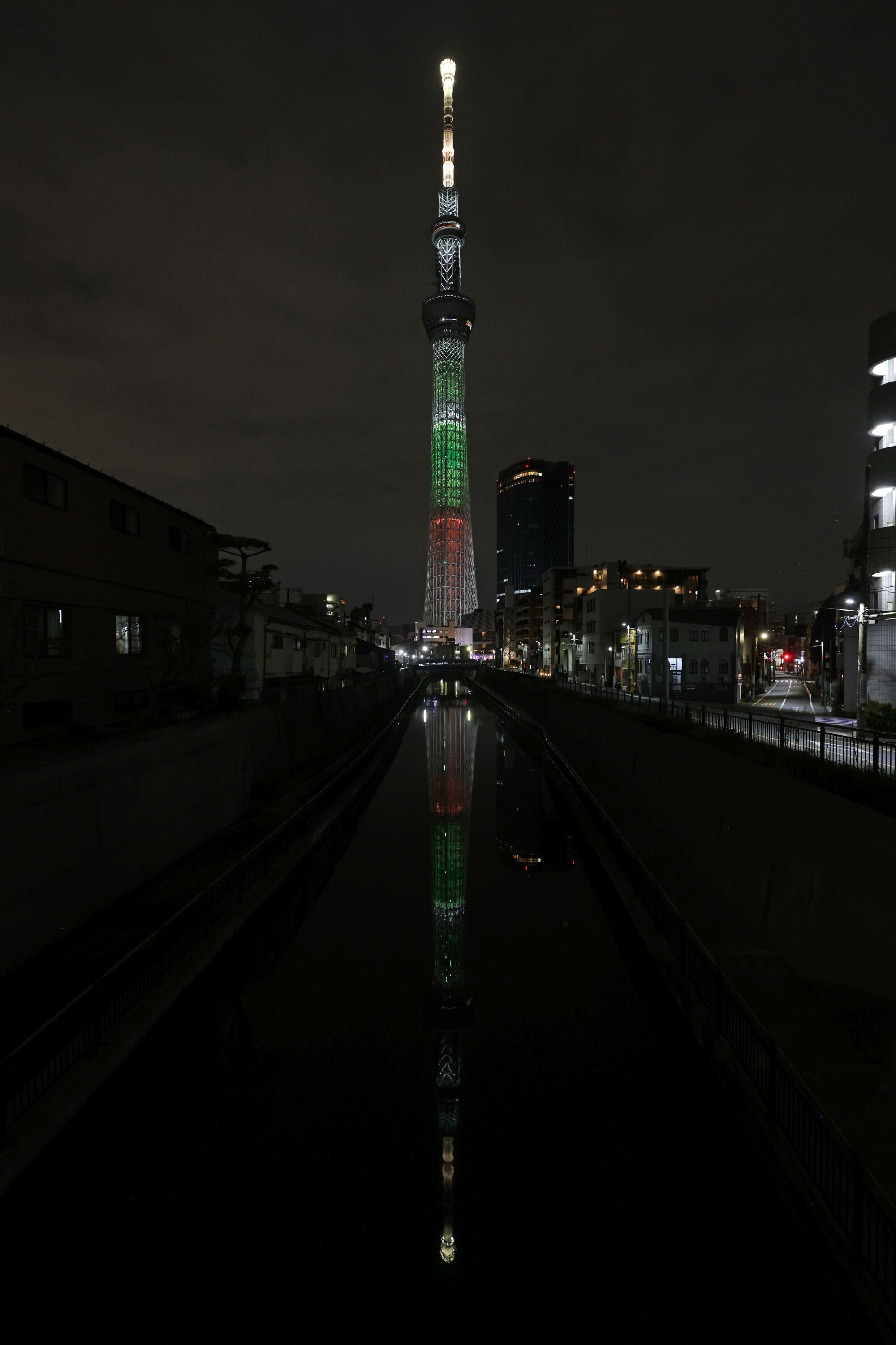 2024年2月24日に隅田川護岸から撮影した東京スカイツリー夜景です。この日のライティングは『原神×TOKYO SKYTREE 青空の大冒険 ~雷霊に導かれて~ 』の開催を記念した特別ライティングで、原神のキャラクターたちをイメージした8種類のライティングが点灯しました。