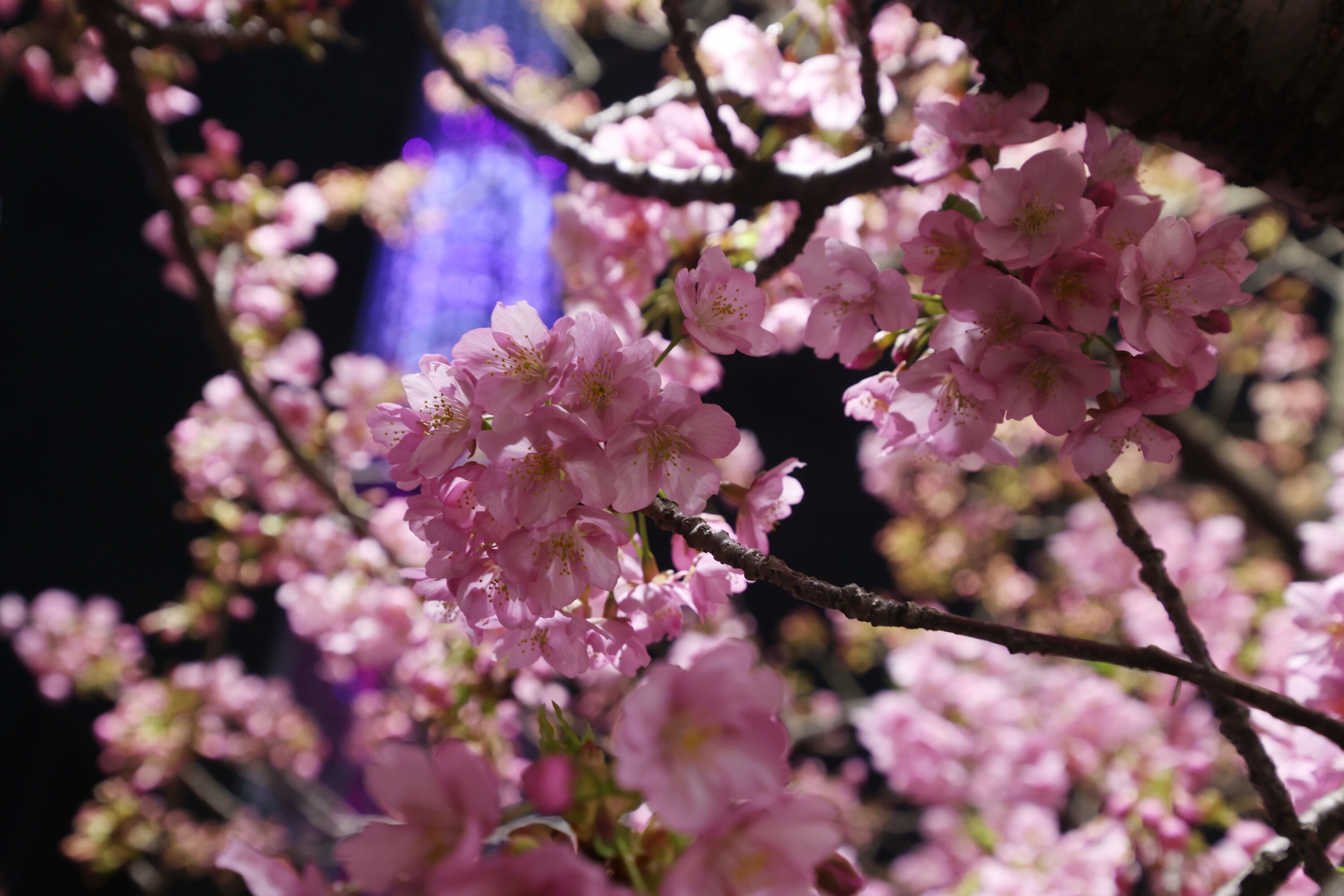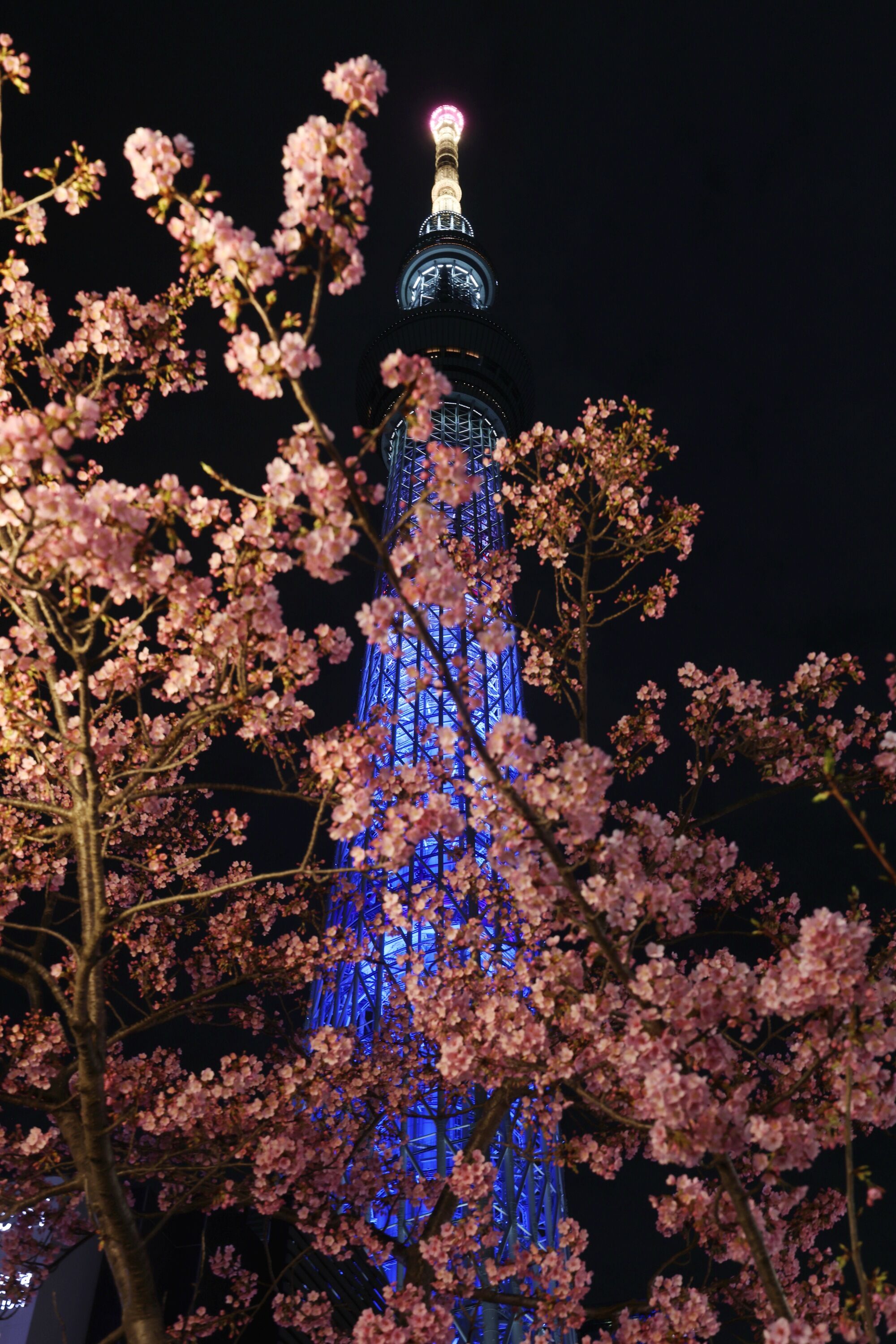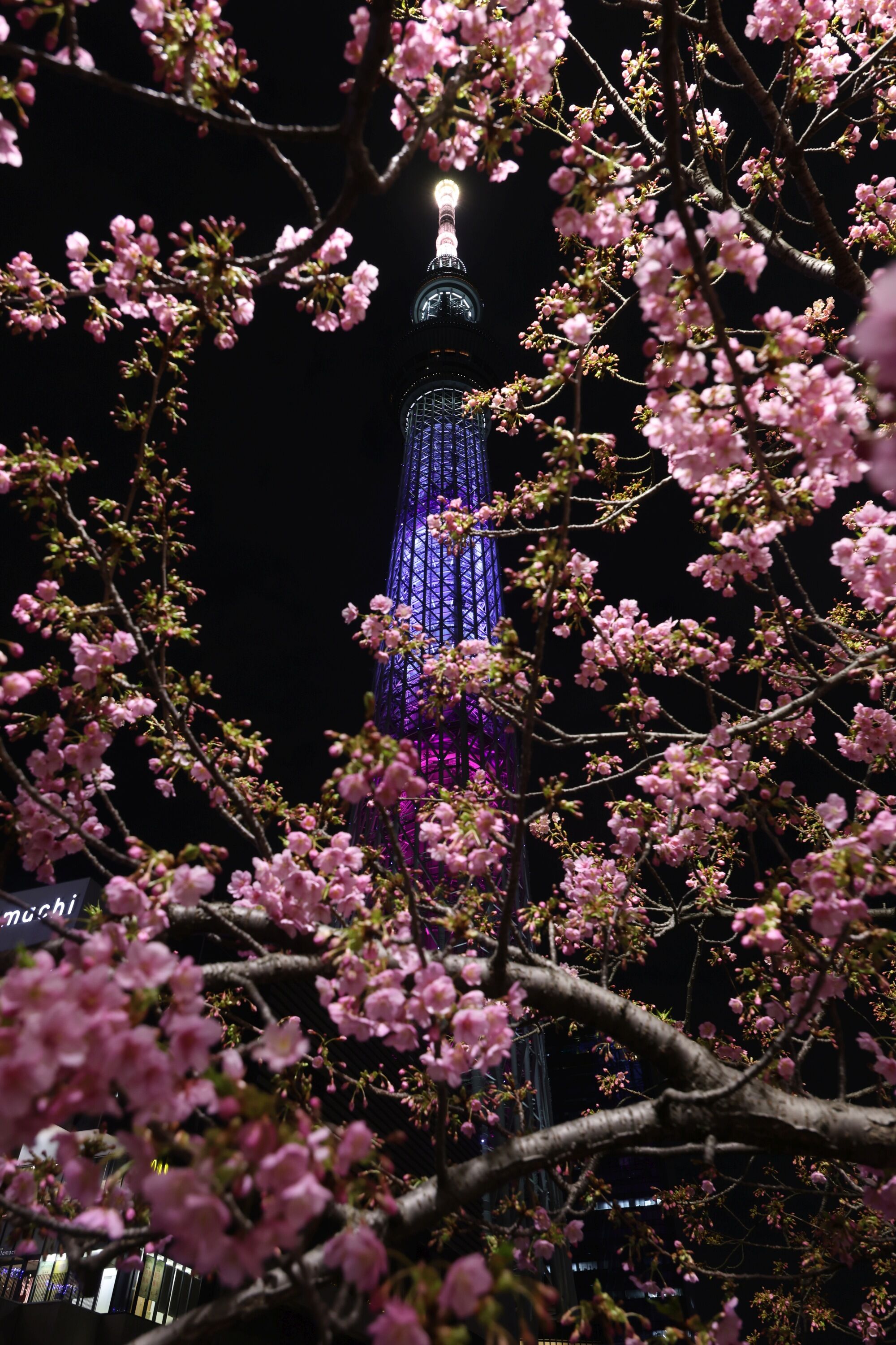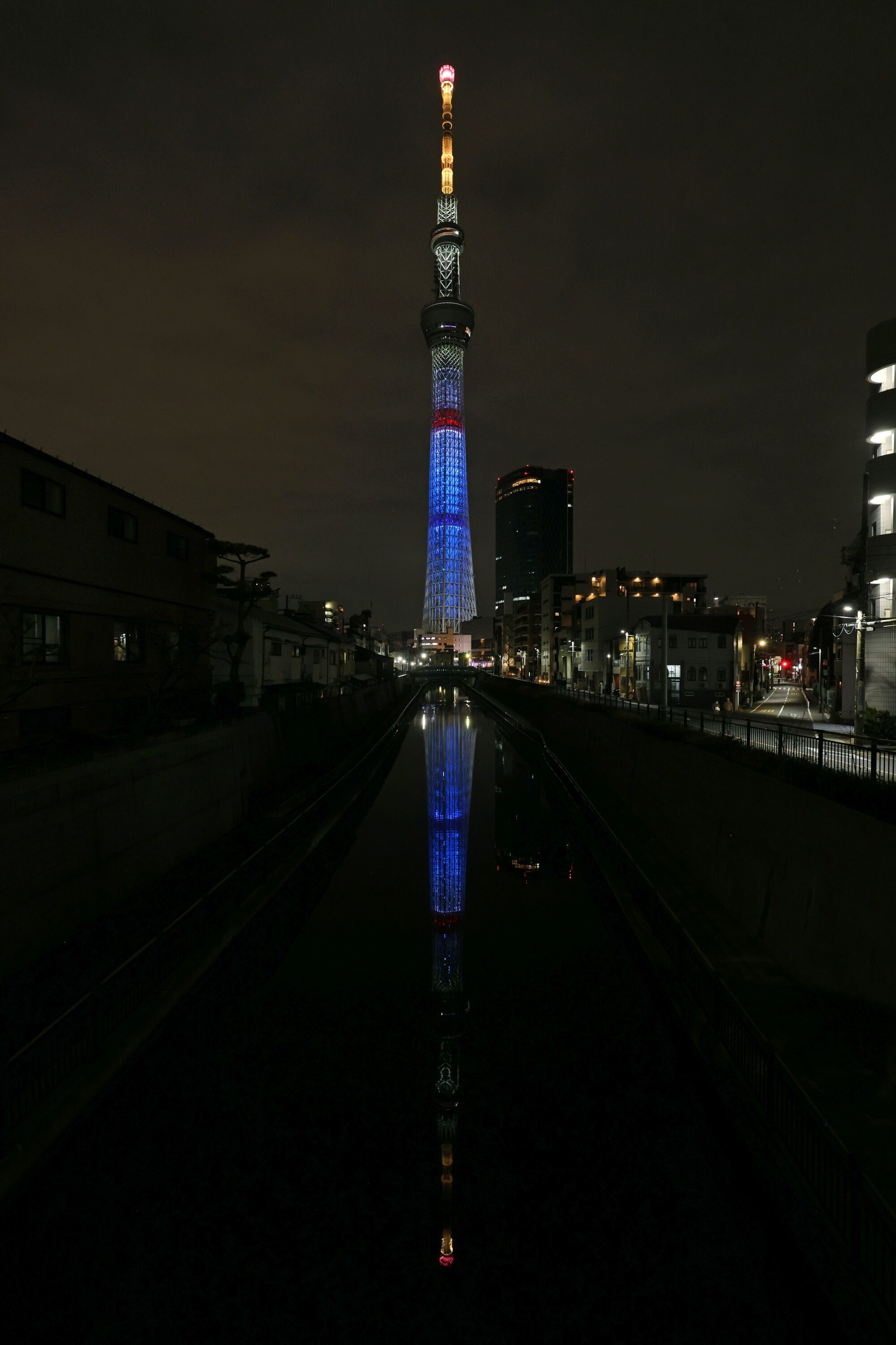 2024年2月24日に隅田川護岸から撮影した東京スカイツリー夜景です。この日のライティングは『原神×TOKYO SKYTREE 青空の大冒険 ~雷霊に導かれて~ 』の開催を記念した特別ライティングで、原神のキャラクターたちをイメージした8種類のライティングが点灯しました。