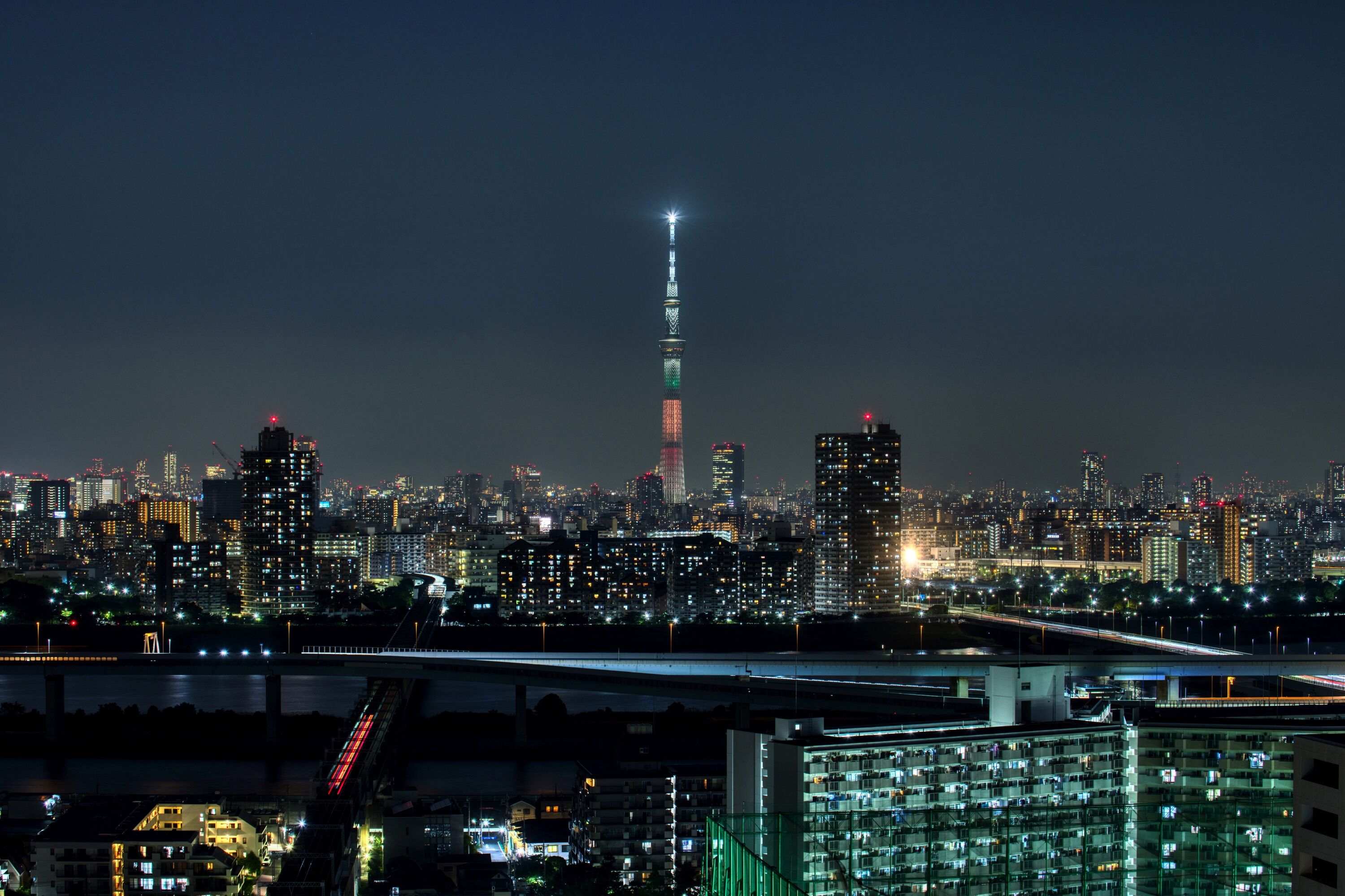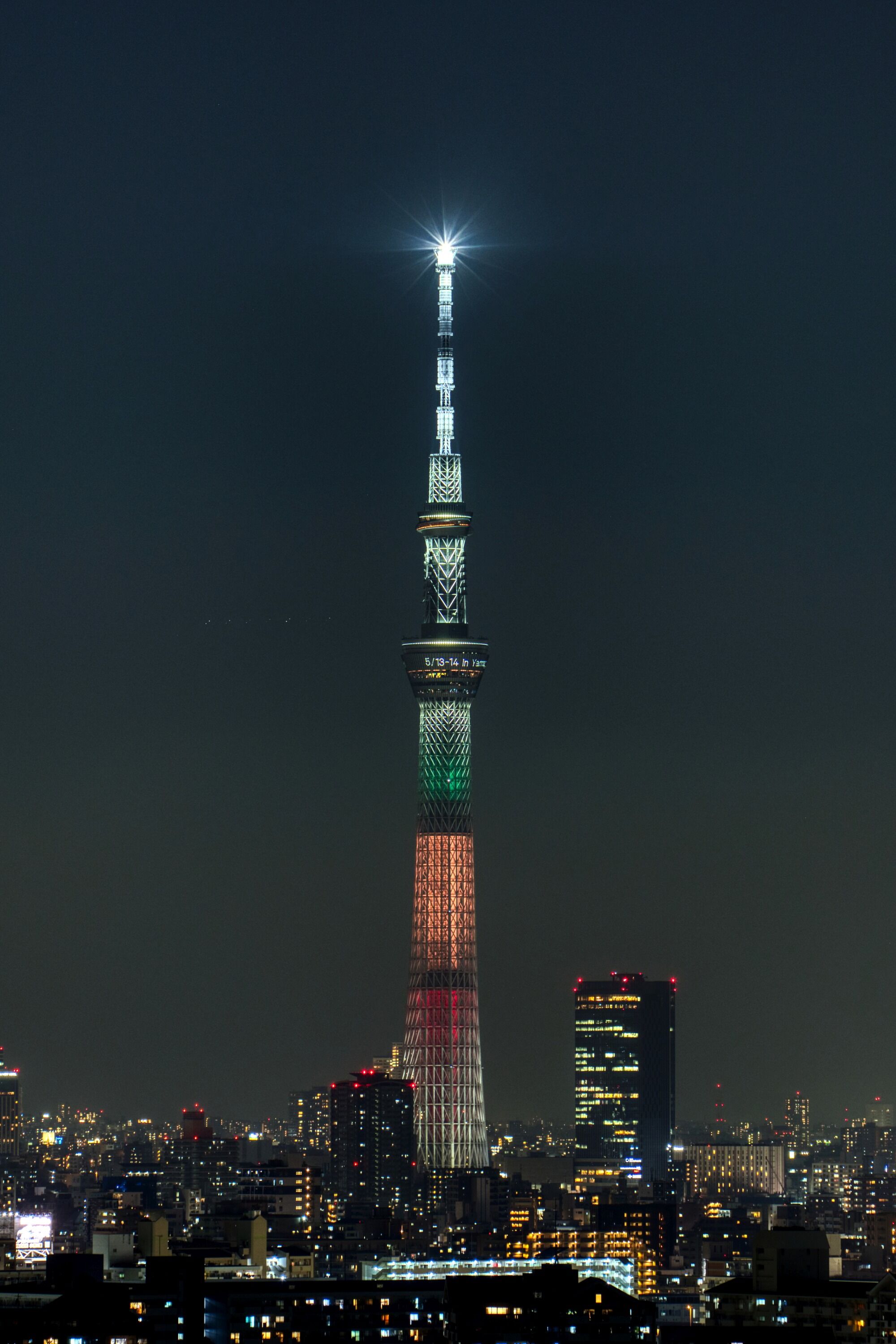 2021年5月14日、自宅マンションから撮影した東京スカイツリー夜景です。昨夜は「東京2020オリンピック聖火リレー」に伴い東京スカイツリーは聖火リレーが走行中の山口県をイメージした特別ライティングが点灯しました。同ライティングは山口県PR本部長「ちょるる」のイメージカラーである3色で、緑が「山口の自然」、オレンジが「山口のグルメ」、赤が「山口の歴史」を表現しています。